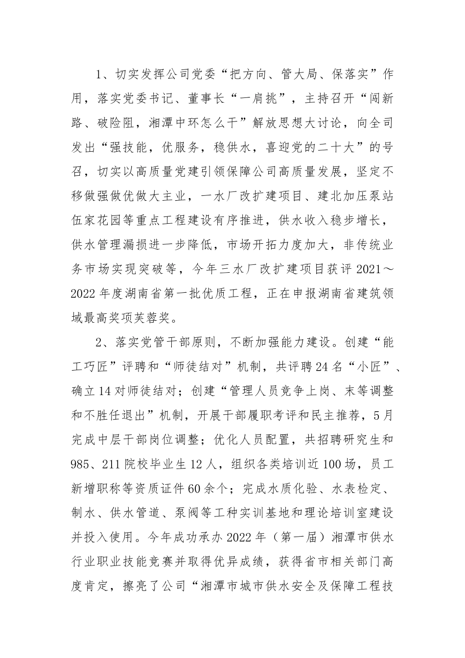 踔厉奋发、勇毅前行,以高质量党建引领保障公司高质量发展——在公司2023年度工作会议上的讲话同志们:刚刚走过的2022年,是具有重要里程碑意义、极不平凡的一年。这一年,党的二十大胜利召开,科学谋划了未来5年乃至更长时期党和国家事业发展的目标任务和大政方针,开启了以中国式现代化全面推进中华民族伟大复兴的新征程。这一年,在疫情防控形势严峻、大雪冰冻、旱情严重等考验下,公司始终坚持以习近平新时代中国特色社会主义思想为指导,坚持党建工作与生产经营深度融合,通过开展“建功新时代、喜迎二十大”、实施“红色传承党建铸魂”工程、“一活动一行动”、“一课一片一实践”等系列活动,基层支部堡垒和党员模范作用得到充分发挥,全司上下以“12345”工作模式践行“供水服务20条承诺”,把二十大精神的学习成果转化为干事创业的强大动力,取得了安全稳定优质供水、优化营商环境、服务“双碳”行动等好成绩。这些成绩的取得,离不开上级党委的正确领导,更离不开全体干部职工的努力拼搏和无私奉献,在此,我代表公司党委向大家表示衷心的感谢!在这辞旧迎新之际,公司召开一年一度的总结大会,目的就是要通过回顾总结2022年工作,在新的起点上谋划部署2023年工作。我今天讲话的题目是《踔厉奋发、勇毅前行,以高质量党建引领保障公司高质量发展》。一、过去一年我们所取得的成绩和工作亮点。(一)抓实政治建设,强化理想信念。把迎接学习宣传贯彻党的二十大精神作为全年工作主线,以高度的政治责任感和历史使命感带头谋划部署、组织实施、督促指导相关工作。全年召开党委(扩大)会议28次、中心组学习12次,党员干部政治理论学习200余次,微党课30余场,开展主题活动17次,听报告6次,实地研学2次,购买学习辅导资料18册,围绕“二十大”相关工作方案7个、宣传文章90余篇等,组织全体党员赴韶山开展“喜迎二十大,奋进新征程”主题活动,并讲《践行“为人民服务”宗旨,为党的二十大献礼》等现场党课,多措并举掀起迎接学习宣传贯彻热潮,切实引导公司党员干部深刻领悟“两个确立”的决定性意义,增强“四个意识”、坚定“四个自信”、做到“两个维护”,持续推动习近平新时代中国特色社会主义思想在全司大学习大普及大落实。(二)落实重点任务,推进双向融合。1、切实发挥公司党委“把方向、管大局、保落实”作用,落实党委书记、董事长“一肩挑”,主持召开“闯新路、破险阻,湘潭中环怎么干”解放思想大讨论,向全司发出“强技能,优服务,稳供水,喜迎党的二十大”的号召,切实以高质量党建引领保障公司高质量发展,坚定不移做强做优做大主业,一水厂改扩建项目、建北加压泵站伍家花园等重点工程建设有序推进,供水收入稳步增长,供水管理漏损进一步降低,市场开拓力度加大,非传统业务市场实现突破等,今年三水厂改扩建项目获评2021~2022年度湖南省第一批优质工程,正在申报湖南省建筑领域最高奖项芙蓉奖。2、落实党管干部原则,不断加强能力建设。创建“能工巧匠”评聘和“师徒结对”机制,共评聘24名“小匠”、确立14对师徒结对;创建“管理人员竞争上岗、末等调整和不胜任退出”机制,开展干部履职考评和民主推荐,5月完成中层干部岗位调整;优化人员配置,共招聘研究生和985、211院校毕业生12人,组织各类培训近100场,员工新增职称等资质证件60余个;完成水质化验、水表检定、制水、供水管道、泵阀等工种实训基地和理论培训室建设并投入使用。今年成功承办2022年(第一届)湘潭市供水行业职业技能竞赛并取得优异成绩,获得省市相关部门高度肯定,擦亮了公司“湘潭市城市供水安全及保障工程技术研究中心”招牌,并获“中国节能(湘潭)工匠学院”和“湖南省城乡建设行业协会供水分会职业技能培训基地”的授权授牌。3、坚持把党的领导贯穿科技创新工作全过程,强力推进“科技创新年”专项行动,修订完善公司《科技创新项目管理办法》、《科技创新项目经费管理办法》等制度,投入960万元,立项14个科技创新项目,22个五小创新项目,申请发明专利1项,投稿SCI/EI论文3篇,对接承担集团公司重大科技创新项目《智能水厂整体工艺方案》3个子课题等。在中节能第四...