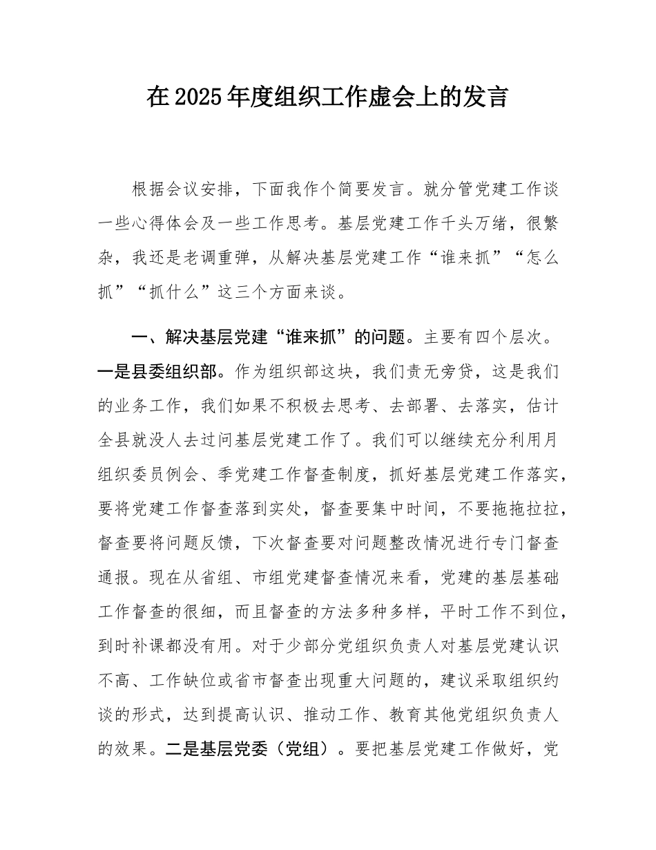 在2025年度组织工作虚会上的发言根据会议安排,下面我作个简要发言。就分管党建工作谈一些心得体会及一些工作思考。基层党建工作千头万绪,很繁杂,我还是老调重弹,从解决基层党建工作“谁来抓”“怎么抓”“抓什么”这三个方面来谈。一、解决基层党建“谁来抓”的问题。主要有四个层次。一是县委组织部。作为组织部这块,我们责无旁贷,这是我们的业务工作,我们如果不积极去思考、去部署、去落实,估计全县就没人去过问基层党建工作了。我们可以继续充分利用月组织委员例会、季党建工作督查制度,抓好基层党建工作落实,要将党建工作督查落到实处,督查要集中时间,不要拖拖拉拉,督查要将问题反馈,下次督查要对问题整改情况进行专门督查通报。现在从省组、市组党建督查情况来看,党建的基层基础工作督查的很细,而且督查的方法多种多样,平时工作不到位,到时补课都没有用。对于少部分党组织负责人对基层党建认识不高、工作缺位或省市督查出现重大问题的,建议采取组织约谈的形式,达到提高认识、推动工作、教育其他党组织负责人的效果。二是基层党委(党组)。要把基层党建工作做好,党委(党组)特别是党委这块是很重要。跟两个人努力,配合非常关键。一是党委书记,近年来,虽然我们工作抓得越来越紧,督查越来越严,但是感觉党委书记有点“油了皮”,感觉没做好也没什么,没受到什么损失。我们在提高党委书记认识上,还有很多文章要做,也是我们大家共同探讨的问题。二是组织委员。我们要引导组织委员热心本职工作。有个别组织委员做中心工作很热心,做党建存在丢三落四,不上心的问题,如果组织委员认识不到位,党建工作肯定上不去,就会存在问题。我们要加强对组织委员业务方面教育学习。基层党委主要是抓好党委本级和各基层党支部工作落实,组织委员要善于学习,要充分利用组织委员例会平台学习,把党建业务搞熟搞透,那工作落实才能做到精准到位。我们要引导组织委员做好上下协调工作。党建工作靠组织委员一个人来做,肯定做不了,组织委员善于借力用力,可以借助周一例会,干职工大会,对党建工作进行详细部署,可以借助局长、党委书记的力量进行部署推动,要扎实抓好党员发展教育管理、党建督查通报、党建工作述职评议、乡镇人才党支部等工作。三是基层党支部(总支)。主要就是严格按照县委组织部、上级党委的要求,扎实推进党支部标准化规范化建设,以党员固定活动日为抓手,稳步推进党纪学习教育常态化制度化,实现“三会一课”、组织生活会、民主评议党员、谈心谈话等制度更加有序;要积极开展“五必访,五必到”活动,健全关心关爱党员工作机制,切实解决困难党员和老党员的实际问题,切实体现党组织的温暖与关怀。四是普通党员。要充分发挥党员先锋模范作用,在推动发展上敢担当。广大党员干部应结合各行各业特点,在农村环境综合治理、建设社会主义新农村、脱贫攻坚、移风易俗、建设文明和谐社区、提高企业效益等方面,尽职尽责、作出表率,争创一流的工作业绩,以实际行动为群众做出榜样,团结带领群众打开工作新局面。二、解决基层党建“怎么抓”的问题。主要解决三个方面的问题。一是解决“两张皮”的问题。在各基层党组织中,党建工作与中心工作、业务工作“两张皮”的问题还不同程度存在,部分单位领导干部、党组织书记对党建工作不重视,认为没什么作用,觉得党建工作反而影响了中心工作、业务工作。这是我们所有从事基层党建工作的同志要思考和解决的问题。就党建工作如何与中心工作业务工作有机整合,我就谈几个具体事例,比如说在村里,可以将低保评定、环境整洁、新农村建设等与群众利益相关的事项放在党员固定活动日上讨论、公示,这就有两个好处,一方面能更好推进中心工作,做到公平公正,另一方面能更提高党员意识,党建工作与中心工作两融合、共促进。再比如说,在学校,也可以将评先评优、职称评定、学校大事等工作在党员大会上商讨决议通报,达到“两张皮”整合为“一盘棋”的成效。二是解决“一岗双责”的问题。部分基层党组织的党员干部“一岗双责”意识不强,总是想当然觉得组织工作就是组织委员的事情,跟其他的党委委员没关系,对党建...