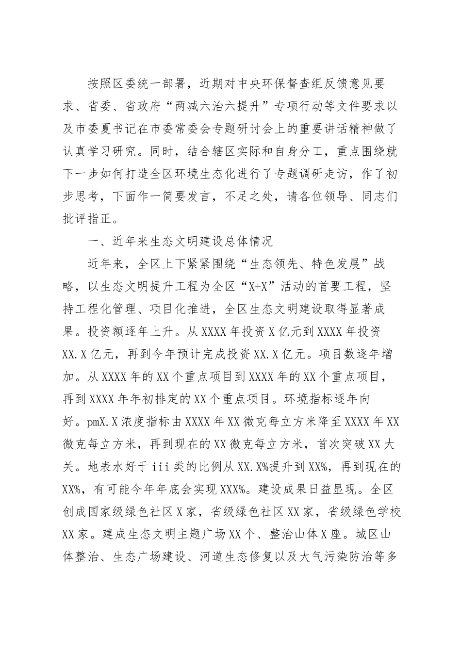 在领导干部务虚会上的发言讲稿按照区委统一部署,近期对中央环保督查组反馈意见要求、省委、省政府“两减六治六提升”专项行动等文件要求以及市委夏书记在市委常委会专题研讨会上的重要讲话精神做了认真学习研究。同时,结合辖区实际和自身分工,重点围绕就下一步如何打造全区环境生态化进行了专题调研走访,作了初步思考,下面作一简要发言,不足之处,请各位领导、同志们批评指正。一、近年来生态文明建设总体情况近年来,全区上下紧紧围绕“生态领先、特色发展”战略,以生态文明提升工程为全区“X+X”活动的首要工程,坚持工程化管理、项目化推进,全区生态文明建设取得显著成果。投资额逐年上升。从XXXX年投资X亿元到XXXX年投资XX.X亿元,再到今年预计完成投资XX.X亿元。项目数逐年增加。从XXXX年的XX个重点项目到XXXX年的XX个重点项目,再到XXXX年年初排定的XX个重点项目。环境指标逐年向好。pmX.X浓度指标由XXXX年XX微克每立方米降至XXXX年XX微克每立方米,再到现在的XX微克每立方米,首次突破XX大关。地表水好于iii类的比例从XX.X%提升到XX%,再到现在的XX%,有可能今年年底会实现XXX%。建设成果日益显现。全区创成国家级绿色社区X家,省级绿色社区XX家,省级绿色学校XX家。建成生态文明主题广场XX个、整治山体X座。城区山体整治、生态广场建设、河道生态修复以及大气污染防治等多个生态文明重点项目得到了省、市领导高度关注和认可,并进行专题调研和推广。同时,在XX晚报、XX日报、XX晚报、XX电视台等多个主流媒体宣传报道,辖区居民认可度、满意率逐年提升。二、当前环境生态化面临的压力和挑战从20XX年成绩来看,全区生态文明建设成效显著,但随着经济的快速发展、城市化进程不断加快以及群众日益增长的环境诉求,对照中央环保督查组最新要求以及省委、省政府在全省开展的“两减六治三提升”专项行动部署会议精神,全区的环境生态化建设将面临着巨大压力和挑战。一是区域环境矛盾日益突显。由于城市化进程的加快以及索普集团、新区化工区等原因,造成辖区餐饮油烟、化工气味等一系列环境问题,居民投诉反映始终呈现上升趋势,维稳和改善辖区环境质量压力巨大,尤其是城东片区和谏壁片区等重点区域;二是环保相关指标完成压力大。从20XX年省级对全区绿色发展评估成绩来看,全区绿色发展评估成绩全市垫底,这一问题主要由于全区经济结构偏重造成的,如何落实绿色gdp、解决辖区经济偏重问题是今后完成各类环境指标的重点、难点问题;三是生态文明体制机制建设亟待加强。对照新形势下生态文明建设的目标和要求,适应下一步生态文明建设的体制机制还存在着诸多不完善的环节,在科学考评、联动管理、政策激励、目标倒逼等方面均存在着一定的不完善。包括监管监督机制的不完善、行政执法能力的偏弱、生态理念的普及程度不高等等,三、大力推进环境生态化建设的对策和意见下一步如何推动省委省政府“两减六治三提升”专项行动方案的落实,推动京口环境生态化建设落地生根,简要提出以下几点意见和想法。(一)总体目标。依据京口现有发展基础和自然禀赋,将生态文明建设融入经济建设、政治建设、文化建设、社会建设各方面和全过程,最大程度形成节约资源和保护环境的空间格局、产业结构、生产方式、生活方式,努力将京口打造成为产业和城市科学共融、经济和生态和谐共生、创业和居住幸福共享的宜居宜业宜游的XX生态文明建设标志区。到2020年,地表水好于iii类水质比例超过XX%,国考、省考断面水质全部到达优iii类水质标准;pm2.5年均浓度较20XX年下降XX%,空气优良天数比例达到XX%以上;生活垃圾分类设施覆盖率达到XX%,生活垃圾无害化处理率达到XX%;城镇雨污分流管网实现全收集、全覆盖;挥发性有机物排放总量削减XX%以上。同时,辖区环境风险隐患得到有效防范和化解。综合辖区实际,具体到20XX年,全区地表水好于iii类水质比例要到达XX%,国考、省考断面水质全部到达iii类水质以上标准,pmX.X年均浓度下降X%以上,空气优良天数比例达到XX%以上,四项污染物减排指标全面完成市级下达指标,确保全区空气质量明显改善,水环境更加优美,城乡面貌显著提升,片区环境综合整治成效...