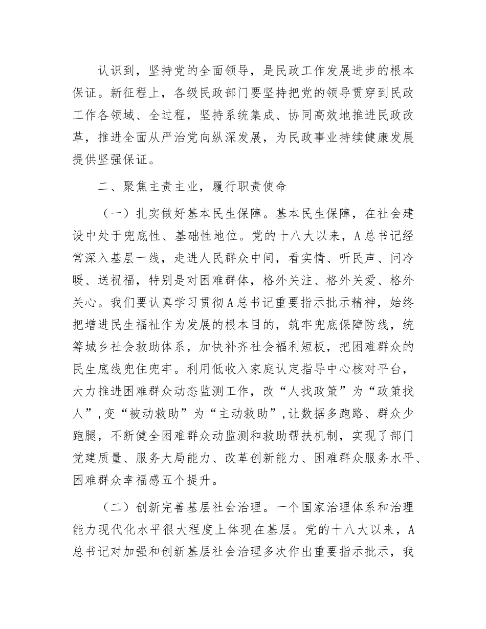 交流发言:坚持对标对表、聚焦主责主业,奋力实现民政事业高质量发展A总书记历来高度重视民政工作,作出一系列重要指示批示,为民政事业高质量发展提供了根本遵循,指明了奋斗方向,激发了工作动力。民政系统广大党员干部要认真学习领会、全面深入贯彻,不断提高理论素养和政治素质,深刻认识新时代民政工作政治定位,准确把握民政工作特点规律,增强拥护“两个确立”、做到“两个维护”的思想自觉、政治自觉和行动自觉,扎实推进新时代民政事业高质量发展。一、把握根本遵循,扛稳政治责任(一)深刻认识新时代民政工作的政治属性。民政工作关系民生、连着民心,这是对民政工作政治属性的生动阐述。民生是发展的根本目的,民心是最大的政治,改善民生是最大的政绩。民政工作说到底是做人的工作,人民对美好生活的向往既是全体民政人的奋斗目标,也是开展民政工作的出发点和落脚点。新征程上,民政系统广大党员干部要从为党赢得民心、巩固党的执政地位出发,坚持以人民为中心的发展思想,准确把握民政工作的政治属性,自觉做到“民政为民、民政爱民”,把赢得民心民意、汇集民智民力作为工作着力点,以强烈的使命感和责任感,把党和政府的温暖送到人民群众尤其是困难群众心坎上。(二)深刻认识新时代民政工作的全局定位。民政工作是社会建设的兜底性、基础性工作,这是对新时代民政工作的利学判断和精准定位。深入学习贯彻A总书记重要指示批示精神,是作出正确决策、科学开展工作的基本前提,要从人民群众最关心最直接最现实的利益问题入手采取针对性更强、覆盖面更大、作用更直接、效果更明显的举措,集中力量做好养老、育幼、助残、济困等兜底性、基础性民生建设。新征程上,全体民政人要自觉围绕中心、服务大局,从最困难的群体入手、最突出的问题着眼、最具体的工作抓起,夯实党执政的社会基础。(三)深刻认识新时代民政工作的职责使命。各级民政部门要聚焦脱贫攻坚,聚焦特殊群体,聚焦群众关切,更好履行基本民生保障、基层社会治理、基本社会服务等职责,这是新时代民政人的使命。强化特殊困难群体基本生活保障,着力提升基层社会治理水平,加强和改善基本社会服务,是加强和改善民生的重要组成部分。保障和改善民生没有终点站,只有连续不断的新起点。新征程上,全体民政人要准确把握民政职责使命的新内涵新要求,将民政工作同党中央重大决策部署对标对表,更好地为党和国家工作大局服务。(四)深刻认识新时代民政工作的引领保障。各级党委和政府要坚持以人民为中心,加强对民政工作的领导,增强基层民政服务能力,推动民政事业持续健康发展,这是新时代民政工作的引领保障。我们要从A总书记重要指示批示精神中充分认识到,坚持党的全面领导,是民政工作发展进步的根本保证。新征程上,各级民政部门要坚持把党的领导贯穿到民政工作各领域、全过程,坚持系统集成、协同高效地推进民政改革,推进全面从严治党向纵深发展,为民政事业持续健康发展提供坚强保证。二、聚焦主责主业,履行职责使命(一)扎实做好基本民生保障。基本民生保障,在社会建设中处于兜底性、基础性地位。党的十八大以来,A总书记经常深入基层一线,走进人民群众中间,看实情、听民声、问冷暖、送祝福,特别是对困难群体,格外关注、格外关爱、格外关心。我们要认真学习贯彻A总书记重要指示批示精神,始终把增进民生福祉作为发展的根本目的,筑牢兜底保障防线,统筹城乡社会救助体系,加快补齐社会福利短板,把困难群众的民生底线兜住兜牢。利用低收入家庭认定指导中心核对平台,大力推进困难群众动态监测工作,改“人找政策”为“政策找人”,变“被动救助”为“主动救助”,让数据多跑路、群众少跑腿,不断健全困难群众动监测和救助帮扶机制,实现了部门党建质量、服务大局能力、改革创新能力、困难群众服务水平、困难群众幸福感五个提升。(二)创新完善基层社会治理。一个国家治理体系和治理能力现代化水平很大程度上体现在基层。党的十八大以来,A总书记对加强和创新基层社会治理多次作出重要指示批示,我们要认真学习贯彻,坚持为人民服务的根本宗旨,持续加强党对基层政权的领导,抓好社区服务能...