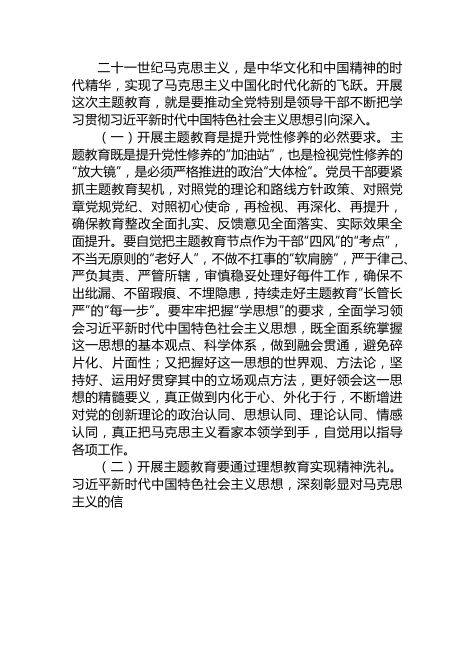 专题党课:把握主题教育总体要求找到党员干部新坐标将学习成果贯彻到具体工作当中从今年4月份起,将在全党开展的新时代中国特色社会主义思想主题教育,这是继“不忘初心牢记使命”主题教育后的又一次思想锤炼和灵魂洗礼。开展主题教育,是正本清源、固本培元的必要手段,是筑牢思想根基,补足精神之钙的必经之路。我们要深刻理解、牢牢把握专题教育总要求,以此次主题教育为契机,汲取不懈奋斗的源泉动力,增强学思践悟的政治智慧,筑牢拒腐防变的堤坝防线。要坚持将主题教育同推动中心工作相结合,牢固树立科学的世界观和方法论,不断强化创新理论运用和调研成果转化把落实主题教育目标和解决重点核心问题抓到实处、取得实效,推动主题教育扎实开展,努力取得实实在在的成效。一、牢牢把握主题教育的总要求,用党的创新理论统一思想、统一意志、统一行动,汇聚起奋进新征程、建功新时代的磅礴力量党的理论创新每前进一步,理论武装就要跟进一步。坚持用马克思主义中国化时代化最新成果武装全党、指导实践、推动工作,是我们党创造历史、成就辉煌的一条重要经验。习近平新时代中国特色社会主义思想是当代中国马克思主义、二十一世纪马克思主义,是中华文化和中国精神的时代精华,实现了马克思主义中国化时代化新的飞跃。开展这次主题教育,就是要推动全党特别是领导干部不断把学习贯彻习近平新时代中国特色社会主义思想引向深入。(一)开展主题教育是提升党性修养的必然要求。主题教育既是提升党性修养的“加油站”,也是检视党性修养的“放大镜”,是必须严格推进的政治“大体检”。党员干部要紧抓主题教育契机,对照党的理论和路线方针政策、对照党章党规党纪、对照初心使命,再检视、再深化、再提升,确保教育整改全面扎实、反馈意见全面落实、实际效果全面提升。要自觉把主题教育节点作为干部“四风”的“考点”,不当无原则的“老好人”,不做不扛事的“软肩膀”,严于律己、严负其责、严管所辖,审慎稳妥处理好每件工作,确保不出纰漏、不留瑕疵、不埋隐患,持续走好主题教育“长管长严”的“每一步”。要牢牢把握“学思想”的要求,全面学习领会习近平新时代中国特色社会主义思想,既全面系统掌握这一思想的基本观点、科学体系,做到融会贯通,避免碎片化、片面性;又把握好这一思想的世界观、方法论,坚持好、运用好贯穿其中的立场观点方法,更好领会这一思想的精髓要义,真正做到内化于心、外化于行,不断增进对党的创新理论的政治认同、思想认同、理论认同、情感认同,真正把马克思主义看家本领学到手,自觉用以指导各项工作。(二)开展主题教育要通过理想教育实现精神洗礼。习近平新时代中国特色社会主义思想,深刻彰显对马克思主义的信仰,对社会主义、共产主义的信念,集中反映了当代中国共产党人的政治品格、价值追求、精神风范,是新时代中国共产党的思想和精神旗帜。这次主题教育要牢牢把握“强党性”的要求,自觉用习近平新时代中国特色社会主义思想改造主观世界,不断筑牢信仰之基、补足精神之钙、把稳思想之舵。广大党员干部要主动把自己的思想摆进去深刻领会党的创新理论关于坚定理想信念、提升思想境界加强党性锻炼等一系列要求,包括不忘初心、牢记使命,胸怀“国之大者”,提高政治判断力、政治领悟力、政治执行力,“三严三实”,忠诚干净担当,为民务实清廉等等,始终保持共产党人的政治本色。要更加自觉深刻领悟“两个确立”的决定性意义,增强“四个意识”、坚定“四个自信”、做到“两个维护”,在思想上政治上行动上同以习近平同志为核心的党中央保持高度一致。(三)开展主题教育要将理论成果转化为实践应用。习近平新时代中国特色社会主义思想是实践的理论,这一思想扎根现实土壤、回应实践需求,从理论和实践的结合上深入回答关系党和国家事业发展、党治国理政的一系列重大时代课题,是党和人民奋进新征程的行动指南。这次主题教育要牢牢把握“重实践”的要求,自觉践行习近平新时代中国特色社会主义思想,用以改造客观世界、推动事业发展。广大党员干部要坚持知行合一、真抓实干,把习近平新时代中国特色社会主义思想运用到贯彻落实党的二十大...