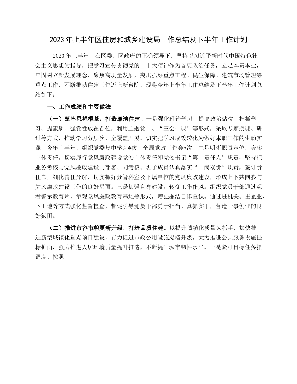 2023年上半年区住房和城乡建设局工作总结及下半年工作计划2023年上半年,在区委、区政府的正确领导下,坚持以习近平新时代中国特色社会主义思想为指导,把学习宣传贯彻党的二十大精神作为首要政治任务,立足本责本业,牢固树立新发展理念,聚焦高质量发展,突出抓好重点工程、民生保障、建筑市场管理等重点工作,不断推动住建工作迈上新台阶。现将今年上半年工作总结及下半年工作计划总结如下:一、工作成绩和主要做法(一)筑牢思想根基,打造廉洁住建。一是强化理论学习,提高政治站位。把抓学习、提素质、强党性放在首位,利用主题党日、“三会一课”等形式,采取专家授课、研讨等方式,推动学习分层次、全覆盖开展,切实把学习成效转化为做好本职工作的生动实践。今年上半年,组织党委集中学习*次,全局党政工作会*次。二是明晰职责定位,夯实主体责任。切实履行党风廉政建设党委主体责任和党委书记“第一责任人”职责,坚持把业务考核与党风廉政建设同部署、同考核。班子成员认真落实“一岗双责”职责,签订责任书,细化责任分解,切实抓好分管科室及下属单位的党风廉政建设,形成上下共同参与党风廉政建设工作的良好局面。三是加强自身建设,转变工作作风。组织党员干部通过观看警示教育片、参观党风廉政教育基地等形式,增强廉洁自律意识。通过进机关、进企业、下工地等方式强化监督检查,督促引导党员干部勇于担当、真抓实干,营造干事创业的良好氛围。(二)推进市容市貌更新升级,打造品质住建。以提升城镇化质量为抓手,加快推进新型城镇化重点项目建设,有力促进市政公用设施提档升级,大力推进公共服务设施提标扩面,强力推进人居环境质量提升打造,不断提升城市韧性水平。一是紧盯目标任务抓调度。按照“工作项目化、项目清单化、清单责任化”的方式,对标目标、突出重点、结合实际,精心谋划全年工作,细化工作任务和措施,确保各项工作有力有序、精准高效推进。重点对已开工建设项目逐项分析进展情况、影响进度的原因等,对各参建单位提出了明确工期时限,要求倒排工期,挂图作战,优化施工工序,尽快将项目完工。二是紧盯要素保障优服务。常态化开展驻企服务,建立落实重点项目落地建设和招商引资项目推进保障机制,全面实行在线并联审批、信用承诺、告知备案、容缺受理和工业项目“拿地即开工”模式。同时,对照重点建设项目推进计划,紧盯正在办理前期手续的重点项目,协调相关部门采取帮办、代办等方式,着力解决影响项目建设的征地拆迁、劳务用工、建材供应、资金短缺等困难问题,为项目建设提供全周期保姆式服务,确保项目早建成、早投用、早发挥效益。三是紧盯政策机遇多争取。及时研究对接国家和省市产业政策和投资导向,建立项目申报协调工作机制,对前期谋划申报的城市更新补短板等债券项目,继续加大向上沟通对接力度,争取更多的项目资金下达我县。对已下达的城市更新等补助资金,加快开展开工前期准备,确保按照既定的推进计划,完成建设任务,发挥资金使用效益。(三)加快民生项目建设,打造民生住建。坚持项目为王,以“民生幸福”为标杆,加强调度,多措并举,加快推进民生项目的建设进度,进一步完善基础设施建设,提升城市功能,为群众创造更加优美宜居的生活环境。一是明确责任,落实任务。围绕2023年确定的城市道路基础设施完善提升、城乡污水处理,供暖工程等民生工程目标任务,建立项目建设责任追究制度,细化任务、责任到人,日汇报、周调度,统筹安排,全力推进项目建设。二是及时协调,加快建设。对已开工的项目,紧抓项目施工的黄金季节,集中时间、集中力量,督促施工单位加大资金、设备和人员的投入,在保证工程质量的前提下,赶工期、抢进度。三是规范管理,确保质量。全面规范项目建设程序、严格落实项目企业责任制和工程质量监管机制。加强民生项目建设日常监管,狠抓安全措施落实,严把工程质量验收关。今年上半年,新建停车场*处,*新增停车泊位*个;住房保障资格审核*件次,为*户困难家庭配租公租房;筹集保障性租赁住房项目*个房源*套。(四)优化流程提高效率,打造服务住建。提升服务效能。明确部门和专人负责,健全办理建...