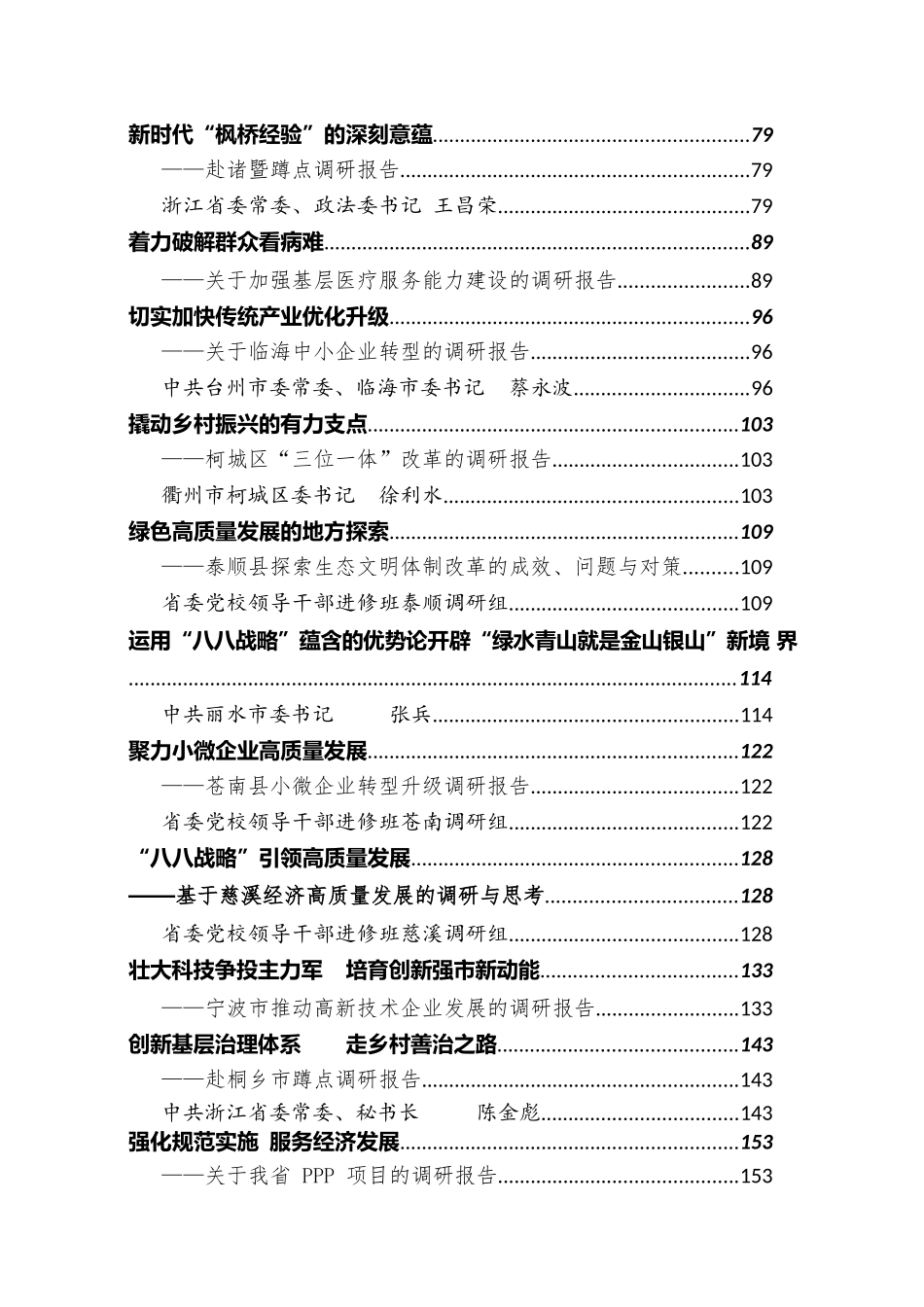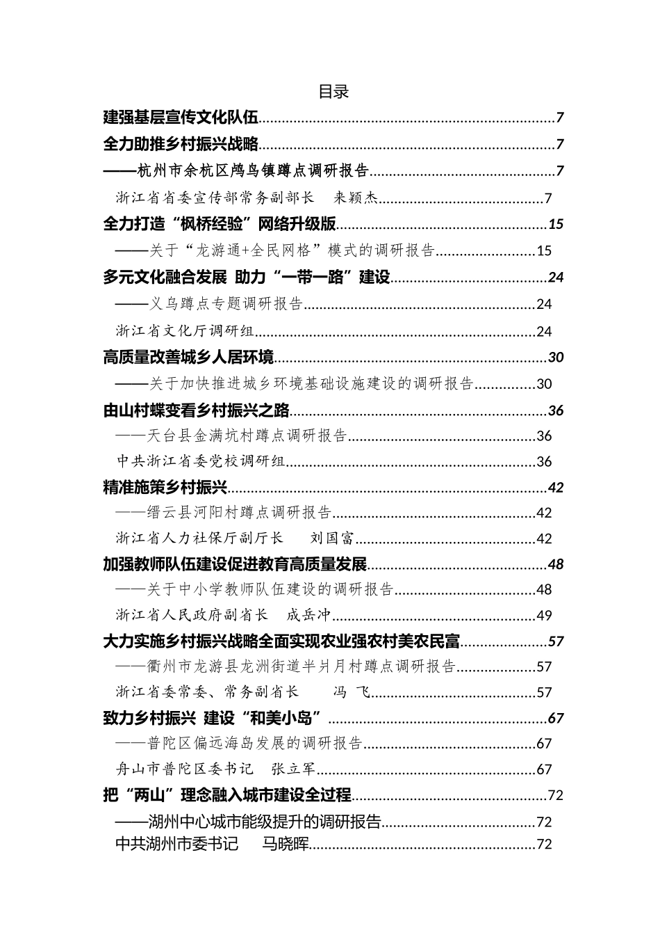公文派汇编系列119(50篇)主题教育领导干部基层调研报告汇编目录建强基层宣传文化队伍............................................................................7全力助推乡村振兴战略............................................................................7——杭州市余杭区鸬鸟镇蹲点调研报告................................................7浙江省省委宣传部常务副部长来颖杰..........................................7全力打造“枫桥经验”网络升级版......................................................15——关于“龙游通+全民网格”模式的调研报告.........................15多元文化融合发展助力“一带一路”建设........................................24——义乌蹲点专题调研报告...........................................................24浙江省文化厅调研组........................................................................24高质量改善城乡人居环境......................................................................30——关于加快推进城乡环境基础设施建设的调研报告...............30由山村蝶变看乡村振兴之路..................................................................36——天台县金满坑村蹲点调研报告................................................36中共浙江省委党校调研组................................................................36精准施策乡村振兴..................................................................................42——缙云县河阳村蹲点调研报告....................................................42浙江省人力社保厅副厅长刘国富..............................................42加强教师队伍建设促进教育高质量发展..............................................48——关于中小学教师队伍建设的调研报告....................................48浙江省人民政府副省长成岳冲....................................................49大力实施乡村振兴战略全面实现农业强农村美农民富......................57——衢州市龙游县龙洲街道半爿月村蹲点调研报告....................57浙江省委常委、常务副省长冯飞..........................................57致力乡村振兴建设“和美小岛”........................................................67——普陀区偏远海岛发展的调研报告............................................67舟山市普陀区委书记张立军........................................................67把“两山”理念融入城市建设全过程..................................................72——湖州中心城市能级提升的调研报告.......................................72中共湖州市委书记马晓晖..........................................................72新时代“枫桥经验”的深刻意蕴..........................................................79——赴诸暨蹲点调研报告................................................................79浙江省委常委、政法委书记王昌荣..............................................79着力破解群众看病难..............................................................................89——关于加强基层医疗服务能力建设的调研报告........................89切实加快传统产业优化升级..................................................................96——关于临海中小企业转型的调研报告........................................96中共台州市委常委、临海市委书记蔡永波................................96撬动乡村振兴的有力支点....................................................................103——柯城区“三位一体”改革的调研报告..................................103衢州市柯城区委书记徐利水.........................................................