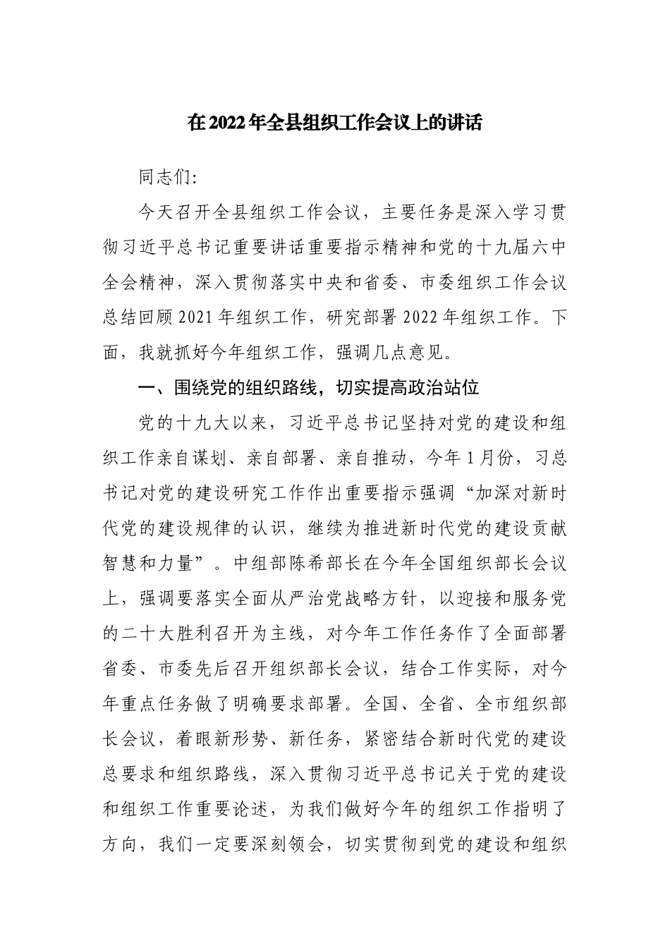 在2022年全县组织工作会议上的讲话同志们:今天召开全县组织工作会议,主要任务是深入学习贯彻习近平总书记重要讲话重要指示精神和党的十九届六中全会精神,深入贯彻落实中央和省委、市委组织工作会议总结回顾2021年组织工作,研究部署2022年组织工作。下面,我就抓好今年组织工作,强调几点意见。一、围绕党的组织路线,切实提高政治站位党的十九大以来,习近平总书记坚持对党的建设和组织工作亲自谋划、亲自部署、亲自推动,今年1月份,习总书记对党的建设研究工作作出重要指示强调“加深对新时代党的建设规律的认识,继续为推进新时代党的建设贡献智慧和力量”。中组部陈希部长在今年全国组织部长会议上,强调要落实全面从严治党战略方针,以迎接和服务党的二十大胜利召开为主线,对今年工作任务作了全面部署省委、市委先后召开组织部长会议,结合工作实际,对今年重点任务做了明确要求部署。全国、全省、全市组织部长会议,着眼新形势、新任务,紧密结合新时代党的建设总要求和组织路线,深入贯彻习近平总书记关于党的建设和组织工作重要论述,为我们做好今年的组织工作指明了方向,我们一定要深刻领会,切实贯彻到党的建设和组织工作中去。党的十九大以来,全县组织工作深入践行新时代党的建设总要求和新时代党的组织路线,围绕中心、积极作为改革创新、狠抓落实,各项工作取得了新进展新成效,主要体现在四个方面:一是政治建设持续加强。坚持把学习贯彻习近平新时代中国特色社会主义思想和党的十九届六中全会精神作为首要的政治任务,结合党史学习教育,举办了x期党史学习教育专题培训班、学习党的十九届六中全会精神专题培训班,x多场次。健全完善党内政治生活制度,研究制定党支部标准化建设、达标创星等系列文件,对“三会一课”召开次数、内容、会议记录等x项内容进行量化,创新“政治生日”“微党课”等党组织活动载体。二是服务中心大局持续加强。坚持完善并落实关心关爱基层干部、激励干部新时代新担当新作为、容错纠错等措施办法,探索完善干部考核评价机制,在x个乡镇(街道)开展蹲点调研,深化开展一线跟踪考察,先后选派干部x多人次参与乡村振兴、项目建设、招商引资等x个重点项目、x个重点工作,在一线跟踪考察中提拔重用表现优秀干部x名、宣传表扬x名,发现储备x名县管后备干部,择优选拔x名事业干部进入乡镇领导班子,有效提振干事创业精气神。启动“x智回归”工程,推进科技特派员制度,努力为高质量发展集聚各方面优秀人才。共有x人入选省工科类青年专业人才、x人入选市“x人才”,x人获评市特支人才、x人获评市乡土人才。三是重点任务持续稳步推进。全面完成全县x个村(社区)换届选举工作,所有村(社区)实现“一肩挑”开展村级集体经济行动计划,因地制宜发展村财措施,全面消除村财“空壳村”,收入x万元以上的村达x%,x万元以上的达x%。实施“党建精品培育提升”计划,培育提升x、x、x等不同主题的党建精品示范点,着力打造特色党建示范带。推进市级城市基层党建试点县建设工作,建立驻地单位、街道、社区三级联动机制,全面推行社区“大党委”、网格化管理和“一站式”服务,不断引领城市基层有效治理。四是短板弱项持续补齐。制定村干部队伍建设管理办法,推行村干部坐班值班,整顿软弱涣散党组织x个,投入资金x元完成新建或修缮村级阵地x个。定期开展乡村干部“走读”问题督查,开展领导干部在社会团体兼职领取报酬、党费收缴管理、发展党员等专项工作自查,开展全县事业干部档案专项审核工作,规范新录用乡镇公务员服务年限要求,积极破解干部“混基层经历”“顶岗混岗”问题。积极探索流动党员教育管理新机制,建立优秀两新党组织书记岗位津贴制度,在全市率先出台两新组织负责人评先评优,有效激发两新党组织活力。总的来看,党的十九大以来全县组织工作,有成效也有特色亮点,破解了许多难题,实现了新的突破,为全县高质量发展超越提供了坚强组织保障。但我们的组织工作仍存在一些薄弱环节:一是在基层党建方面,农村、两新组织、国企等领域党建工作存在薄弱环节,少数基层党组织存在领导作用弱化、党员意识淡化、党内制度虚化等问题,战...