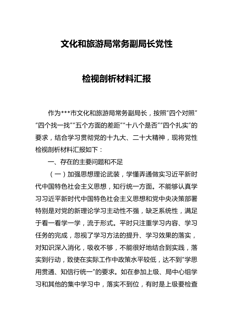 文化和旅游局常务副局长党性检视剖析材料汇报作为***市文化和旅游局常务副局长,按照“四个对照”“四个找一找”“五个方面的差距”“十八个是否”“四个扎实”的要求,结合学习贯彻党的十九大、二十大精神,现将党性检视剖析材料汇报如下:一、存在的主要问题和不足(一)加强思想理论武装,学懂弄通做实习近平新时代中国特色社会主义思想,知行统一方面。不能够认真学习习近平新时代中国特色社会主义思想和党中央决策部署特别是对党的新理论学习主动性不强,缺乏系统性,满足于看一看学一学,流于形式。平时只注重学习内容、学习任务的完成,忽视了学习方法的提升、学习效果的落实,对知识深入消化,吸收不够,不能很好地结合到实践,落实到行动,致使在实际工作中政策水平较低,达不到“学思用贯通、知信行统一”的要求。如在参加上级、局中心组学习和其他的集中学习中,落实不到位,有时是上级要检查了,才发现心得体会还少几篇,理论笔记字数还不够等,补笔记补心得,导致手忙脚乱,没有达到应有的学习效果。这说明自己没有充分认识到理论学习的重要性,没有把学习当作一条铁纪来抓,对理论武装头脑的认识不高。(二)加强思想政治建设,增强“四个意识”,坚定“四个自信",做到“两个维护"方面。对照要求,做得不够。一是对政策的理解不深入。对一些新理论、新战略、新要求,缺乏深层次的思考研究,学习不透彻,掌握不具体,研究不到位。二是学用结合不紧密。在贯彻落实中央和省市的部署上,仅满足于学习了知道了,但在结合工作实际、谋划推动工作上,有用老经验、老办法干工作的情况,学用“两张皮”,运用新理论指导实际工作做得还不到位。三是大局意识不强。对自己分管领域之外的工作和活动,主动提出的意见较少,大多数是表示同意。意识形态工作,习近平总书记高度重视,但平时对这方面的知识掌握不多,思考不深,对结合单位实际的落实上,提不出切实可行的办法。这说明自己存在政治站位不高,贯彻落实中央决定的不实不细的问题。(三)对照先进典型,身边榜样,能力素质,工作作风方面。奋斗精神弱化,自我加压提高素质的紧迫感不强缺乏强烈的争先创优意识。面对千头万绪、复杂繁多的工作,经常是想先听听、多看看,影响了工作效率。如在平时遇到一些事情时,担心管得太多别人不高兴,给自己带来不必要的麻烦,有“等一等、看一看”的想法,甚至想把事情能推出去的念头。真抓实干的作风弱化,存在把计划当工作,把部署当落实的情况,对执行效果不注重。面对新形势、新任务有“本领恐慌”心理,担当作为的主动性和积极性不足,担心承诺了的工作、答应了的事情如果办不好别人会笑话还不如四平八稳、按部就班稳当,缺少攻坚克难的勇气。如在日常工作中,多强调按级管理,对管理制度的落实是否到位抓得不深不细不实,对新形势下做好意识形态工作缺乏新的理论知识和创新的办法。这说明自己存在奋斗精神上退化、争创一流的意识不强。(四)践行党的根本宗旨,全心全意为人民服方面。对照党章要求,对照党的初心和使命,存在宗旨意识树的不牢、服务联系群众不紧密、帮扶效果不显著问题。对本人负责帮扶的张家庄村民,在帮扶过程中,深入到村中、深入到群众家中只是按要求走一走,对村里的情况掌握不细,问题原因没有探明,难以拿出解决问题的方法和措施只是根据经验,泛泛而谈,缺少切实可行的工作方案。在走访工作中,存在着被动应付的现象,通常是上级要求去时才去,对贫困户家里的情况了解不透彻,享受的帮扶政策掌握的不全面,缺少行之有效的帮扶办法,也没有真正帮助贫困户做一些力所能及的事情。这说明自己还存在的宗旨意识不强,真心实意为人民服务的意识不牢固。(五)落实全面从严治党责任,保持政治本色,保持清正廉洁方面。通过认真研读《党章》、《中国共产党纪律处分条例》等党内法规,对照查摆发现,没有把执行党的政治纪律真正融入工作生活之中。平时开展积极健康党内思想斗争,存在交代工作多、交流思想少,“点赞”多、“差评”少。存在讲工作纪律多,讲政治纪律少,落实“一岗双责”不到位。在处理局部与全局关系上,还是站位不高,看的不远,想得不深,做...