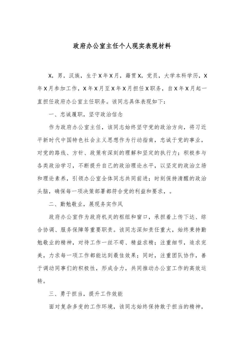 政府办公室主任个人现实表现材料X,男,汉族,生于X年X月,籍贯X,党员,大学本科学历,X年X月参加工作,X年X月至X年X月担任X职务,自X年X月起一直担任政府办公室主任职务。该同志具体表现如下:一、忠诚履职,坚守政治信念作为政府办公室主任,该同志始终坚守党的政治方向,将习近平新时代中国特色社会主义思想作为行动指南,忠诚于党的事业,对党的路线、方针、政策有深刻的理解和坚定的执行力;积极参与各类政治学习,不断提升自己的政治理论水平,以坚定的政治立场和理论素养,引领办公室全体同志共同前进;时刻保持清醒的政治头脑,确保每一项决策部署都符合党的利益和要求,。二、勤勉敬业,展现务实作风政府办公室作为政府机关的枢纽和窗口,承担着上传下达、综合协调、服务保障等重要职责。该同志深知责任重大,始终秉持勤勉敬业的精神,对待工作一丝不苟、精益求精;注重细节,追求完美,力求每一项工作都能达到最佳效果;同时,注重团队协作,善于调动同事们的积极性,形成合力,共同推动办公室工作的高效运转。三、勇于担当,提升工作效能面对复杂多变的工作环境,该同志始终保持敢于担当的精神,勇于承担重任,敢于直面问题,始终坚持原则,严格遵守规章制度,确保每一项工作都能经得起历史和人民的检验;注重提高工作效率,通过优化工作流程、加强信息化建设等方式,不断提升办公室工作的质量和效率;同时,注重创新工作方法,积极探索新的工作思路和模式,为政府工作注入新的活力和动力。四、严于律己,树立良好形象该同志始终严格要求自己,自觉遵守廉洁从政的相关规定,坚决抵制各种不正之风和腐败现象;注重加强党性锻炼和道德修养,树立正确的世界观、人生观和价值观,不断提升自己的道德品质和人格魅力;注重家庭建设,营造和谐的家庭氛围,注重对家人的廉政教育,共同维护家庭的廉洁形象。五、深入基层,践行群众路线该同志始终牢记共产党员的初心使命,将人民利益放在首位,践行为人民服务的根本宗旨;注重深入基层、深入群众,了解他们的所思所盼、所忧所急,积极为他们排忧解难;定期组织办公室同志开展走访调研活动,深入企业、乡村社区等基层单位,实地了解民情民意、掌握第一手资料;同时,注重加强与群众的沟通交流,积极听取他们的意见和建议,不断改进工作方法和作风,努力提升政府工作的满意度和认可度。六、加强学习,提升综合素质该同志注重加强学习,不断提升自己的综合素质;积极参加各类培训和学习活动,学习新知识、新技能、新思想,不断拓宽自己的视野和思路;同时,注重向身边的同事和领导学习,虚心请教、取长补短,不断提高自己的业务能力和管理水平。通过不断学习和实践,该同志已逐渐成长为一名具备较高综合素质的政府办公室主任。缺点与不足:尽管该同志始终致力于提高工作效能和服务质量,但仍存在一定的改进空间。特别是在时间管理方面,由于政府办公室工作繁忙且多变,该同志有时难以做到每项工作都井然有序,导致部分紧急任务的处理不够及时。此外,在信息收集和数据分析方面,该同志还需加强能力,以更精准地把握政策动向和工作需求。在今后的工作中,希望该同志将进一步学习时间管理技巧,合理安排每日工作计划,确保重要且紧急的任务能够得到优先处理;定期参加信息处理和数据分析方面的专业培训,提升自己在这些领域的专业能力;加强与同事间的沟通交流,借鉴他们的工作经验,共同探讨解决工作中遇到的问题,以期达到更好的团队协作效果。相信该同志在在未来的工作中一定能够更加高效、精准地完成任务,更好地服务于人民。