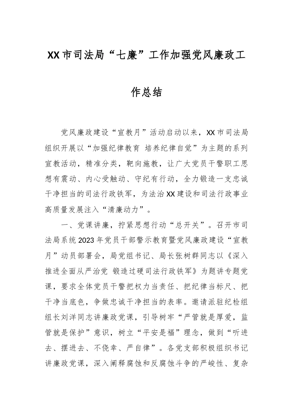 XX市司法局“七廉”工作加强党风廉政工作总结党风廉政建设“宣教月”活动启动以来,XX市司法局组织开展以“加强纪律教育培养纪律自觉”为主题的系列宣教活动,精准分类,靶向施教,让广大党员干警职工思想有震动、内心受触动、守纪有行动,全力锻造一支忠诚干净担当的司法行政铁军,为法治XX建设和司法行政事业高质量发展注入“清廉动力”。一、党课讲廉,拧紧思想行动“总开关”。召开市司法局系统2023年党员干部警示教育暨党风廉政建设“宣教月”动员部署会,局党组书记、局长张树群同志以《深入推进全面从严治党锻造过硬司法行政铁军》为题讲专题党课,要求全体党员干警把权力当责任、把纪律当标尺、把干净当底色,争做忠诚干净担当的表率。邀请派驻纪检组组长刘洋同志讲廉政党课,引导树牢“严管就是厚爱,监管就是保护”意识,树立“平安是福”理念,做到“听进去、摆进去、不侥幸、严自律”。各党支部积极组织书记讲廉政党课,深入阐释腐蚀和反腐蚀斗争的严峻性、复杂性,讲清楚反腐败斗争的长期性、艰巨性,深化党风廉政教育成果。二、述责说廉,压实从严治党“责任链”。局党组召开党建、党风廉政建设专题会议,重点听取上半年全面从严治党工作汇报,党组班子成员分别汇报落实“一岗双责”情况;派驻纪检组结合日常监督,把脉会诊市司法局在全面从严治党、党风廉政建设工作中存在的问题,并针对性提出意见建议。党组书记带头落实廉政谈心谈话制度,召开集体廉政谈话会,督促中层以上干部带头坚定信念,做到绝对忠诚;带头履职尽责,做到务实担当;带头廉洁自律做到清坚守底线。班子成员与分管科室(单位)负责人逐个谈工作职责、说廉洁要求;各科室(单位)负责人与干部面对面谈纪律、作提醒,层层落实责任,层层传导压力推动全面从严管党治警向纵深发展。三、制度固廉,筑起风险防控“防火墙”。印发《XX市司法局干警“八小时以外”监督管理办法(试行)》,加强干警“八小时以外”活动监督管理,盯住重要事项、重点场所、重点时段,督促干警自觉净化自己的社交圈、生活圈、休闲圈。开展廉政风险防控“回头看”,26个科室(单位)结合年初摸排的风险点进行再梳理再完善;重点查看权责事项是否有调整,权力运行是否按照流程规范操作,在已排查的风险点外是否发生违法违纪问题。通过“回头看”查堵风险漏洞,扫除防控盲区,确保各岗位各环节风险点“查全、查深、查准”。四、教育醒廉,敲响拒腐防变“警示钟”。用好用足警示教育“活教材”,组织党员干警集中观看省、市纪委监委制作的3部警示教育片,做到“一把手”必看、领导班子成员必看、重点岗位人员必看、年轻干部必看。30余名党员干警走进郧阳区检察院警示教育基地,以沉浸式互动性的体验学习,深切感悟“廉贪一念间,荣辱两世界”;80多名党员干警及人事财务等关键岗位人员在市中级人民法院旁听职务犯罪庭审,用零距离的“警示课堂”,以案释纪以案释法,激发“不敢腐”的内心自觉。五、活动促廉,走好廉洁从政“每一步”。组织对2022年下半年以来新任职、晋级、入职的50名党员干警职工开展宪法宣誓仪式暨任前谈话活动,深入贯彻落实A法治思想,弘扬宪法精神,引导干警担当作为、依法履职。开展青年干部学习A新时代中国特色社会主义思想培训会暨“青年说清廉”主题活动,引导35周岁以下青年干部系好廉洁从政第一粒“扣子”,迈实干事创业每一级“台阶”。结合加强能力作风建设,开展党规党纪知识测试活动和“加强纪律教育培养纪律自觉”心得体会撰写,通过人人考、个个写,让“党的六大纪律”成为每名干警的纪律自觉。六、家风正廉,共织亲情互助“护廉网”。各支部结合主题党日开展“树清廉家风·创最美家庭”亲情助廉活动,发放倡议书,倡议干部家属自觉参与到廉洁家庭建设中,把好配偶子女的廉洁自律关;组织签订助廉承诺书,分享家风家训,引导干部家属当好家庭助廉的践行者、廉洁从政的监督者、清廉家风的弘扬者;组织副科级以上干部职工家属观看警示教育片,围绕“如何当好廉内助”开展交流讨论以良好家教家风促建优良党风政风,推动干部监督由单位监督向家庭监督拓展,着力构建家庭、单位相结合的双重监督防...