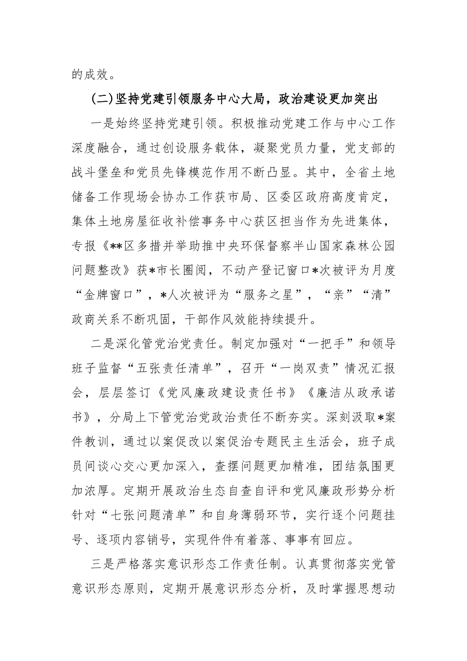 2023年党建工作总结(6篇)与2024年党支部工作计划【5篇】供参考2023年党建工作总结(6篇)篇一2023年,**按照新时代党的建设总要求,以机关党建高质量发展为主题,以学习贯彻党的二十大精神和深入开展学习贯彻习近平新时代中国特色社会主义思想主题教育为主线,纵深推进党的各项建设,引导党员干部衷心拥护“两个确立”,忠诚践行“两个维护”,在“两个先行”发展大局中,谋划更多真招实招,为全面建设**国际化现代化共同富裕典范城区提供坚强保障,各项工作再上新台阶。一、2023年机关党建工作回顾(一)强化理论武装,坚持以习近平新时代中国特色社会主义思想凝心铸魂一是党员干部全覆盖学习党的二十大精神。完善制定年度党建工作计划,将学习贯彻党的二十大精神,纳入重点工作,明确学习教育覆盖全体党员干部,制定学习计划和要求。按照要求积极参加局机关党委组织的各类党的二十大精神学习活动,开展“深学笃行二十大、踔厉奋发当先锋”主题党日活动,邀请**党委讲师团老师开展党的二十大精神专题辅导,组织全体党员干部学习习近平总书记在新进中央委员会的委员、候补委员和省部级主要领导干部研讨班上的重要讲话精神,进一步引导党员干部把思想和行动统一到党的二十大精神上来。二是扎实推进主题教育工作走深走实。牢牢把握主题教育“学思想、强党性、重实践、建新功”的总体要求,坚持学思用贯通、知信行统一。成立专班研究制定主题教育实施方案,针对性细化学习内容,完善制定学习计划,统筹开展学习教育活动。党委以支部为单位,非党员一并纳入,外业人员以项目组为单位,灵活组建学习小组,同步开展主题教育,做到学习不落一人。坚持开展“每日一学”,组织集中学习*次,举办读书班*期,围绕党的二十大精神和规定书目,实时跟进习近平总书记重要讲话精神深化研讨交流,围绕“*个专题”开展专题研讨*次,针对在推进**事业发展中面临的问题,组织开展业务交流研讨*次,引领广大党员干部在学习中发现问题、解决问题,凝聚推进事业高质量发展的强大合力。组织开展“学思想、强党性、重实践、建新功”主题教育培训班,邀请**、**分别为我们做道德讲堂和专题辅导,引导党员干部在以学铸魂、以学增智、以学正风、以学促干方面取得实实在在的成效。(二)坚持党建引领服务中心大局,政治建设更加突出一是始终坚持党建引领。积极推动党建工作与中心工作深度融合,通过创设服务载体,凝聚党员力量,党支部的战斗堡垒和党员先锋模范作用不断凸显。其中,全省土地储备工作现场会协办工作获市局、区委区政府高度肯定,集体土地房屋征收补偿事务中心获区担当作为先进集体,专报《**区多措并举助推中央环保督察半山国家森林公园问题整改》获*市长圈阅,不动产登记窗口*次被评为月度“金牌窗口”,*人次被评为“服务之星”,“亲”“清”政商关系不断巩固,干部作风效能持续提升。二是深化管党治党责任。制定加强对“一把手”和领导班子监督“五张责任清单”,召开“一岗双责”情况汇报会,层层签订《党风廉政建设责任书》《廉洁从政承诺书》,分局上下管党治党政治责任不断夯实。深刻汲取*案件教训,通过以案促改以案促治专题民主生活会,班子成员间谈心交心更加深入,查摆问题更加精准,团结氛围更加浓厚。定期开展政治生态自查自评和党风廉政形势分析针对“七张问题清单”和自身薄弱环节,实行逐个问题挂号、逐项内容销号,实现件件有着落、事事有回应。三是严格落实意识形态工作责任制。认真贯彻落实党管意识形态原则,定期开展意识形态分析,及时掌握思想动态,有效避免各种负面言论。加强信息员和网评员队伍建设,及时高效完成各类宣传报道和舆论引导,实现重大主题报道浓墨重彩,日常宣传工作细水长流,舆论热点关切及时到位。结合“4.22”地球日、“6.25”土地日、“7.1建党日”等特殊时段,充分运用分局,加大对自然资源政策法规和自然资源工作亮点的宣传推送力度;今年以来,微信原创信息*篇,省级报刊录用*篇、市级报刊录用*篇,区两办信息录用*篇,其中全省土地储备工作现场会获*报、*报专版报道。(三)实施“三大工程”打造模范机关,组织基础更加夯实一是从严从实实施“锻造工...