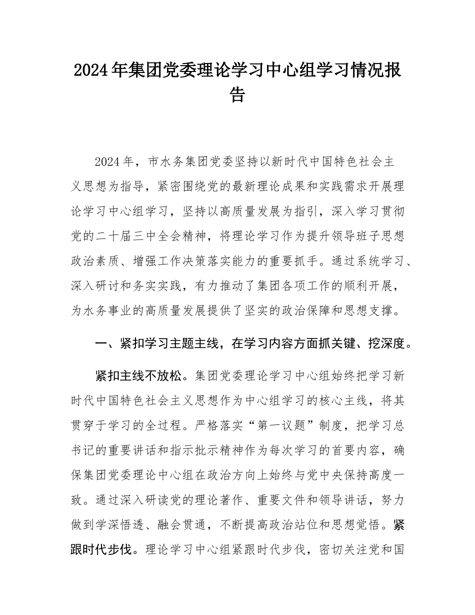 2024年集团党委理论学习中心组学习情况报告2024年,市水务集团党委坚持以新时代中国特色社会主义思想为指导,紧密围绕党的最新理论成果和实践需求开展理论学习中心组学习,坚持以高质量发展为指引,深入学习贯彻党的二十届三中全会精神,将理论学习作为提升领导班子思想政治素质、增强工作决策落实能力的重要抓手。通过系统学习、深入研讨和务实实践,有力推动了集团各项工作的顺利开展,为水务事业的高质量发展提供了坚实的政治保障和思想支撑。一、紧扣学习主题主线,在学习内容方面抓关键、挖深度。紧扣主线不放松。集团党委理论学习中心组始终把学习新时代中国特色社会主义思想作为中心组学习的核心主线,将其贯穿于学习的全过程。严格落实“第一议题”制度,把学习总书记的重要讲话和指示批示精神作为每次学习的首要内容,确保集团党委理论中心组在政治方向上始终与党中央保持高度一致。通过深入研读党的理论著作、重要文件和领导讲话,努力做到学深悟透、融会贯通,不断提高政治站位和思想觉悟。紧跟时代步伐。理论学习中心组紧跟时代步伐,密切关注党和国家的重大战略部署、政策导向以及行业发展的新动态、新趋势,及时将党的创新理论最新成果、国家关于水务行业的政策法规、生态环保与水资源管理等方面的重要内容纳入学习范围。聚焦水务行业发展趋势和前沿动态,科学设置学习内容。结合实际重应用。坚持理论联系实际的学风,将学习内容与集团的生产经营管理、项目建设、技术创新等实际工作紧密结合。针对集团在水务工程建设中遇到的技术难题、水资源优化配置中的矛盾问题、污水处理与环境保护的协同推进等实际情况,不断提升水务管理和服务的专业化水平。二、紧扣学习方式路径,在学习形式层面拓途径、谋创新。依循严格制度规范扎实学。进一步健全完善党委理论中心组学习制度,进一步健全完善学习制度,对学习的组织领导、内容安排、要求标准、管理考核等方面作出明确具体的规定。定期对学习情况进行总结和评估,及时发现问题并加以改进,严格落实考勤制度,确保中心组成员的学习参与度和学习效果。集中学习与个人自学相结合。定期组织集中学习,邀请专家学者进行专题讲座、辅导报告,开展集中研讨和交流活动,让中心组成员在集体学习中相互启发、共同提高。同时,鼓励中心组成员根据自身的工作需要和学习兴趣,制定个人学习计划,利用业余时间进行自主学习,不断拓宽知识面和视野。线上学习与线下学习相结合。充分利用互联网、新媒体等平台,组织中心组成员参加在线学习、网络培训、视频会议等活动,打破时间和空间的限制,提高学习的效率和便捷性。在线下,积极开展实地考察、调研学习、现场教学等活动,让中心组成员深入基层一线、项目现场,了解实际情况,增强学习的针对性和实效性。理论学习与实践学习相结合。将理论学习与水务集团的实际工作紧密结合,通过开展项目调研、技术攻关、案例分析等实践活动,让中心组成员将理论知识应用到实际工作中,提高解决实际问题的能力。同时,组织理论学习中心组成员到先进水务企业、科研机构等进行参观学习,借鉴先进经验和做法,为集团的发展提供有益的参考。互动交流深入有效学。改变传统的单向灌输式学习方式,加强学习过程中的互动交流。在集中学习和研讨活动中,鼓励中心组成员积极发言、提问、讨论,分享自己的学习心得和体会,形成良好的学习氛围。开展学习心得交流活动,组织中心组成员撰写学习心得和调研报告,并进行交流分享,促进学习成果的转化和应用。三、紧扣成果转化运用,在以学促干环节见实绩、谋突破。推动成果转化助发展。中心组注重将学习成果转化为推动集团创新发展的动力源泉。通过将调研报告中的行动计划和工作方案纳入中心组学习议题,将领导在调研中形成的成果充分应用到日常工作中去,形成“理论学习—实践调研—成果学习”的完整闭环;例如在学习国家关于水务行业的绿色发展政策后,结合集团的实际情况,制定了污水处理升级改造、水资源循环利用等项目的实施计划,推动集团的可持续发展。破解难题勇担当。针对集团在发展过程中遇到的困难和挑战,充分发挥党委理论中心组的智慧和力量,组织中心组成员...
