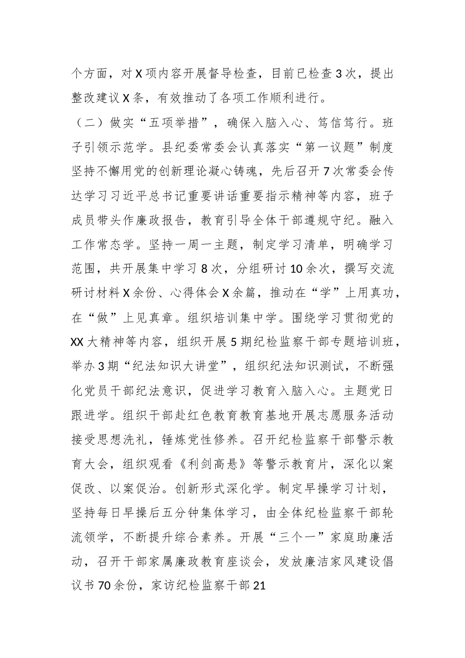 关于某县纪检监察干部队伍教育整顿工作阶段性总结纪检监察干部队伍教育整顿开展以来,某县纪委监委在市纪委监委和县委的坚强领导下,在市教育整顿第XX督导组的指导帮助下,坚持问题导向、目标导向、效果导向,发扬“严、实、细”工作作风,确保“规定动作”不走样、“自选动作”有特色,全县教育整顿有力有序推进,取得阶段性成效。一、工作开展情况(一)坚持“三个强化”,做到系统谋划、整体推进。强化组织实施。全国、全省、全市纪检监察干部队伍教育整顿动员部署会后,我们第一时间向县委作了专题汇报,组织相关人员学习会议精神;制定实施方案,细化X项重点任务和X项具体工作;组织召开动员部署会议,全县纪检监察干部闻令而动,自觉接受革命性锻造。强化统筹推进。成立X个临时党支部,对乡镇纪检监察干部教育整顿一体推进,对巡察组和借用人员统一管理,确保教育整顿不漏一人。实行“周计划”调度制度,每周制定工作计划,明确时间节点,责任落实到人。强化督导检查。将教育整顿开展情况纳入日常监督重点内容,成立X个督导检查组,重点围绕X个环节X个方面,对X项内容开展督导检查,目前已检查3次,提出整改建议X条,有效推动了各项工作顺利进行。(二)做实“五项举措”,确保入脑入心、笃信笃行。班子引领示范学。县纪委常委会认真落实“第一议题”制度坚持不懈用党的创新理论凝心铸魂,先后召开7次常委会传达学习习近平总书记重要讲话重要指示精神等内容,班子成员带头作廉政报告,教育引导全体干部遵规守纪。融入工作常态学。坚持一周一主题,制定学习清单,明确学习范围,共开展集中学习8次,分组研讨10余次,撰写交流研讨材料X余份、心得体会X余篇,推动在“学”上用真功,在“做”上见真章。组织培训集中学。围绕学习贯彻党的XX大精神等内容,组织开展5期纪检监察干部专题培训班,举办3期“纪法知识大讲堂”,组织纪法知识测试,不断强化党员干部纪法意识,促进学习教育入脑入心。主题党日跟进学。组织干部赴红色教育教育基地开展志愿服务活动接受思想洗礼,锤炼党性修养。召开纪检监察干部警示教育大会,组织观看《利剑高悬》等警示教育片,深化以案促改、以案促治。创新形式深化学。制定早操学习计划,坚持每日早操后五分钟集体学习,由全体纪检监察干部轮流领学,不断提升综合素养。开展“三个一”家庭助廉活动,召开干部家属廉政教育座谈会,发放廉洁家风建设倡议书70余份,家访纪检监察干部21人,教育引导党员干部立家规、严家教、正家风,进一步强化家庭家教家风建设和廉洁齐家理念。(三)坚持“对标对表”,深入摸排问题、自查自纠。一是积极开展谈心谈话,领导班子成员与分管(协管)部门主要负责人、各部门主要负责人与本部门科级以上干部和关键岗位干部开展谈心谈话,了解思想状况、强化政治引领、提出明确要求,教育引导纪检监察干部把自己摆进去把事情把进去、把问题摆进去,积极主动把自身存在的问题找出来、说清楚、改到位。二是组织开展“向下点题、向上领责”活动,由班子成员向分管科室指出问题,分管科室结合工作实际,分析具体问题表现,截止目前,共梳理问题40条。三是对照《实施方案》和相关文件,全面查摆委机关存在的问题,共梳理共性问题11条,个性问题753条,督促全体纪检监察干部填写自查自纠登记表。(四)突出“三个结合”,推动互促共进、全面提升。与主责主业相结合。“室组地”联动,持续开展营商环境、乡村振兴、“三资”管理等领域专项整治,今年以来,全县处置问题线索同比增长26.8%。与“三化”建设相结合。突出成果转化,完善机关日常管理、办案安全、保密等制度12项,不断提升纪检监察工作规范化法治化正规化水平与自身建设相结合。及时向县委请示,坚决把不能胜任纪检监察工作的同志予以调离;与相关部门沟通,择优调入招录7人,不断充实优化干部队伍;起底XXX以来本级纪检监察干部问题线索X件,正在办理X件。二、存在问题一是学习的形式还比较单一。过多强调原原本本学原著和局限必读篇目,在深入学、广泛学的形式还比较单一,在把握精神实质上还有差距。同时必读篇目较多,在有限时间里还不能全部学完、学到位,存在浅尝辄...