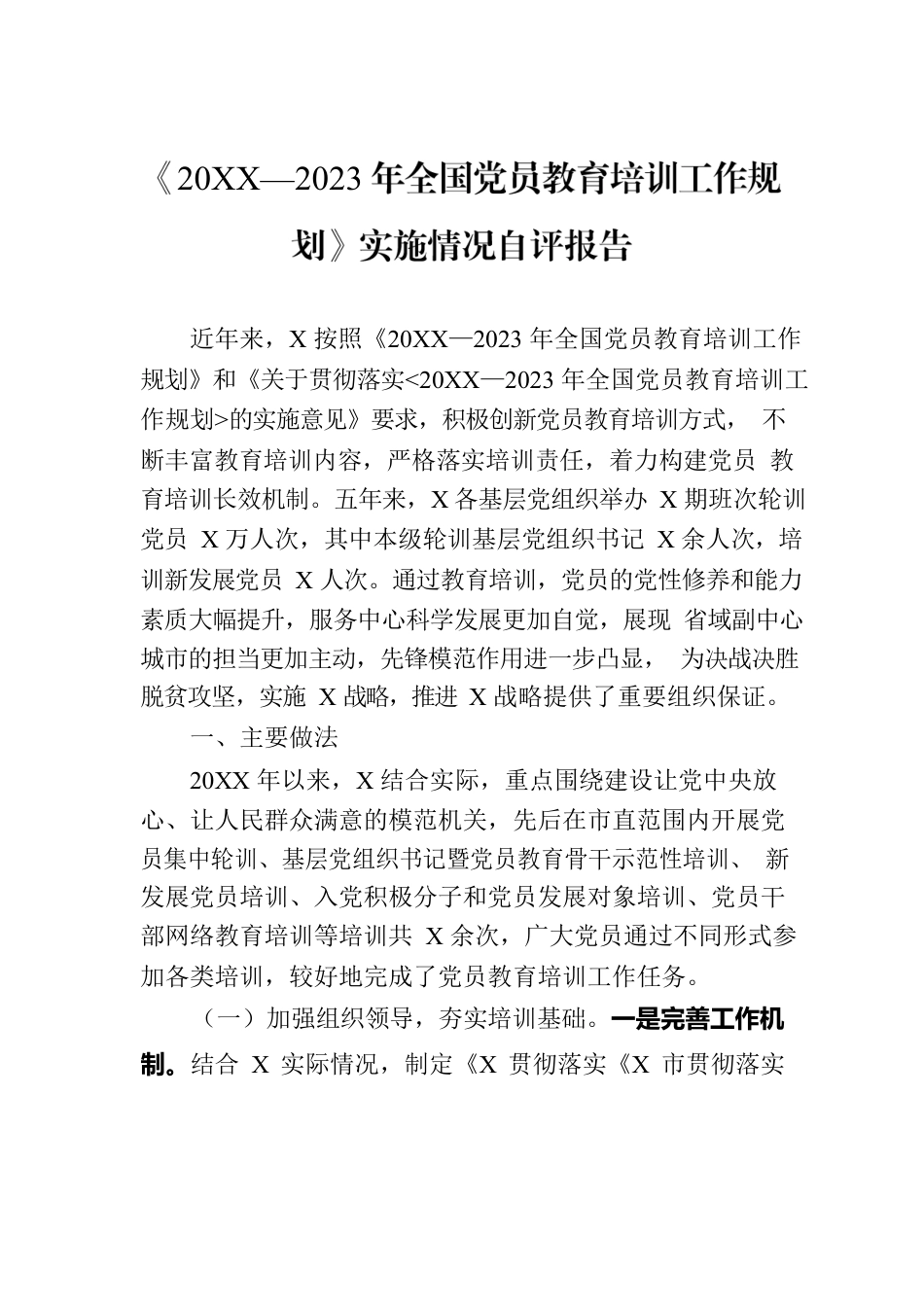 20XX—2023近年来,X按照《20XX—2023年全国党员教育培训工作规划》和《关于贯彻落实<20XX—2023年全国党员教育培训工作规划>的实施意见》要求,积极创新党员教育培训方式,不断丰富教育培训内容,严格落实培训责任,着力构建党员教育培训长效机制。五年来,X各基层党组织举办X期班次轮训党员X万人次,其中本级轮训基层党组织书记X余人次,培训新发展党员X人次。通过教育培训,党员的党性修养和能力素质大幅提升,服务中心科学发展更加自觉,展现省域副中心城市的担当更加主动,先锋模范作用进一步凸显,为决战决胜脱贫攻坚,实施X战略,推进X战略提供了重要组织保证。一、主要做法20XX年以来,X结合实际,重点围绕建设让党中央放心、让人民群众满意的模范机关,先后在市直范围内开展党员集中轮训、基层党组织书记暨党员教育骨干示范性培训、新发展党员培训、入党积极分子和党员发展对象培训、党员干部网络教育培训等培训共X余次,广大党员通过不同形式参加各类培训,较好地完成了党员教育培训工作任务。(一)加强组织领导,夯实培训基础。一是完善工作机制。结合X实际情况,制定《X贯彻落实《X市贯彻落实〈20XX-2023年全国党员教育培训工作规划〉的实施方案》的工作计划》,并制定了每年的党员教育培训数量任务。落实了各单位党组织党员教育培训工作第一责任人的责任,将党员教育工作纳入党建工作述职评议考核的重要内容;各级党委(党组)每年就党员集中轮训工作作出安排,分期分批组织实施;机关党建网站建立了值班管理制度、信息采集制度、审核发布制度、安全运行制度,确保了X党建网信息发布的及时、准确、安全。二是保障运转经费。每年年初,各级财政都将党员教育专项经费纳入财政预算,机关基层党组织活动经费按不少于机关工作人员工资总额的X%列入单位行政经费年度预算,X党员教育经费根据机关本级所辖党员人数,制定经费安排标准,列入同级财政年度预算,专款专用,并根据党员教育需要和财力情况逐步增加。各级(直属)机关党委从管理的党费中拿出部分资金,采取举办各类培训、订购党建书刊、添置教育设备、下拨培训经费等措施,确保党员教育经费的落实。三是加强检查督导。我们以支部标准化建设为抓手,持续推行星级党支部创建管理。积极学习他山之石,远赴X、近到X取经,每年对各一级党组织单位开展全覆盖式集中检查调研,并延伸到县直机关解剖麻雀,重点对党组织和党员开展学习教育培训调研,取得了一些成果,探索了一些做法,取得了一些成效。(二)结合行业实际,明确培训重点。一是“党员进党校”全员轮训工程有计划。采取行业示范培训、基层党委兜底培训的形式,主要依托市委党校、基层党校、党员活动室(中心)、老年大学有计划分层次高质量开展党员集中培训,把全市党员普遍轮训一遍。对机关事业单位、国有企业按照属地管理原则由所属基层党组织负责组织实施,上级党组织负责具体指导抓好落实。对年老体弱、行动不便、身患重病甚至失能的党员,通过送学上门等方式开展学习教育。对流动党员培训,实行流出地为主、流入地配合、线上线下结合的联动培训方式。截至目前,X党员全员轮训率达到X%,人均培训32学时以上。二是基层党组织书记“头雁工程”培训有力度。抓住党员干部队伍中的关键少数,实施“头雁工程”,每年遴选3-5名X的优秀党组织书记参加省、市举办的示范性培训,累计举办5期X基层党务干部骨干示范培训班,轮训各基层党组织书记、副书记、组织委员X人次,每次时间不低于3天,半年内新任职的基层党组织书记参训率达70%,以示范效应辐射带动全行业党务干部进行全覆盖培训。三是新发展党员培训有声色。五年来,集中培训了预备期内和转正后1年内的预备党员X次。其中,2021年组织200余名新发展党员到X参观践学,组织“永远跟党走”集中宣誓活动,做法被X等媒体报道,活动视频2天内在微信公众号就被点播5000次。(三)改进资源体系,提高培训实效。一是师资力量进一步强化。坚持“引凤”,近年来,中央宣讲团成员X,国防大学教授X,等知名专家学者先后莅临本市,为广大X党员领导干部开堂授课。立足“土创”,分行业分类别广泛动员,遴选10名党员教育培训讲师...