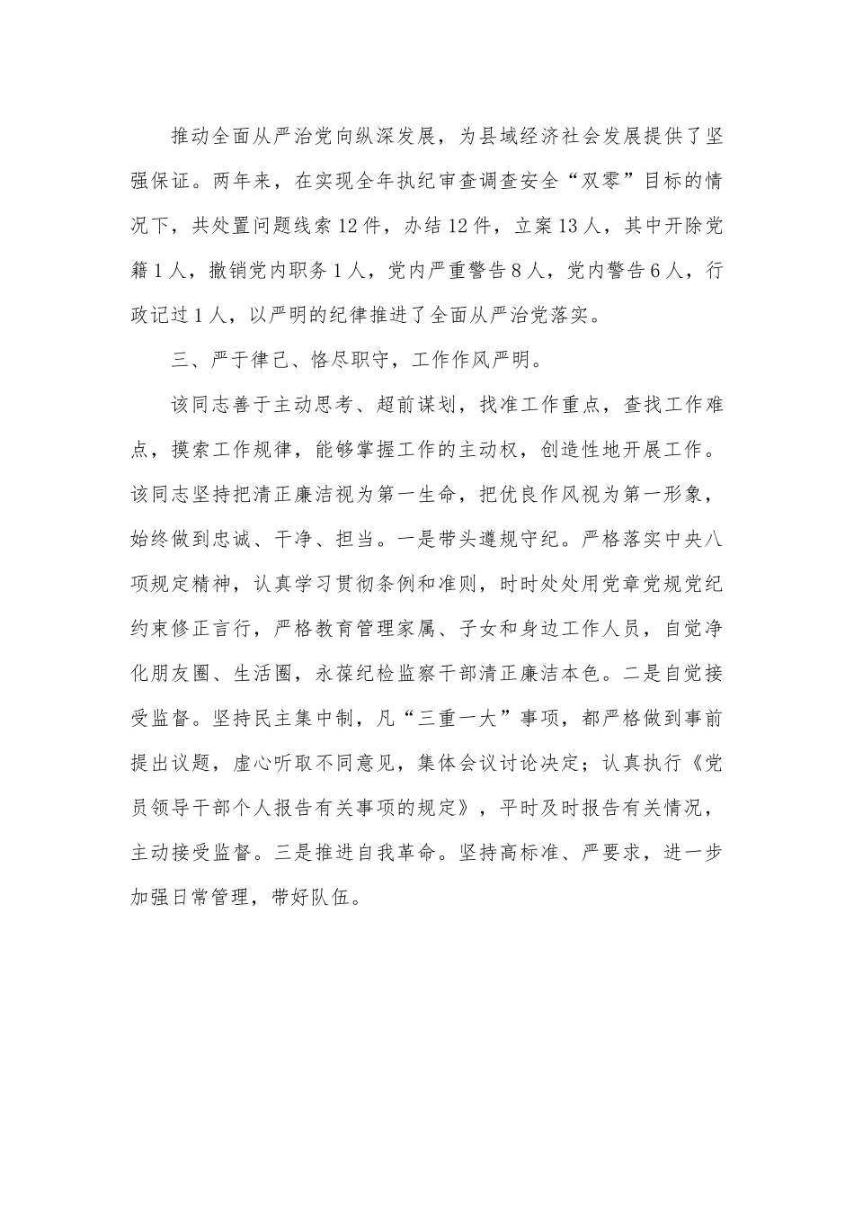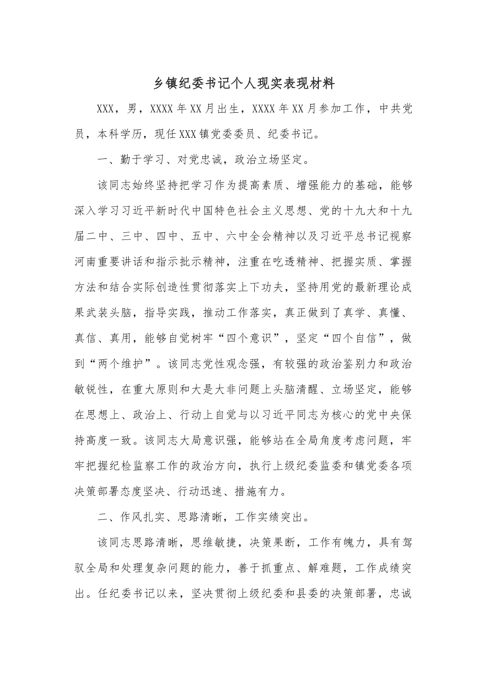 乡镇纪委书记个人现实表现材料XXX,男,XXXX年XX月出生,XXXX年XX月参加工作,中共党员,本科学历,现任XXX镇党委委员、纪委书记。一、勤于学习、对党忠诚,政治立场坚定。该同志始终坚持把学习作为提高素质、增强能力的基础,能够深入学习习近平新时代中国特色社会主义思想、党的十九大和十九届二中、三中、四中、五中、六中全会精神以及习近平总书记视察河南重要讲话和指示批示精神,注重在吃透精神、把握实质、掌握方法和结合实际创造性贯彻落实上下功夫,坚持用党的最新理论成果武装头脑,指导实践,推动工作落实,真正做到了真学、真懂、真信、真用,能够自觉树牢“四个意识”,坚定“四个自信”,做到“两个维护”。该同志党性观念强,有较强的政治鉴别力和政治敏锐性,在重大原则和大是大非问题上头脑清醒、立场坚定,能够在思想上、政治上、行动上自觉与以习近平同志为核心的党中央保持高度一致。该同志大局意识强,能够站在全局角度考虑问题,牢牢把握纪检监察工作的政治方向,执行上级纪委监委和镇党委各项决策部署态度坚决、行动迅速、措施有力。二、作风扎实、思路清晰,工作实绩突出。该同志思路清晰,思维敏捷,决策果断,工作有魄力,具有驾驭全局和处理复杂问题的能力,善于抓重点、解难题,工作成绩突出。任纪委书记以来,坚决贯彻上级纪委和县委的决策部署,忠诚履行党章和宪法赋予的职责,持之以恒正风肃纪,坚定不移惩贪治腐,持续推动全面从严治党向纵深发展,为县域经济社会发展提供了坚强保证。两年来,在实现全年执纪审查调查安全“双零”目标的情况下,共处置问题线索12件,办结12件,立案13人,其中开除党籍1人,撤销党内职务1人,党内严重警告8人,党内警告6人,行政记过1人,以严明的纪律推进了全面从严治党落实。三、严于律己、恪尽职守,工作作风严明。该同志善于主动思考、超前谋划,找准工作重点,查找工作难点,摸索工作规律,能够掌握工作的主动权,创造性地开展工作。该同志坚持把清正廉洁视为第一生命,把优良作风视为第一形象,始终做到忠诚、干净、担当。一是带头遵规守纪。严格落实中央八项规定精神,认真学习贯彻条例和准则,时时处处用党章党规党纪约束修正言行,严格教育管理家属、子女和身边工作人员,自觉净化朋友圈、生活圈,永葆纪检监察干部清正廉洁本色。二是自觉接受监督。坚持民主集中制,凡“三重一大”事项,都严格做到事前提出议题,虚心听取不同意见,集体会议讨论决定;认真执行《党员领导干部个人报告有关事项的规定》,平时及时报告有关情况,主动接受监督。三是推进自我革命。坚持高标准、严要求,进一步加强日常管理,带好队伍。