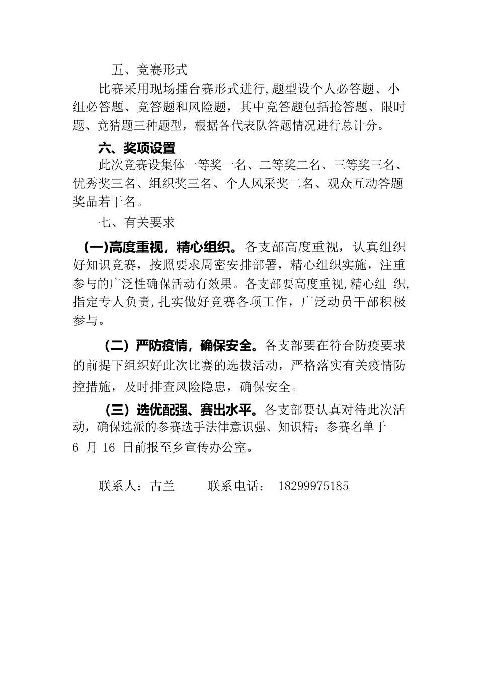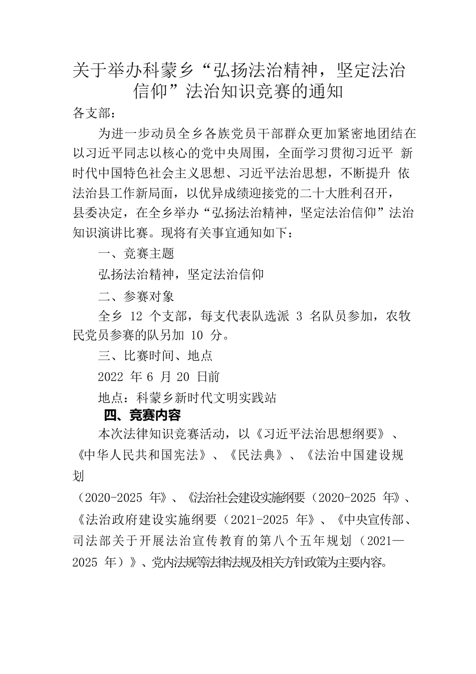 关于举办科蒙乡“弘扬法治精神,坚定法治信仰”法治知识竞赛的通知各支部:为进一步动员全乡各族党员干部群众更加紧密地团结在以习近平同志以核心的党中央周围,全面学习贯彻习近平新时代中国特色社会主义思想、习近平法治思想,不断提升依法治县工作新局面,以优异成绩迎接党的二十大胜利召开,县委决定,在全乡举办“弘扬法治精神,坚定法治信仰”法治知识演讲比赛。现将有关事宜通知如下:一、竞赛主题弘扬法治精神,坚定法治信仰二、参赛对象全乡12个支部,每支代表队选派3名队员参加,农牧民党员参赛的队另加10分。三、比赛时间、地点2022年6月20日前地点:科蒙乡新时代文明实践站四、竞赛内容本次法律知识竞赛活动,以《习近平法治思想纲要》、《中华人民共和国宪法》、《民法典》、《法治中国建设规划(2020-2025年》、《法治社会建设实施纲要(2020-2025年》、《法治政府建设实施纲要(2021-2025年》、《中央宣传部、司法部关于开展法治宣传教育的第八个五年规划(2021—2025年)》、党内法规等法律法规及相关方针政策为主要内容。五、竞赛形式比赛采用现场擂台赛形式进行,题型设个人必答题、小组必答题、竞答题和风险题,其中竞答题包括抢答题、限时题、竞猜题三种题型,根据各代表队答题情况进行总计分。六、奖项设置此次竞赛设集体一等奖一名、二等奖二名、三等奖三名、优秀奖三名、组织奖三名、个人风采奖二名、观众互动答题奖品若干名。七、有关要求(一)高度重视,精心组织。各支部高度重视,认真组织好知识竞赛,按照要求周密安排部署,精心组织实施,注重参与的广泛性确保活动有效果。各支部要高度重视,精心组织,指定专人负责,扎实做好竞赛各项工作,广泛动员干部积极参与。(二)严防疫情,确保安全。各支部要在符合防疫要求的前提下组织好此次比赛的选拔活动,严格落实有关疫情防控措施,及时排查风险隐患,确保安全。(三)选优配强、赛出水平。各支部要认真对待此次活动,确保选派的参赛选手法律意识强、知识精;参赛名单于6月16日前报至乡宣传办公室。联系人:古兰联系电话:18299975185附件:1.科蒙乡“弘扬法治精神,坚定法治信仰”知识竞赛参赛人员名额分配情况2.科蒙乡“弘扬法治精神,坚定法治信仰”参赛支部报名表3.科蒙乡“弘扬法治精神,坚定法治信仰”知识竞赛流程及规则4.科蒙乡“弘扬法治精神,坚定法治信仰”知识竞赛关于主持人、评委、参赛者的要求5.科蒙乡“弘扬法治精神,坚定法治信仰”知识竞赛议程6.科蒙乡“弘扬法治精神,坚定法治信仰”知识竞赛题库7.“弘扬法治精神,坚定法治信仰”知识竞赛参赛人员名额分配表中共科蒙乡委员会2022年6月10日附件1:科蒙乡“弘扬法治精神,坚定法治信仰”知识竞赛参赛人员名额分配情况12个支部各派一支参赛队,每队队员3人。带队队长一人,观众两名。附件2:科蒙乡“弘扬法治精神,坚定法治信仰”知识竞赛参赛人员报名表支部名称(盖公章):年月日选送单位参赛人联系电话附件3:科蒙乡“弘扬法治精神,坚定法治信仰”知识竞赛流程及规则本次知识竞赛共12支参赛队。一、个人必答题1、12支参赛队分别在1-12号台就坐,答题时由1-12号台1号选手分别答题,1号选手答题结束后再由2号、3号分别答题,答题时其他两名选手不可以提醒,时间为一分钟,选手由主持人读题,读题结束后开始计时;2、答对一题加10分,在规定时间内未完成或作答错误不加分,也不扣分。二、小组必答题1.12支参赛队分别在1-12号台就坐,答题时各组指定一人答题、其他两名选手可以提醒、补充答案,时间为一分半钟,选手由主持人读题,读题结束后开始计时;2.答对一题加20分,在规定时间内未完成或回答错误不加分,也不扣分。三、竞答题1、抢答题此环节共6道题,主持人根据试题读题,各参赛队伍进行抢答;各参赛队伍必须在主持人念完题目说“开始”后,方可抢答,违反规则的队伍将被取消回答本题目的资格,并扣掉本队10分;答对一道加10分,答错扣10分;2、限时题此环节共12组题,每个队选择一组进行答题,时间为一分钟,主持人根据组题读题,各参赛队伍在规定时间内选一人答题其他队员共同完成答题;各参赛队伍必须在主持人念完题目说“开始...