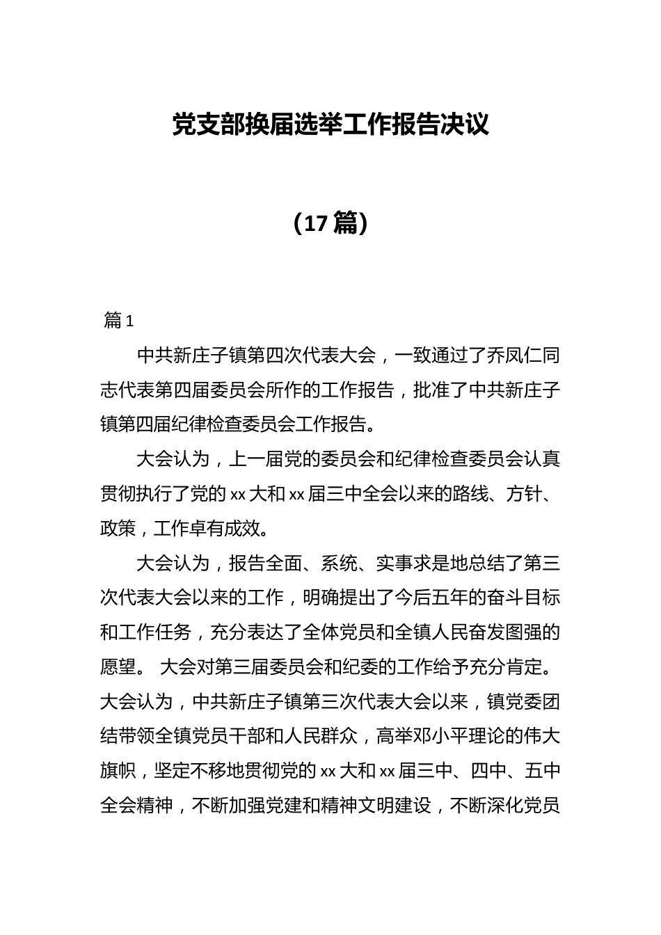 党支部换届选举工作报告决议(17篇)篇1中共新庄子镇第四次代表大会,一致通过了乔凤仁同志代表第四届委员会所作的工作报告,批准了中共新庄子镇第四届纪律检查委员会工作报告。大会认为,上一届党的委员会和纪律检查委员会认真贯彻执行了党的xx大和xx届三中全会以来的路线、方针、政策,工作卓有成效。大会认为,报告全面、系统、实事求是地总结了第三次代表大会以来的工作,明确提出了今后五年的奋斗目标和工作任务,充分表达了全体党员和全镇人民奋发图强的愿望。大会对第三届委员会和纪委的工作给予充分肯定。大会认为,中共新庄子镇第三次代表大会以来,镇党委团结带领全镇党员干部和人民群众,高举邓小平理论的伟大旗帜,坚定不移地贯彻党的xx大和xx届三中、四中、五中全会精神,不断加强党建和精神文明建设,不断深化党员干部廉政建设和反腐败工作,注重从全镇实际出发,创造性地开展各项工作,胜利完成了第三次代表大会确定的各项工作任务。大会认为,报告对我镇第三次代表大会以来的工作回顾和总结是实事求是的,既肯定了成绩,又指出了存在的问题。并且按照科学发展观的要求,确定了今后五年的工作任务和目标,符合我镇实际,既催人奋进,又切实可行。未来五年,我镇将面临严峻挑战,同时也将迎来难得发展机遇,只要我们高举邓小平理论的伟大旗帜,认真践行“三个代表”重要思想,全面贯彻落实科学发展观,以发展为主题,以社会主义新农村建设为主线,以提高人民群众生活水平为根本出发点,不断加强“三个文明”建设,不断深化党员干部廉政和反腐败工作制度建设,加强监督制约,保持办案力度,提高办案的综合效果,我们所确定的工作目标就一定能够实现。大会指出,未来五年将是我镇经济和社会各项事业快速发展的五年,我们要把握改革、发展和稳定的大局,狠抓农业产业化调整,狠抓招商引资和项目建设,努力实现全镇经济和社会各项事业的跨越式发展。大会号召全镇党的基层支部和广大党员干部,在新一届党委的领导下,进一步解放思想,进一步明确目标,团结一致,振奋精神,抢着机遇,开拓进取,为促进我镇经济和社会各项事业再上新台阶而努力奋斗。党支部换届选举工作报告决议篇2中共护河镇兴禾村党总支部委员会换届选举党员大会听取并审议了庾红玉同志代表兴禾村党总支所作的《党组织工作报告》。会议认为,过去的三年,兴禾村党总支团结带领全体党员、干部、群众,积极响应镇党委政府号召,全面落实科学发展观,坚持团结协作、积极进取、开拓创新、狠抓落实,克服制约经济社会发展的诸多困难,大力推进民生工程建设,促进了全村经济持续快速发展和社会事业全面进步。会议认为,报告对三年来工作的总结是实事求是的,提出的今后三年经济社会发展规划是切实可行的,决定批准这个报告。会议指出,今后三年是全村经济实现新突破,社会事业取得新发展,是“千方百计谋发展,倾尽全力保民生”的三年。会议要求党总支委员会要以邓小平理论和“三个代表”重要思想为指导,围绕镇党委政府经济社会发展总体格局,坚持以和谐发展为目标,加强党的建设,进一步完善村级管理机制,着力推动农业产业调整,着力保障民生,着力统筹城乡发展,推动城乡一体化建设。时刻把群众的需求作为工作的出发点、落脚点,不断开创我村各项工作的新局面。会议号召,全村人民要以、xx届三中全会精神为指导,全面贯彻落实科学发展观,积极响应镇党委政府提出的“把护河镇建成为休闲观光、旅游服务、宜居宜业的生态商贸强镇”的奋斗目标,团结一致,开拓进取,务实创新,乘势而上,为早日把兴禾村建设成“经济发展好,农民生活好,环境卫生好,社会保障好”的社会主义新农村而努力奋斗!党支部换届选举工作报告决议篇3中国共产党龙苑中学全体党员大会一致通过张小忠同志代表上一届支部委员会所作的20xx—20xx年的工作报告。大会认为,中共龙苑中学支部委员会自20xx年12月成立以来,在徐汇区教育党工委的领导下,坚持以邓小平理论、“三个代表”重要思想和科学发展观为指导,全面贯彻党的教育方针,立足本校实际,切实加强党的自身建设,确立党组织在学校工作中的政治核心地位,充分发挥党组织的战斗堡垒作...