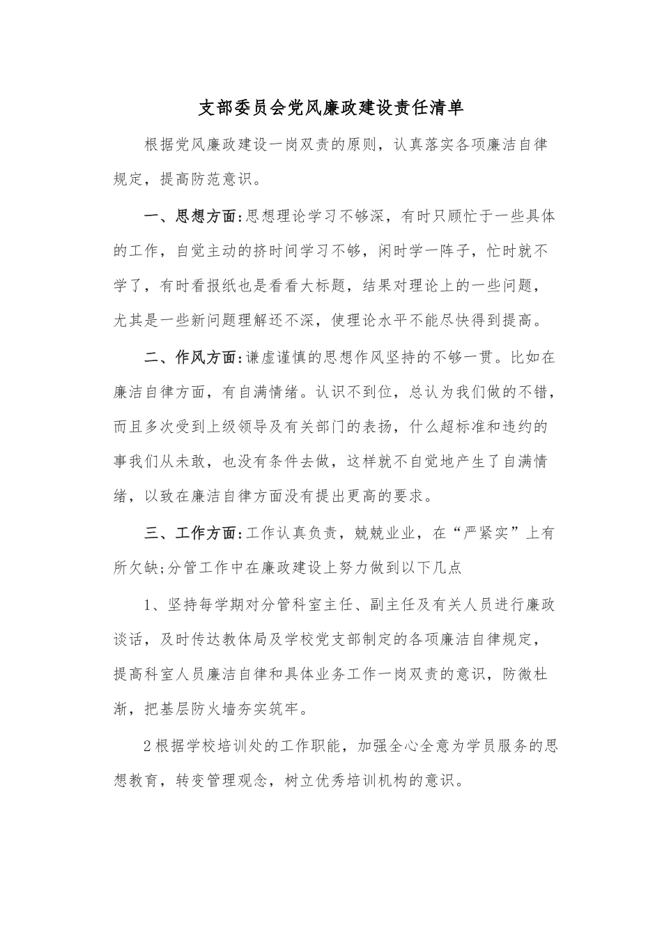 支部委员会党风廉政建设责任清单根据党风廉政建设一岗双责的原则,认真落实各项廉洁自律规定,提高防范意识。一、思想方面:思想理论学习不够深,有时只顾忙于一些具体的工作,自觉主动的挤时间学习不够,闲时学一阵子,忙时就不学了,有时看报纸也是看看大标题,结果对理论上的一些问题,尤其是一些新问题理解还不深,使理论水平不能尽快得到提高。二、作风方面:谦虚谨慎的思想作风坚持的不够一贯。比如在廉洁自律方面,有自满情绪。认识不到位,总认为我们做的不错,而且多次受到上级领导及有关部门的表扬,什么超标准和违约的事我们从未敢,也没有条件去做,这样就不自觉地产生了自满情绪,以致在廉洁自律方面没有提出更高的要求。三、工作方面:工作认真负责,兢兢业业,在“严紧实”上有所欠缺;分管工作中在廉政建设上努力做到以下几点1、坚持每学期对分管科室主任、副主任及有关人员进行廉政谈话,及时传达教体局及学校党支部制定的各项廉洁自律规定,提高科室人员廉洁自律和具体业务工作一岗双责的意识,防微杜渐,把基层防火墙夯实筑牢。2根据学校培训处的工作职能,加强全心全意为学员服务的思想教育,转变管理观念,树立优秀培训机构的意识。3、加强现金票据管理,做到和学校财务结账及时准确,每期档案数据及时归档,当事人,科室主任层层把关。4、节约培训成本。提倡节约,反对浪费。