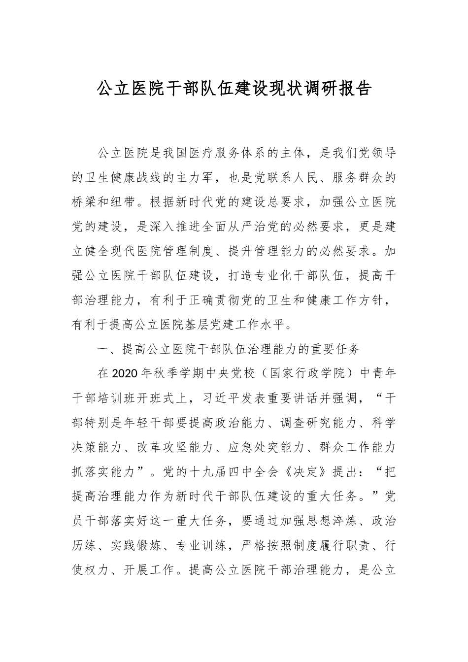 公立医院干部队伍建设现状调研报告公立医院是我国医疗服务体系的主体,是我们党领导的卫生健康战线的主力军,也是党联系人民、服务群众的桥梁和纽带。根据新时代党的建设总要求,加强公立医院党的建设,是深入推进全面从严治党的必然要求,更是建立健全现代医院管理制度、提升管理能力的必然要求。加强公立医院干部队伍建设,打造专业化干部队伍,提高干部治理能力,有利于正确贯彻党的卫生和健康工作方针,有利于提高公立医院基层党建工作水平。一、提高公立医院干部队伍治理能力的重要任务在2020年秋季学期中央党校(国家行政学院)中青年干部培训班开班式上,习近平发表重要讲话并强调,“干部特别是年轻干部要提高政治能力、调查研究能力、科学决策能力、改革攻坚能力、应急处突能力、群众工作能力抓落实能力”。党的十九届四中全会《决定》提出:“把提高治理能力作为新时代干部队伍建设的重大任务。”党员干部落实好这一重大任务,要通过加强思想淬炼、政治历练、实践锻炼、专业训练,严格按照制度履行职责、行使权力、开展工作。提高公立医院干部治理能力,是公立医院在新时代干部人才队伍建设的重大任务。思想淬炼是基础。提升干部治理能力,应思想先行。深入学习马克思主义国家治理理论,尤其要学懂弄通做实习近平新时代中国特色社会主义思想,深刻领会其先进治理理念、科学治理方法,搞清楚“为谁治理”“由谁治理”等问题,始终坚定理想信念,牢记初心使命。政治历练是根本。党员干部要牢牢把握国家治理的正确政治方向,不断锤炼忠诚干净担当的政治品格,接受政治体检、打扫政治灰尘、净化政治灵魂、增强政治免疫力努力提高把握方向、把握大势、把握全局的能力,提高辨别政治是非、保持政治定力、驾驭政治局面、防范政治风险的能力。实践锻炼是保障。治理能力只有在长期实践锻炼中才能砥砺而成。党员干部要正确处理目标引领和问题导向、建章立制和落地见效的关系,要在实践锻炼中培养“顶得住、冲得上”的能力。公立医院党员干部尤其要牢固树立“服务群众、人民至上”的理念。尤其是疫情防控,对公立医院干部治理能力就是一场“大考”。专业训练是支撑。按照“干什么学什么、缺什么补什么”的原则,公立医院有针对性地开展领导艺术、岗位业务、群众工作等务实管用的专题培训,使党员干部在专业知识和综合能力上能满足医院治理的新需求。二、公立医院干部队伍治理能力现状为进一步了解公立医院干部人才队伍治理能力建设情况,**大学医学院附属第九人民医院课题组专门设计了调研问卷,对上海市多家公立医院进行问卷调查和实地调研。课题组共发放调查问卷***份,回收有效问卷***份,回收率达到**%。从调研整体情况来看,当前公立医院干部队伍建设的整体情况良好,党员干部精神风貌积极向上,但在治理能力方面仍存在一定的不足,与党中央要求的国家治理能力现代化还存在着一定差距,需要进一步改进,主要表现有以下几方面。(一)应加强政治领导力明确内部分工、加强工作沟通、培养创新意识。增进干群信任,减少群众不满情绪,夯实群众基础,提高政治公信力。在问卷调查中,从受访者回答“您认为当前干部人才队伍治理能力与工作需要的差距”这一问题中我们可以看到,**%的受访者认为当前党员干部队伍治理能力与工作需要、组织要求和群众期盼之间的差距较大,形成领导干部提高治理能力的外在压力,同时说明在提升党员干部队伍治理能力方面还有较大的完善空间。(二)应加强思想引领力基层党组织领导干部思想引领力不强,主要表现为部分干部对工作“走过场”“搞选择”“打折扣”,存在懈怠情绪、侥幸念头和麻痹思想。在回答“您最希望参加哪方面的治理能力提升培训?”问题时,与岗位工作直接相关的专业知识的学习、党的路线方针、领导科学、方法和艺术等选项是大多数受访者认为的党员干部治理能力提升培训应该合理包含的内容。(三)应健全人才培养机制受访者在回答“您认为干部队伍治理能力提升中存在哪些问题?”时,选择较多的选项是综合素质有待提高、培养机制不够健全。这说明构建一个多层次全方面的培养机制从而提高干部队伍的综合素质是当下提升党员干部治理能力方面亟...