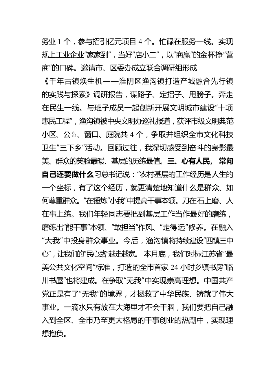 16钱子达市委网信办网络新闻信息传播处副处长,三级主任科员淮阴区渔沟镇党委副书记、副镇长(挂职)去年7月,组织上安排我到渔沟镇挂职,挂职以来,我时常问自己“该做什么,做成了什么,还要做什么”。一、头顶国徽,常问自己该做什么牢记党和国家赋予的使命,谨遵组织的嘱托。一是以“空杯”心态扎根。我怀着“归零”的心态扎根到渔沟这片热土,虚心向单位领导学、身边同志学、人民群众学、服务对象学,甘当“小学生”。二是以“昂扬”姿态干事。初到渔沟,正值疫情防控最吃紧的时候,我主动申请参与轮班值守和蹲点驻村。一直以来,做到挂职当作任职干,扎根在农村深处,奉献在基层前沿。三是以“严实”状态律己。坚持把政治标准放在首位,做到自知自律自省,知敬畏、存戒惧、守底线。二、脚沾泥土,常问自己做成了什么田间地头、工厂车间、农家小院、边防卡口,我用脚步丈量着渔沟的土地。战斗在招商一线。珍惜这次补短淬炼的难得机会,通过学习政策文件,登门请教方法,实地勘察地块,进行招商实战等,从一无所知转变为熟门熟路。历时4个月,牵头招引的瓦奥纺织亿元项目成功落地,招引规上服务业1个,参与招引亿元项目4个。忙碌在服务一线。实现规上工业企业“家家到”,当好“店小二”,以“商赢”的金杯挣“营商”的口碑。邀请市、区委办成立联合调研组形成《千年古镇焕生机——淮阴区渔沟镇打造产城融合先行镇的实践与探索》调研报告,谋路子、定招子、甩膀子。奔走在民生一线。与班子成员一起创新开展文明城市建设“十项惠民工程”,渔沟镇被中央文明办巡礼报道,获评市级文明典范小区、公♘、窗口、庭院共4个,争取并组织全市文化科技卫生“三下乡”活动。回顾过往,我深切感受到奋斗的身影最美、群众的笑脸最暖、基层的历练最值。三、心有人民,常问自己还要做什么习总书记说:“农村基层的工作经历是人生的一个坐标,有了这个经历,就更清楚地知道什么是群众、如何尊重群众。”在锤炼“小我”中提高干事本领。刀在石上磨、人在事上练。我们年轻同志要把到基层工作当作最好的磨练,磨练出“能干事”本领、“敢担当”作风、“走得远”修养。在融入“大我”中投身群众事业。今后,渔沟镇将持续建设“四镇三中心”,让我们的“民心路”越走越宽。本月底,我们对标江苏省“最美公共文化空间”标准,打造的全市首家24小时乡镇书房“临川书屋”也将建成。在争取“无我”中实现崇高理想。中国共产党正是有了“无我”的境界,才拯救了中华民族、铸就了伟大事业。一滴水只有放在大海里才不会干涸,我们要把自己融入到全区、全市乃至更大格局的干事创业的热潮中,实现理想抱负。陈平平区政协学习宣传文史资料委员会副主任不知不觉,在淮阴区工作已经13年了,结合自身实际,将个人思考感悟与大家分享:年轻干部应当坚定信念,树牢理念。理想信念就是前行的灯塔,作为一名年轻干部、民革党员,首先要系好理想信念这枚“扣子”,不忘初心,与党同行。通过不断学习,提升自己的理论素养、政治素养。不论在任何岗位,都按照“人争优秀,事争一流”的目标要求自己。工作以来,我始终将调查研究、参政议政作为自己的使命与责任,坚持在实践中不断探索,深入调研基层情况,积极建言献策,共报送各类市级以上调研文章800余篇,其中23篇获得国务院领导批示。尽管调研工作十分辛苦,要利用自己工作以外的时间加班加点完善内容,但是一旦被采用转送部门办理,就能够有利于问题的解决,更好地履行民主人士的职责,也给予了我很强的获得感。年轻干部应当关注民生,内心向阳。责重山岳,青年干部更要成为“多面手”,贴近群众,了解民情,关注民生。在平时调研中,我注重围绕党委政府中心工作和群众关心的热点难点问题,坚持实地调研民生实事,深入群众、深入一线,收集最真实的基层情况,通过提案、社情民意、调研报告等形式,及时反映基层诉求、真实反映群众意愿。要做好参政议政,既要身在兵位、胸为帅谋,深入思考提供决策参考,更要好学不倦、笃行不怠,不断汲取知识和养分。近年来,我通过走访调研,撰写报送了农业保险、小微企业税收、关爱留守儿童、残疾人就业等各类民生题材调研,为基层...