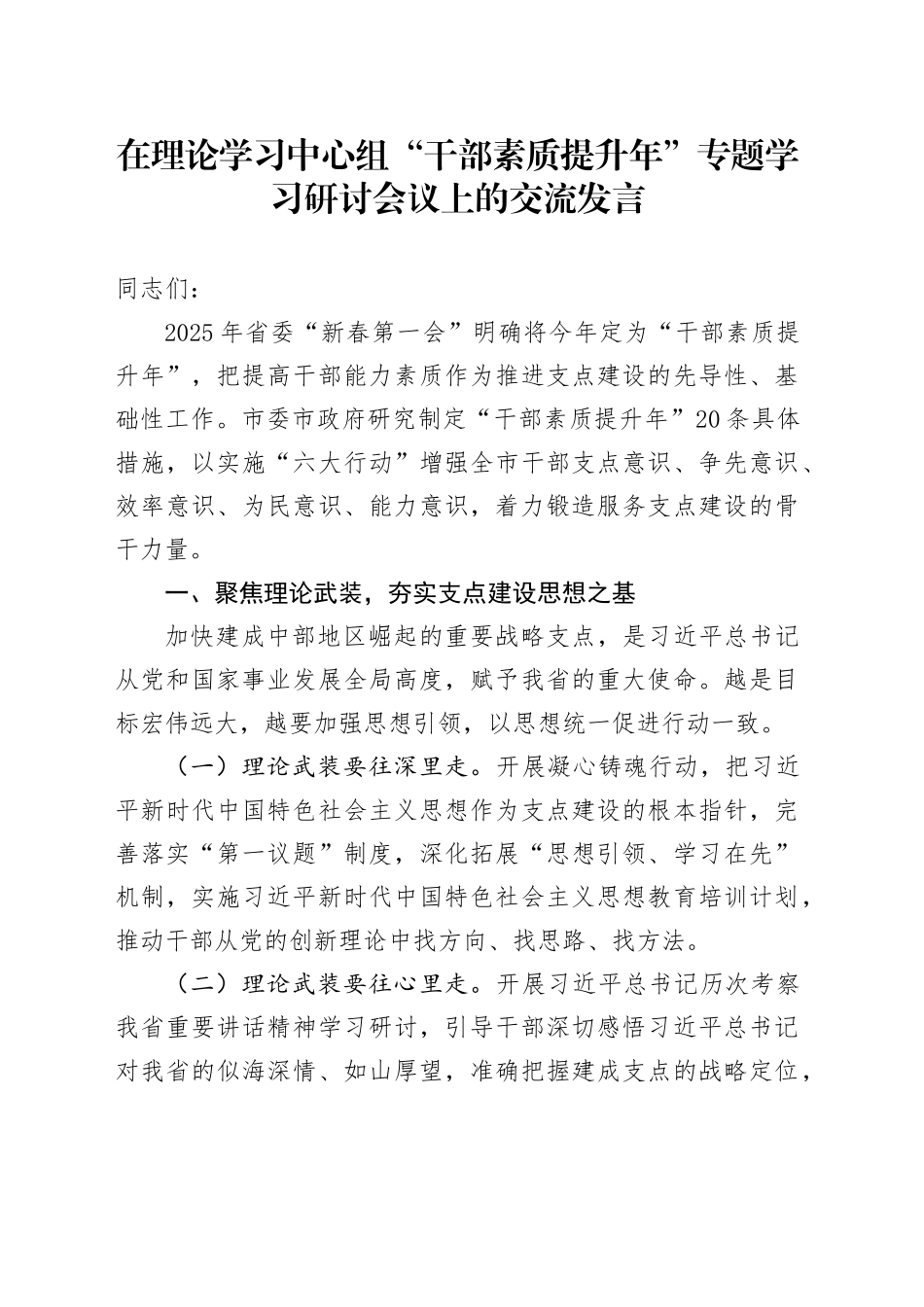 在理论学习中心组“干部素质提升年”专题学习研讨会议上的交流发言同志们:2025年省委“新春第一会”明确将今年定为“干部素质提升年”,把提高干部能力素质作为推进支点建设的先导性、基础性工作。市委市政府研究制定“干部素质提升年”20条具体措施,以实施“六大行动”增强全市干部支点意识、争先意识、效率意识、为民意识、能力意识,着力锻造服务支点建设的骨干力量。一、聚焦理论武装,夯实支点建设思想之基加快建成中部地区崛起的重要战略支点,是习近平总书记从党和国家事业发展全局高度,赋予我省的重大使命。越是目标宏伟远大,越要加强思想引领,以思想统一促进行动一致。(一)理论武装要往深里走。开展凝心铸魂行动,把习近平新时代中国特色社会主义思想作为支点建设的根本指针,完善落实“第一议题”制度,深化拓展“思想引领、学习在先”机制,实施习近平新时代中国特色社会主义思想教育培训计划,推动干部从党的创新理论中找方向、找思路、找方法。(二)理论武装要往心里走。开展习近平总书记历次考察我省重要讲话精神学习研讨,引导干部深切感悟习近平总书记对我省的似海深情、如山厚望,准确把握建成支点的战略定位,领悟我省作为“龙腰”“牛肚子”的重要性,引导党员干部把心思和精力都投入到支点建设之中,凝聚团结奋进的向心力。(三)理论武装要往实里走。围绕加快支点建设开展学习研讨,组开展织“提升支点意识、争当实干先锋”活动、“强思想、勇担当、促改革”联学交流。深入开展“比抓强争促”,对标先进、争创一流,创新模式比招商、大员上阵抓项目、突出重点强产业、全力以赴争资金、创先争优促进位。二、聚焦本领提升,育强支点建设攻坚之能从“努力建设”到“加快建成”,不仅是表述变化,更重要的是从“殷切期盼”变成“现实任务”,面对更高定位、更高标准、更高要求,党员干部必须既要政治过硬,也要本领高强。(一)要着力提升政治能力。深入实施“一把手”政治能力提升计划,举办县处级主要领导干部专题培训班,开设“两山”实践大讲堂。持续办好县市部门“一把手”、乡镇党政正职进修班和新时代年轻干部成长工程培训班,不断提高干部政治判断力、政治领悟力、政治执行力。(二)要着力提升专业能力。围绕“两区两地一枢纽”功能定位,把应对“一难两难多难”“既要又要还要”复杂局面的能力作为干部培训的重要内容,分领域制定干部专业化能力提升计划,采取理论研学、岗位跟学、异地访学等方式,提升业务骨干的专业能力。举办“经济课堂”,提升干部抓经济工作的能力。(三)要着力提升实践能力。组织干部到先进地区跟班学习,到发达地区学习历练,到行业标杆地区调研实训,引导推动干部提升思想境界,放眼全国看我市、站位大局看支点。统筹实施“六个一批”挂职锻炼,选派优秀年轻干部到驻村(社区)“尖刀班”、接访中心、重点工作专班等“三个一线”实践历练。三、聚焦组织引领,砥砺支点建设实干之力支点建设是事关全局、功在长远的大事,要强化组织引领引导广大党员干部向支点建设聚焦发力,努力把宏伟蓝图变成美好现实。(一)要以导向强动力。鲜明树立重实干、重实绩、重担当导向,细化落实“三个区分开来”,对政治能力不过硬、理想信念不坚定、斗争意识不够、事业心和责任感不强的坚决予以调整,推动形成能者上、庸者下、劣者汰的良好局面,为敢担当作为的干部撑腰鼓劲,让干部想干事、敢干事、干成事。(二)要以关爱添活力。优化完善激励关爱基层干部的相关措施,对支点建设中涌现出的先进个人(集体)开展及时奖励,积极选树和宣传先进典型。制定重点领域免责减责清单,加强诬告陷害行为联合治理,常态化开展澄清正名,激励引导广大干部在支点建设中奋勇争先。(三)要以减负增效力。贯彻落实整治形式主义为基层减负若干规定,精简文件会议,统筹规范督查检查考核,严格规范借调干部,整治“指尖上的形式主义”,制定乡镇(街道)履职事项清单,规范评比表彰、创建示范和节庆展会论坛活动,让基层干部有更多时间和精力服务群众。同志们,乘时代大势攀高,走人间正道致远。2025年是两个五年规划的交汇点,开启支点建设的新征程,...