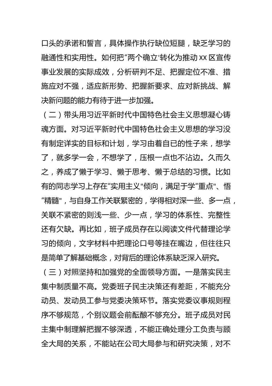 区委宣传部部长2022年度民主生活会“六个带头”对照检查材料为确保2022年度民主生活会顺利召开,我未雨绸缪,提前着手,为此做足了功课,利用自学和集中学习的机会,系统一全面、深入地学习了习近平新时代中国特色社会主义思想、习近平总书记系列重要讲话精神等。在此基础上,聚焦六个方面的主题,对照xxx精神和党规党章党纪,查问题、重分析、找差距,为今后把握定位,找准方向,努力奋斗提供了行动指南。现将个人对照检查情况报告如下:、查摆的主要问题及表现(一)在带头深刻感悟“两个确立'的决定性意义,增强“四个意识"、坚定“四个自信"、做到“两个维护'方面。一是“两个确立"深度探索不够。对“两个确立"的重要意义,停顿在字面的理解和感悟上,认识浅薄,思路狭窄,方法老套,没有拿出打破砂锅问到底的精神,追根溯源、寻根问底,缺乏“吾将上下而求索"的探索精神,分析研究学、拓展延伸学、深度思考学不够,在实、精、细方面做得不够到位,致使对“两个确立"实践意义和理论精髓领悟得不深不透、理解的不全不强。二是“两个确立"的实践运用不足。虽然能够粗浅地认识到“两个确立"的重要意义,自觉增强“四个意识",坚定“四个自信",做到“两个维护",但往往流于形式,注重口头的承诺和誓言,具体操作执行缺位短腿,缺乏学习的融通性和实用性。如何把“两个确立'转化为推动XX区宣传事业发展的实际成效,分析研判不足、把握定位不准、措施应对不强,适应新形势、把握新要求、应对新挑战、解决新问题的能力有待于进一步加强。(二)带头用习近平新时代中国特色社会主义思想凝心铸魂方面。对习近平新时代中国特色社会主义思想的学习没有制定详实的目标和计划,学习由着自已的性子来,想学了,就多学一会,不想学了,压根一点也不沾边。久而久之,养成了懒于学习、懒于思考、懒于总结的习惯。比如有的同志学习上存在“实用主义"倾向,满足于学“重点"、悟“精髓",与自身工作关联緊密的,学得相对深一些、多一点,关联不紧密的则浅一些、少一点,学习的体系性、完整性还有欠缺。再比如,班子成员存在以阅读文件代替理论学习的倾向,文字材料中把理论口号等挂在嘴边,但往往只是简单了解基础概念,对背后的理论体系缺乏深入研究。(三)对照坚持和加强党的全面领导方面。一是落实民主集中制质量不高。党委班子民主决策还有差距,不能充分动员、发动员工参与党委决策环节。落实党委议事规则程序不够规范,个别议题会前酝酿不够充分。班子成员对民主集中制理解把握不够深透,不能正确处理分工负责与顾全大局的关系,不能站在公司大局参与和研究决策,对不分管的工作和不熟悉的领域,缺乏学习研究,不能提出高质量的意见建议。二是党员先锋模范作用不够突出。个别党员干部不注重加强一学习和党性锤炼,初心和使命意识不强,工作不够积极主动。有的把自己等同于普通员工,平时只关注本职工作,对公司建设、业务发展、组织生活、理论学习不太关心。个别党员自身要求不严,能力素质不强,在日常管理和业务工作上,模范带头作用不突出不明显。(四)在带头坚持以人民为中心的发展思想,推动改革发展稳定方面。一是践行以人民为中心的发展思想不够到位宗旨意识不够牢固,没有真正把以人民为中心的发展思想融入到公司建设、业务发展的全过程。贯彻落实群众路线不深入,从员工的创造性实践中总结发展经验,谋划发展思路向员工问计,查找发展中的问题听取员工意见,改进发展措施向员工请教,推动高质量发展依靠员工共同努力落实不够到位、坚持不够经常,以员工为本的理念还没有真正落实到公司建设中。二是贯彻新发展理念不够到位。近年来,**集团公司和**总公司推动公司和业务转型发展,提出了一系列战略思想、未来发展思路和发展路径。但公司党委对如何贯彻落实“"等新理念新要求,研究思考不够深入。在公司建设上,更多着眼于落实上级任务、完成年度目标、推进当前工作,对如何推进**公司转型发展,如何提高公司业绩,如何提高员工能力素质,如何培养储备干部,缺乏前瞻性的思考和深层次的研究,没有详细规划和具体措施。(五)在带头发扬斗争精神,防范化解风险挑战方面。能够坚持底...