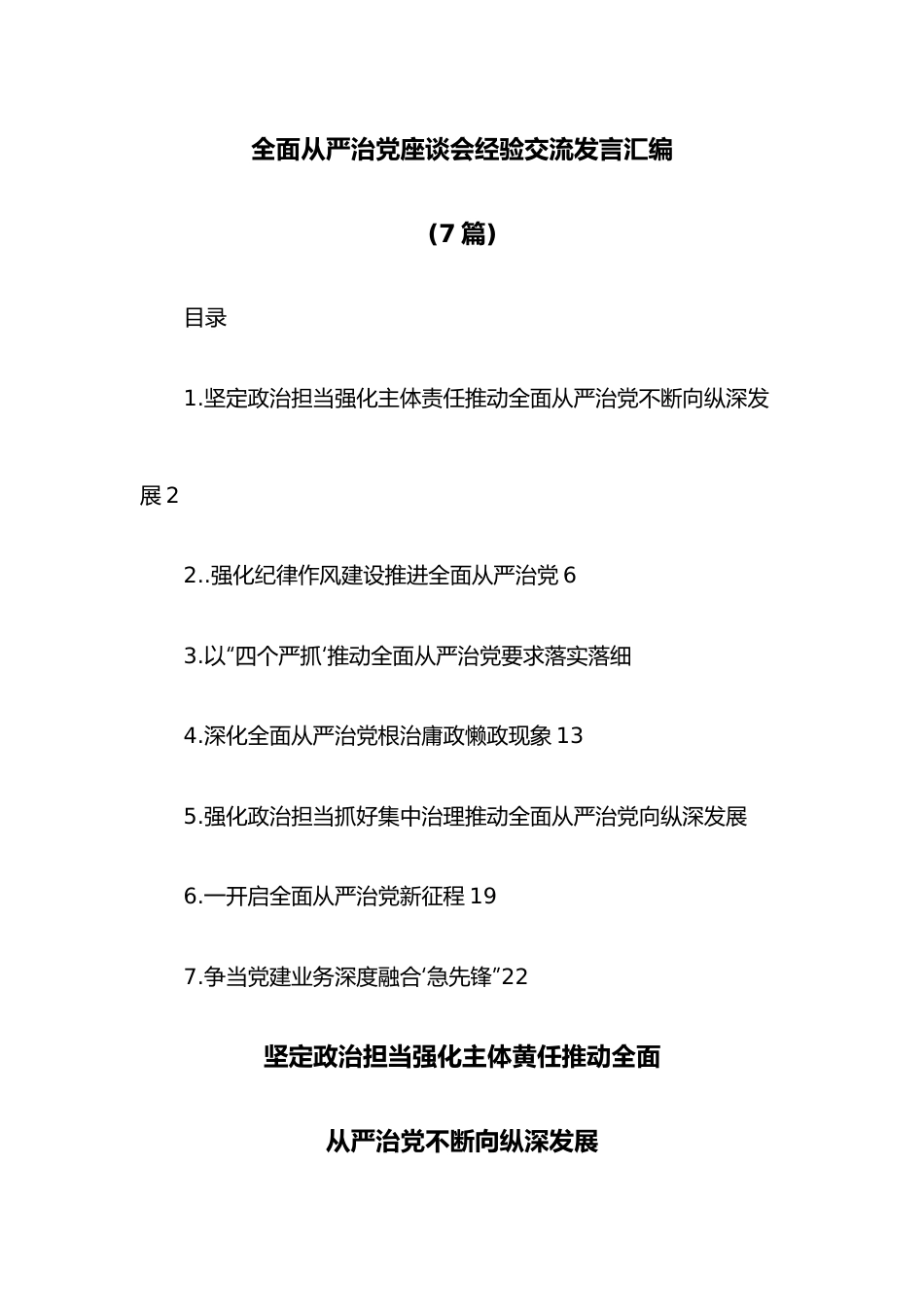 全面从严治党座谈会经验交流发言汇编(7篇)目录1.坚定政治担当强化主体责任推动全面从严治党不断向纵深发展22..强化纪律作风建设推进全面从严治党63.以“四个严抓‘推动全面从严治党要求落实落细4.深化全面从严治党根治庸政懒政现象135.强化政治担当抓好集中治理推动全面从严治党向纵深发展6.一开启全面从严治党新征程197.争当党建业务深度融合‘急先锋”22坚定政治担当强化主体黄任推动全面从严治党不断向纵深发展今年,中共中央办公厅印发了《党委(党组)落实全面从严治党主体责任规定》,这是党中央健全全面从严治党责任制度的重要举措。党委主体责任履行到位不到位,关键在于一把手。新时代、新征程,基层各级党委书记要强化政治担当、责任担当、斗争担当,坚定不移把全面从严治党引向深入,为决战决胜脱贫攻坚、全面建成小康社会提供坚强政治保证。一要坚定信念,提高履责担当的政治自觉。党的十九大强调,党的政治建设是党的根本性建设,决定党的建设方向和效果。必须进一步提高政治站位和政治觉悟,带头树牢“四个意识坚定“四个自信”,坚决做到“两个维护”,盯紧做实第一责任,在落实主体责任上亲力亲为,重要工作亲自部署、重大问题亲自过问、重要事项亲自批办、重大案件亲自督导,把管党治党与落实习近平总书记两次视察唐山的讲话精神紧密结合,把党的政治建设与中心工作紧密结合。去年,xx县委xx次召开县委常委会议,研究部署全面从严治党工作,将管党治党与打好“三张优势牌L实现“六大新突破”和开展“全省山区社会治理样板区”“国家生态文明建设示范区”建设等目标任务一同谋划部署推进,以政治生态的持续净化,推动各项工作相互促进。二要武装头脑,加强管党治党的思想引领。只有以党的理论知识武装头脑,才能更好地指导管党治党。对此,xx县委始终把加强党的政治建设摆在首位,坚持县级干部带头,组织全县xx万名党员干部读原著、学原文、悟原理,巩固“不忘初心、牢记使命”主题教育成果,推进学习教育制度化常态化。主题教育活动中,举办县委理论学习中心组读书班,县委书记全程参加x天集中封闭学习研讨,并先后以“旗帜鲜明讲政治”和“新时代如何当好一个称职的村干部”为题,两次亲自开展专题党课教育,培训县乡村干部xxxx多人次,激励党员干部坚守初心使命,夯实思想基础。三要服务人民,贯彻以人民为中心的发展理念。民心是最大的政治,是党领导和执政的最宝贵资源,是正风肃纪反腐的根本政治立场。必须把解决人民群众反映最强烈的痛点难点、最急最优最盼问题作为重中之重,在谋划推动工作中,关注民生、维护民利、凝聚民心;研究项目引进时,将不损害群众利益作为前置条件;推进重点工作中,始终维护大多数人的利益。近年来,xx县委紧盯脱贫攻坚、生态建设、疫情防控等重点领域和工作,先后开展“主题教育进万家、为民服务解难题”、、“我和群众在一起,共同防控抗疫情”等专项行动,以及“徒步走xx*、“志愿服务、机关先行”、贫困户”等走访活动,完成xx项县级民心工程和惠民实事;“遍访聚焦漠视侵害群众利益问题,分别在扶贫、民生、环保等领域开展专项整治,推动解决村民用电难、出行难、饮水难、救治难等具体问题xxx个,锤炼了党员干部党性党风,确保了党中央各项惠民政策落地见效。四要抓牢“关键少数”,维护选人用人的正确导向。必须牢牢抓住下级党组织一把手这个“牛鼻子”,充分发挥以上率下、以上督下的作用。认真执行《中国共产党党内监督条例》,坚持任前廉政谈话、任中廉政提醒、离任审计监督并重,综合运用谈心谈话、检查抽查、指导民主生活会、受理信访举报、督促巡察整改等方法,近距离对下级一把手进行常态化监督。xx县委高度重视选人用人导向,严格落实新时期好干部标准,按照“三看”“三到”“三破”用人原则,突出政治标准,把干部敢于担当、主动作为、实绩突出作为重要依据;特别在选任“一把手”时,坚持在急难险重任务中考验观察在一线发现人才、任用人才。同时,培树马行晓、韩宏升、刘文福等一批省市先进典型,形成良好的示范效应,增强基层党组织的凝聚力和战斗力。五要敢于斗争,保持正风肃纪的高压态势。必须保持战略定力和政...