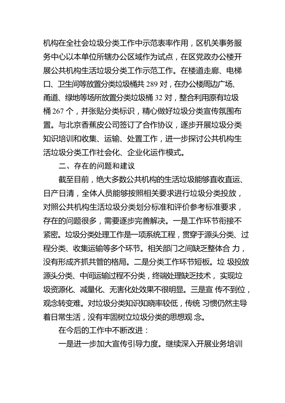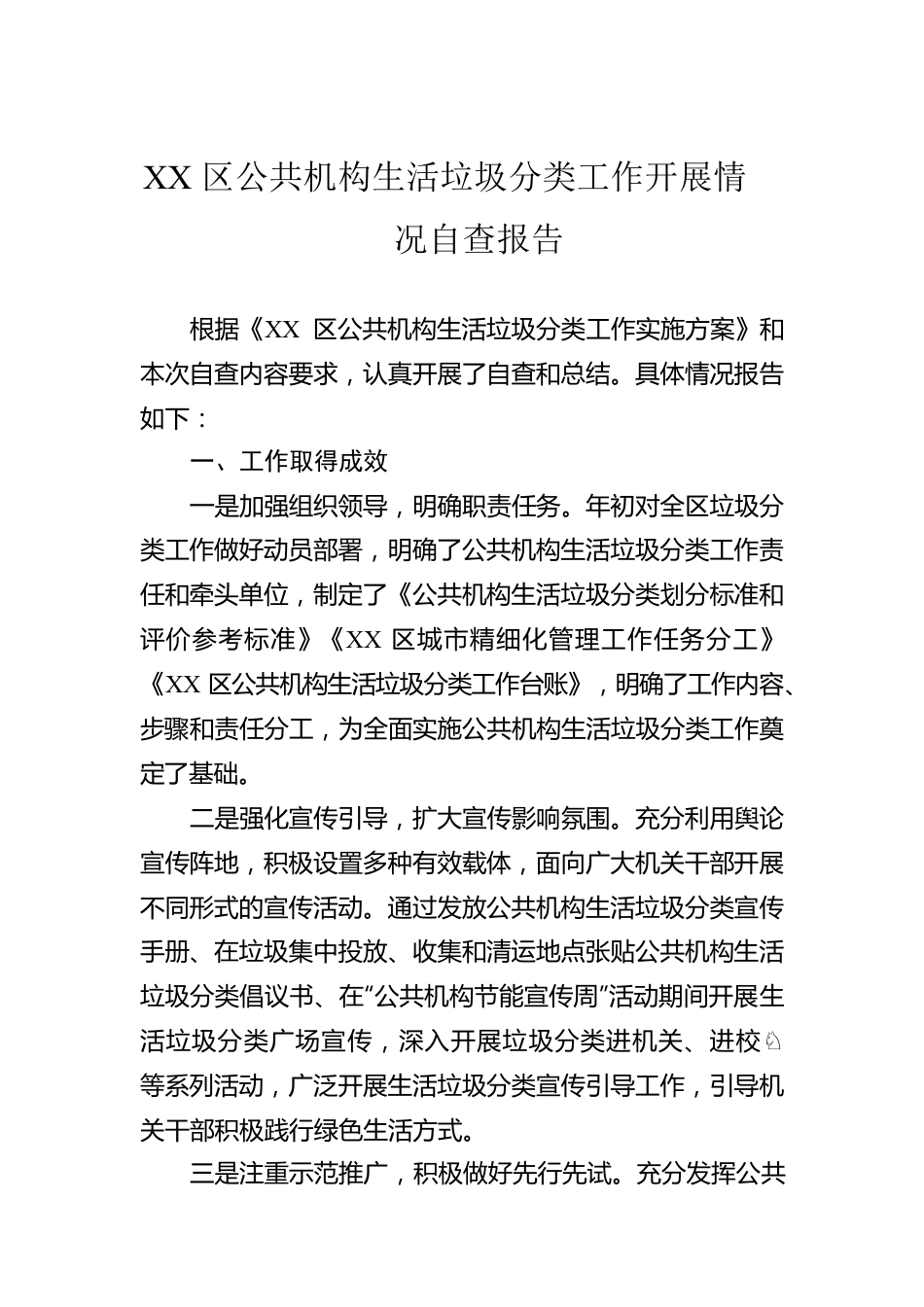XX区公共机构生活垃圾分类工作开展情况自查报告根据《XX区公共机构生活垃圾分类工作实施方案》和本次自查内容要求,认真开展了自查和总结。具体情况报告如下:一、工作取得成效一是加强组织领导,明确职责任务。年初对全区垃圾分类工作做好动员部署,明确了公共机构生活垃圾分类工作责任和牵头单位,制定了《公共机构生活垃圾分类划分标准和评价参考标准》《XX区城市精细化管理工作任务分工》《XX区公共机构生活垃圾分类工作台账》,明确了工作内容、步骤和责任分工,为全面实施公共机构生活垃圾分类工作奠定了基础。二是强化宣传引导,扩大宣传影响氛围。充分利用舆论宣传阵地,积极设置多种有效载体,面向广大机关干部开展不同形式的宣传活动。通过发放公共机构生活垃圾分类宣传手册、在垃圾集中投放、收集和清运地点张贴公共机构生活垃圾分类倡议书、在“公共机构节能宣传周”活动期间开展生活垃圾分类广场宣传,深入开展垃圾分类进机关、进校♘等系列活动,广泛开展生活垃圾分类宣传引导工作,引导机关干部积极践行绿色生活方式。三是注重示范推广,积极做好先行先试。充分发挥公共机构在全社会垃圾分类工作中示范表率作用,区机关事务服务中心以本单位所辖办公区域作为试点,在区党政办公楼开展公共机构生活垃圾分类工作示范工作。在楼道走廊、电梯口、卫生间等放置分类垃圾桶共289对,在办公楼周边广场、甬道、绿地等场所放置分类垃圾桶32对,整合利用原有垃圾桶267个,并张贴分类标识,精心做好垃圾分类宣传氛围布置。与北京香蕉皮公司签订了合作协议,逐步开展垃圾分类知识培训和收集、运输、处置工作,进一步探讨公共机构生活垃圾分类工作社会化、企业化运作模式。二、存在的问题和建议截至目前,绝大多数公共机构的生活垃圾能够直收直运、日产日清,全体人员能够按照相关要求进行垃圾分类投放,对照公共机构生活垃圾分类划分标准和评价参考标准要求,存在的问题很多,需要逐步完善解决。一是工作环节衔接不紧密。垃圾分类处理工作是一项系统工程,贯穿于源头分类、过程分类、收集运输等多个环节。相关部门之间缺乏整体合力,没有形成齐抓共管的格局。二是分类工作环节短板。垃圾投放源头分类、中间运输过程不分类,终端处理缺乏技术,实现垃圾资源化、减量化、无害化处效果不很明显。三是宣传不到位,观念转变难。对垃圾分类知识知晓率较低,传统习惯仍然主导着日常生活,没有牢固树立垃圾分类的思想观念。在今后的工作中不断改进:一是进一步加大宣传引导力度。继续深入开展业务培训等形式多样的宣传教育活动,在机关内部营造良好的垃圾分类减量氛围。二是进一步加大日常执行力度。对少数职工参与垃圾分类的主动性不足、分类投放质量较差的情况,及时进行现场提醒、劝导,使广大工作人员入心入脑,形成自觉。三是党员干部示范先行。开展“垃圾分类、党员先行”主题党日活动,按照全区公共机构生活垃圾分类相关精神,进一步加大宣传力度,采取更有力的措施,确保各单位生活垃圾分类工作做精做细,在全区起到示范作用。