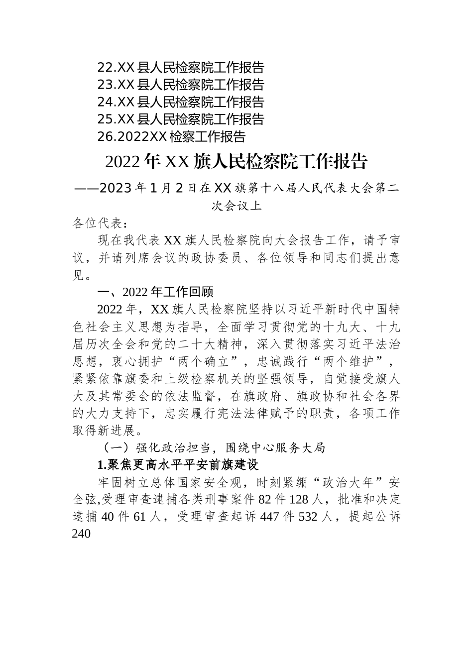 2022年人民检察院工作报告汇编(26篇)目录1.2022年XX旗人民检察院工作报告2.2022年XX区人民检察院工作报告3.2022年XX市人民检察院工作报告4.2022年XX县人民检察院工作报告5.2023年XX市人民检察院工作报告6.XX区人民检察院工作报告7.XX市人民检察院工作报告8.XX市XX区人民检察院工作报告9.XX市XX区人民检察院工作报告10.XX市XX区人民检察院工作报告11.XX市人民检察院2022年度工作报告12.XX市人民检察院2023年工作报告13.XX市人民检察院工作报告14.XX市人民检察院工作报告15.XX市人民检察院工作报告16.XX市人民检察院工作报告17.XX市人民检察院工作报告18.XX市人民检察院工作报告19.XX市人民检察院工作报告20.XX县人民检察院二〇二二年检察工作报告21.XX县人民检察院工作报告22.XX县人民检察院工作报告23.XX县人民检察院工作报告24.XX县人民检察院工作报告25.XX县人民检察院工作报告26.2022XX检察工作报告2022年XX旗人民检察院工作报告——2023年1月2日在XX旗第十八届人民代表大会第二次会议上各位代表:现在我代表XX旗人民检察院向大会报告工作,请予审议,并请列席会议的政协委员、各位领导和同志们提出意见。一、2022年工作回顾2022年,XX旗人民检察院坚持以习近平新时代中国特色社会主义思想为指导,全面学习贯彻党的十九大、十九届历次全会和党的二十大精神,深入贯彻落实习近平法治思想,衷心拥护“两个确立”,忠诚践行“两个维护”,紧紧依靠旗委和上级检察机关的坚强领导,自觉接受旗人大及其常委会的依法监督,在旗政府、旗政协和社会各界的大力支持下,忠实履行宪法法律赋予的职责,各项工作取得新进展。(一)强化政治担当,围绕中心服务大局1.聚焦更高水平平安前旗建设牢固树立总体国家安全观,时刻紧绷“政治大年”安全弦,受理审查逮捕各类刑事案件82件128人,批准和决定逮捕40件61人,受理审查起诉447件532人,提起公诉240件282人。积极投入命案防控工作,强化提前介入引导侦查,保护国有、集体财产,维护人民群众合法权益,全年提起公诉侵犯公民人身权利、民主权利犯罪27件31人,侵犯财产犯罪25件31人,危害公共安全犯罪158件160人持续净化社会风气,提起公诉涉“黄赌毒”类妨害社会管理秩序犯罪18件42人。积极推进打击整治养老诈骗专项行动,以群众听得懂、听得进的方式大力开展反诈宣传。2.全力以赴投入疫情防控工作严格落实XX旗疫情防控指挥部统一部署,把疫情防控前沿阵地作为践行初心使命、展现责任担当的“试金石”和“磨刀石”,党员领导干部冲锋在前,积极参与一线联防联控,以“关键少数”示范带动“绝大多数”,构筑起同心同德同力抗击疫情的坚强堡垒。自三月份以来,我院77名干警先后参与了高速公路卡口防疫执勤、集中隔离点志愿服务、包联小区疫情防控值班值守及保障工作、返乡人员转运以及非静默状态和静默状态下的每一轮区域核酸检测,真正做到了在关键时刻站得出、顶得上、靠得住。3.多举措优化法治化营商环境提起公诉破坏市场经济秩序犯罪7件13人,维护市场主体合法权益,促进改善营商环境。对民企负责人涉经营类犯罪,作出相对不起诉决定1人,努力维护企业正常生产经营。以全区政法机关“迎接二十大、优化法治化营商环境、服务保障高质量发展”大讨论活动为契机,“请进来”与“走出去”相结合为企业纾困解难。通过走访企业,了解到察尔森水库周边村屯倾倒生活垃圾和残余农药垃圾,存在对水质造成污染制约相关产业经济发展的隐患,召开公益诉讼诉前磋商座谈会,向察尔森镇政府制发检察建议,督促履职。4.接续助力推进乡村振兴战略向阿力得尔苏木两个嘎查村派驻驻村干部5人,投入人员经费30.57万元,驻村工作队一以贯之扛稳压实帮扶职责,团结配合村“两委”开展好各项工作,紧盯群众所急所需在办实事上有力有效。依托乡村振兴“晓景计划”,党组书记走访结对帮带“领军人才”,并解决帮带对象实际问题。推进“干部到乡”工程,全院干警深入帮扶村包联到户,了解结对家庭基本情况,听取意见建议,干部群众关系进一步密切,凝聚“一家人、一条心、一盘棋、一起拼”的共识。(二)以民心为检心,增进社会治理效能1.用心呵护未成年人成长扎实履行未成年...