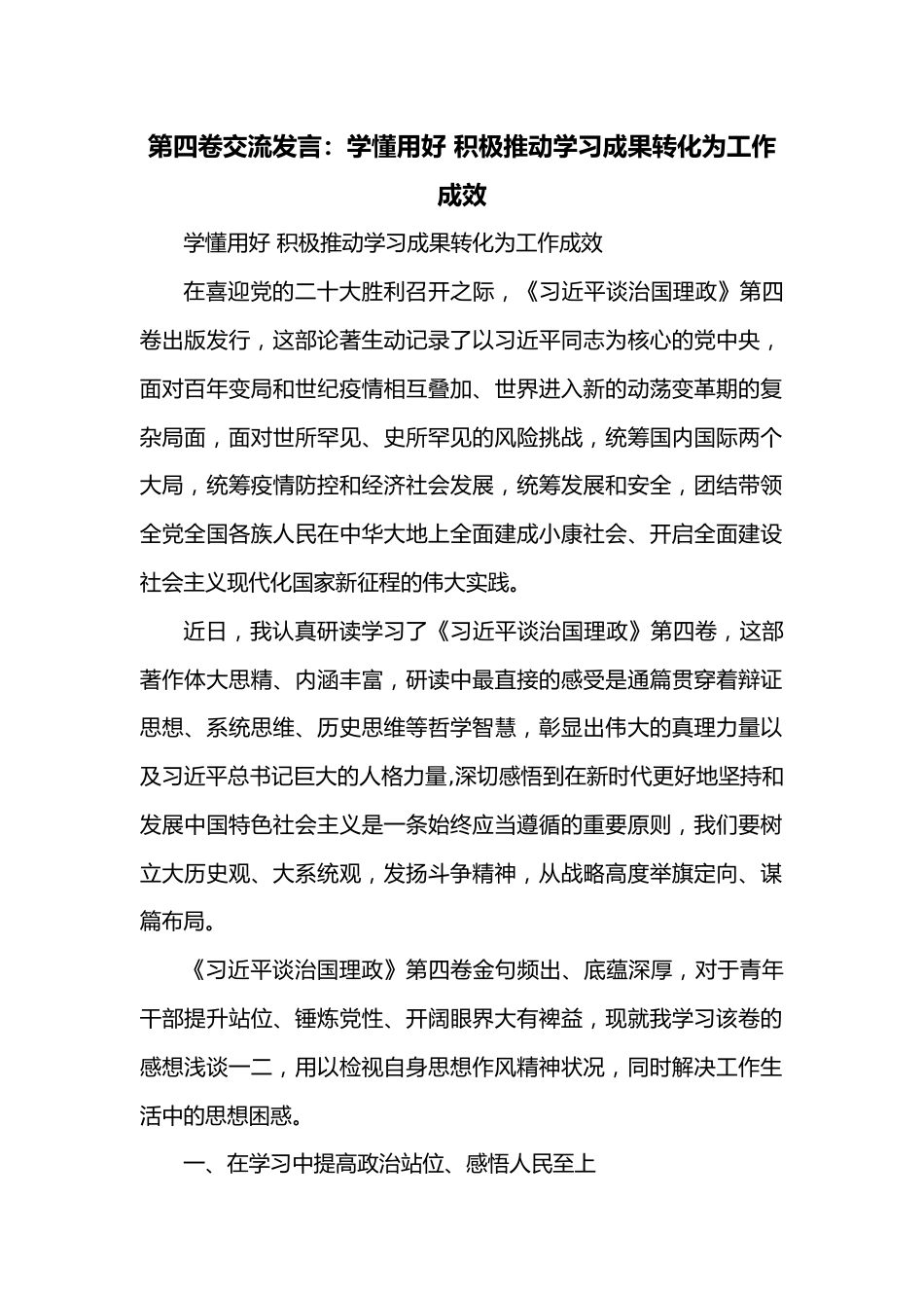 第四卷交流发言:学懂用好积极推动学习成果转化为工作成效学懂用好积极推动学习成果转化为工作成效在喜迎党的二十大胜利召开之际,《习近平谈治国理政》第四卷出版发行,这部论著生动记录了以习近平同志为核心的党中央,面对百年变局和世纪疫情相互叠加、世界进入新的动荡变革期的复杂局面,面对世所罕见、史所罕见的风险挑战,统筹国内国际两个大局,统筹疫情防控和经济社会发展,统筹发展和安全,团结带领全党全国各族人民在中华大地上全面建成小康社会、开启全面建设社会主义现代化国家新征程的伟大实践。近日,我认真研读学习了《习近平谈治国理政》第四卷,这部著作体大思精、内涵丰富,研读中最直接的感受是通篇贯穿着辩证思想、系统思维、历史思维等哲学智慧,彰显出伟大的真理力量以及习近平总书记巨大的人格力量,深切感悟到在新时代更好地坚持和发展中国特色社会主义是一条始终应当遵循的重要原则,我们要树立大历史观、大系统观,发扬斗争精神,从战略高度举旗定向、谋篇布局。《习近平谈治国理政》第四卷金句频出、底蕴深厚,对于青年干部提升站位、锤炼党性、开阔眼界大有裨益,现就我学习该卷的感想浅谈一二,用以检视自身思想作风精神状况,同时解决工作生活中的思想困惑。一、在学习中提高政治站位、感悟人民至上当今社会,国际形势风云变幻、复杂严峻,百年未有之变局与世纪疫情相互叠加,国家大事要事多、急事难事多,中国共产党正在经历历史上极不寻常、极不平凡的一个时期。我们党之所以能够团结带领人民如期实现第一个百年奋斗目标、阔步开启向第二个百年奋斗目标进军的新征程,靠的就是从党的百年奋斗历程中汲取的智慧和力量。始终在思想上政治上行动上同党中央保持高度一致,对“国之大者”领悟到位,工作起来才能更有预见性和主动性。法院作为维护公平正义的最后一道防线,法院干警更应该把人民群众的利益放在第一位,时刻牢记“共产党就是给人民办事的”,执法办案中事事为民着想、从个案正义中凝练司法的公正,才能将人民至上的理念融入到本职工作中,也才能依靠人民群众取得更长久更稳固的胜利。二、在学习中锤炼高尚品质、坚定理想信念理想信念是中国共产党人的精神支柱和政治灵魂,也是保持党的团结统一的思想基础。坚定理想信念,坚守共产党人的精神追求,始终是共产党人安身立命的根本。在我们党100年的历史中,一代又一代共产党人为了追求民族独立和人民解放,不惜流血牺牲,靠的就是一种信仰,为的就是一个理想。在革命战争年代,检验一个干部理想信念坚定不坚定,就看他能不能为党和人民事业舍生忘死,能不能冲锋号一响就立即冲上去,这样的检验很直接。在如今的和平年代,我们不用经历流血牺牲,但能否对工作极端负责,能否做到吃苦在先、享受在后,能否在急难险重任务面前勇挑重担,依然是检验一名干部是否有理想追求的重要标尺。觉悟看似无形,但在关键时刻就能明心见性;理想信念不是虚无缥缈的纸上文字,更不是用来装点门面的政治说辞。面对2019年以来全球性的新冠疫情,我院青年干警主动下沉社区支援疫情防控工作,组建党员志愿服务队,坚持24小时在岗,牺牲休息时间全力配合医护人员做好群众服务工作,这正是青年干部坚定理想信念、勇挑责任重担的集中体现。三、在学习中锻造过硬本领、推动工作实践坚持一切从实际出发,是我们想问题、作决策、办事情的出发点和落脚点。党的十八大之后,习近平总书记明确提出“严以修身、严以用权、严以律己,谋事要实、创业要实、做人要实”,只有坚持实事求是的态度,才能避免做事浮于表面、流于形式。习总书记指出,要了解实际,就要掌握调查研究这个基本功,要把调查研究做深做实,要眼睛向下、脚步向下、经常扑下身子、沉到一线,近的远的都要去,好的差的都要看,干部群众表扬和批评都要听,真正把情况摸实摸透。结合当前的审判工作,平日里大多就案办案,未能够及时总结案件中的共性特征,很多案件情况仅通过打电话、发微信、看材料等方式了解,没有现场看、当面听、直接问,审理案件过程中发现的具有调研价值的问题也没能及时深入调查研究。如习总书记所言,那些花拳绣腿、不干实事的人,那些好大...