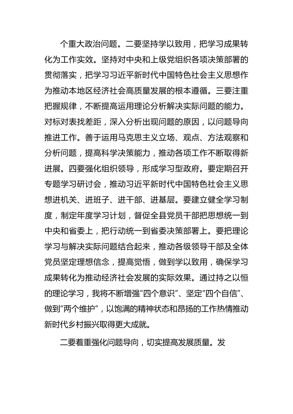 县委书记关于第二批主题教育研讨交流:持续推动检视整改切实提高发展质量(2029字)在这次主题教育学习中,我深切感受到习近平新时代中国特色社会主义思想不仅包括了治国理政的重大理论和策略,还贯穿了中国共产党人的政治品格、价值追求、精神境界和作风要求,包含着深厚的真理力量、实践力量和人格力量,增强了我对党的创新理论在政治认同、思想认同、理论认同和情感认同方面的认识。我坚持读原著、学原文、悟原理,进一步加深了对“学思想、强党性、重实践、建新功”总要求的理解,受到很大感染和启发。一要高度重视理论学习,切实提升学习实效。理论学习和理论武装对一名党员领导干部来说至关重要。作为一名县委书记,我深知唯有系统学习、深入领会习近平新时代中国特色社会主义思想,才能在思想上政治上行动上与以习近平同志为核心的党中央保持高度一致,才能在推动本地区高质量发展进程中发挥更大作用。一要不断提高政治站位,把学习习近平新时代中国特色社会主义思想作为首要政治任务。要带头学习贯彻习近平总书记系列重要讲话精神,深刻领会“两个确立”的决定性意义,增强“四个意识”、坚定“四个自信”、做到“两个维护”。要统一思想,提高认识,进一步明确新时代坚持和发展什么样的中国特色社会主义,怎样坚持和发展中国特色社会主义这个重大政治问题。二要坚持学以致用,把学习成果转化为工作实效。坚持对中央和上级党组织各项决策部署的贯彻落实,把学习习近平新时代中国特色社会主义思想作为推动本地区经济社会高质量发展的根本遵循。三要注重把握规律,不断提高运用理论分析解决实际问题的能力。对标对表找差距,深入分析出现问题的原因,以问题导向推进工作。善于运用马克思主义立场、观点、方法观察和分析问题,提高科学决策能力,推动各项工作不断取得新进展。四要强化组织领导,形成学习型政府。要定期召开专题学习研讨会,推动习近平新时代中国特色社会主义思想进机关、进班子、进干部、进基层。要建立健全学习制度,制定年度学习计划,督促全县党员干部把思想统一到中央和省委上,把行动统一到省委决策部署上。要把理论学习与解决实际问题结合起来,推动各级领导干部及全体党员坚定理想信念,提高觉悟,做到学以致用,确保学习成果转化为推动经济社会发展的实际效果。通过持之以恒的理论学习,我将不断增强“四个意识”、坚定“四个自信”、做到“两个维护”,以饱满的精神状态和昂扬的工作热情推动新时代乡村振兴取得更大成就。二要着重强化问题导向,切实提高发展质量。发展是一个解决问题的过程。我县要实现高质量发展,必须坚持以人民为中心的发展思想,坚持问题导向,紧盯民生短板和发展瓶颈,集中力量攻坚克难。一要广泛听取民声,深入了解群众所思所想。各级领导干部要深入基层深入群众,时刻与人民群众保持同频共振、同呼吸共命运要注重发挥基层党组织作用,充分运用党群服务中心、第一书记等平台,及时掌握民意动向。要善于利用大数据手段,广泛收集民意信息,一手抓好民意信息采集,一手抓好民意意见分析研判。二要坚持问题导向,找准发展着力点。要聚焦制约发展的“卡脖子”难题,准确找到问题的症结所在。要运用系统化思维和辩证思维,深入分析出现问题的根源,提出针对性强、可操作性强的对策举措。各级各部门要主动作为、积极担当,形成工作合力,一方面着力解决发展过程中暴露出的问题,另一方面抓好重点工作和重大项目推进。三要强化考核问效,促进工作落地见效。各级领导干部要提高政治站位,增强做好工作的思想自觉和行动自觉。要强化政治责任和工作责任,抓好部门之间的协同配合。要注重过程管理和结果评估,完善绩效考核办法,强化对目标任务完成情况的过程性监测,确保各项工作措施落地见效。通过强化问题导向和目标导向,我县将不断提高发展工作的科学性、系统性和针对性,着力提高发展质量和效益,让发展成果更多更公平惠及全县人民三要持续推动检视整改,切实解决实际问题。新形势下,我县要深入贯彻新发展理念,坚持以人民为中心的发展思想,必须坚持以整改推动工作,持续推动各项工作向纵深发展。一要强化整改的自觉性。各级领导...