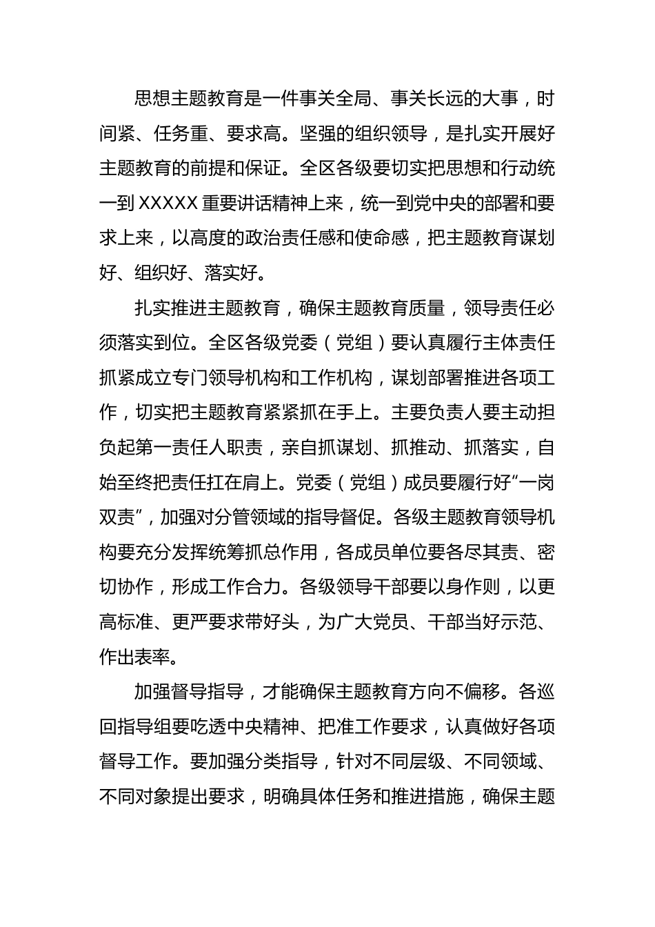 学习贯彻党内主题教育精神读书班交流发言汇编(10篇)目录学习贯彻党内主题教育精神读书班交流发言汇编(10篇).........................................................................1以强有力的组织领导保证扎实开展..........................2以学铸魂,坚定理想信念......................................5以习XXXXX思想的世界观和方法论推动企业高质量发展............................................................................9学好用好科学的世界观和方法论打造新时代社会主义现代化国际大都市的重要一极....................................12向问题开刀为发展开路.......................................16牢牢把握“六个必须坚持”推动分管领域各项工作走在前作表率...................................................................19用思想之光照亮机关党的建设高质量发展奋进之路..23深刻领悟“六个必须坚持”核心要义走好中国式现代化职教之路...................................................................27修好主题教育这门必修课....................................31深刻认识开展主题教育的重大意义34以强有力的组织领导保证扎实开展开展学习贯彻习XXXXX思想主题教育是一件事关全局、事关长远的大事,时间紧、任务重、要求高。坚强的组织领导,是扎实开展好主题教育的前提和保证。全区各级要切实把思想和行动统一到XXXXX重要讲话精神上来,统一到党中央的部署和要求上来,以高度的政治责任感和使命感,把主题教育谋划好、组织好、落实好。扎实推进主题教育,确保主题教育质量,领导责任必须落实到位。全区各级党委(党组)要认真履行主体责任抓紧成立专门领导机构和工作机构,谋划部署推进各项工作,切实把主题教育紧紧抓在手上。主要负责人要主动担负起第一责任人职责,亲自抓谋划、抓推动、抓落实,自始至终把责任扛在肩上。党委(党组)成员要履行好“一岗双责”,加强对分管领域的指导督促。各级主题教育领导机构要充分发挥统筹抓总作用,各成员单位要各尽其责、密切协作,形成工作合力。各级领导干部要以身作则,以更高标准、更严要求带好头,为广大党员、干部当好示范、作出表率。加强督导指导,才能确保主题教育方向不偏移。各巡回指导组要吃透中央精神、把准工作要求,认真做好各项督导工作。要加强分类指导,针对不同层级、不同领域、不同对象提出要求,明确具体任务和推进措施,确保主题教育扎实有效推进。要及时反映各地区各部门各单位工作动态,鼓励探索创造务实管用的载体,推进内容、形式、方法创新,增强主题教育的针对性和实效性。要把防止形式主义作为督导指导的重点,实打实地开展工作,坚决杜绝形式化、套路化、表面化那一套。推深做实主题教育,必须围绕中心和大局来进行,防止“空对空”。要把开展主题教育同贯彻落实党中央各项决策部署结合起来,同贯彻落实XXXXX对xx的重要指示精神结合起来,同推进本地区本部门本单位的中心工作结合起来,同推进机构改革结合起来,以强化理论学习指导工作实践,以深化调查研究破解工作难题,以抓好检视整改提升工作质效,做到两手抓、两促进。高质量推进主题教育,要营造浓厚舆论氛围。要发挥主流媒体和新兴媒体作用,加强正面引导,及时反映各地各部门进展成效。加大正面典型宣传力度,及时选树宣传典型,营造良好舆论氛围。伟大思想引领时代,学思践悟永无止境。让我们更加紧密地团结在以XXX同志为核心的党中央周围,高质量高标准开展主题教育,不断汇聚奋进新征程、建功新时代的磅礴力量,奋力书写中国式现代化的xx篇章。以学铸魂,坚定理想信念“开展主题教育是今年党的建设的重大任务。各级党组织要坚决贯彻落实党中央的工作部署,教育引导党员、干部在以学铸魂、以学增智、以学正风、以学促干上下功夫见实效。”XXXXX近日在xx考察时围绕“以学铸魂”提出明确要求,强调“坚定理想信念”“铸牢对党忠诚”“站稳人民立场”。理论上的成熟是政治上成熟的基础,政治上的坚定源于理论上的清醒。习XXXXX思想是当代中国马克思主义、二十一世纪马克思主义,是中华文化和...