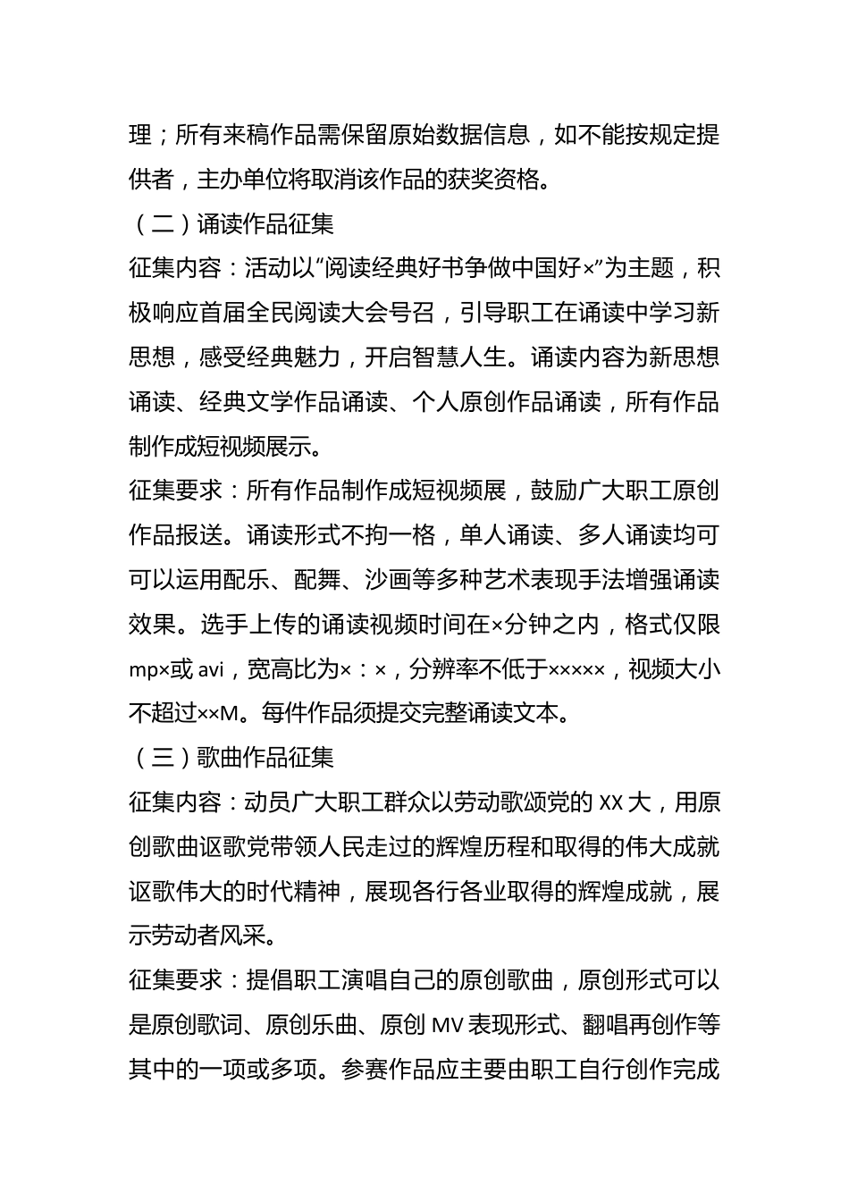 “网聚职工正能量争做中国好”优秀作品征集活动方案一、指导思想进一步贯彻落实党的XX大精神,通过开展“网聚职工正能量争做中国好×”优秀作品征集活动,展现我县各级各民族职工群众凝心聚力建设美好家园的伟大精神。二、征集对象全县各基层工会干部职工三、征集作品内容及要求(一)摄影作品征集征集内容:展现广大职工爱岗敬业、艰苦奋斗、勇于创新甘于奉献的精神风貌,反映各行各业劳模风采、工匠技艺展示重大科技创新、弘扬“三个精神”、企业火热劳动场景、新冠肺炎疫情防控、职工幸福生活场景的原创摄影作品。征集要求:参赛作品数量不限,题材、风格不限,彩色及黑白(单色)图像不限(摄影作品单幅和组照统称为“件”,组照须×-×幅为×件)。作品介绍××字以内;参赛摄影作品单幅图片文件(JPEG格式)大小×M以上,×M以下;照片仅可作亮度、对比度、色彩饱和度的适度调整,不得作合成、添加或删减画面主要元素或大幅度改变色彩等技术处理;所有来稿作品需保留原始数据信息,如不能按规定提供者,主办单位将取消该作品的获奖资格。(二)诵读作品征集征集内容:活动以“阅读经典好书争做中国好×”为主题,积极响应首届全民阅读大会号召,引导职工在诵读中学习新思想,感受经典魅力,开启智慧人生。诵读内容为新思想诵读、经典文学作品诵读、个人原创作品诵读,所有作品制作成短视频展示。征集要求:所有作品制作成短视频展,鼓励广大职工原创作品报送。诵读形式不拘一格,单人诵读、多人诵读均可可以运用配乐、配舞、沙画等多种艺术表现手法增强诵读效果。选手上传的诵读视频时间在×分钟之内,格式仅限mp×或avi,宽高比为×:×,分辨率不低于×××××,视频大小不超过××M。每件作品须提交完整诵读文本。(三)歌曲作品征集征集内容:动员广大职工群众以劳动歌颂党的XX大,用原创歌曲讴歌党带领人民走过的辉煌历程和取得的伟大成就讴歌伟大的时代精神,展现各行各业取得的辉煌成就,展示劳动者风采。征集要求:提倡职工演唱自己的原创歌曲,原创形式可以是原创歌词、原创乐曲、原创MV表现形式、翻唱再创作等其中的一项或多项。参赛作品应主要由职工自行创作完成禁止由专业音乐人代为创作,一经查出,取消参赛资格,并进行通报批评。歌曲的演唱方法、风格、形式不限,可以采用独唱、重唱、乐队、组合、合唱等表演形式。提交的参赛歌曲格式应为高清MP×视频格式,宽高比为×:×,分辨率为×××××,作品时长一般不超过×分钟,原创作品需备注原创,并需提交完整的图片格式(jpg或png)歌谱。(四)微视频作品征集征集内容:面向广大职工征集充分展现党的光辉历程、党领导人民取得的伟大成就以及优秀共产党员的杰出贡献和优秀风范的视频作品;征集建功新时代、奋进新征程、劳动创造幸福、匠心绝活、网络安全和网络文明故事等积极向上、充满正能量的视频作品,突出“三个精神”,用镜头讲好劳动者故事。征集要求:视频文件格式为mp×,要求画面清晰,声音清楚,重点内容配字幕,时长×-×分钟,尺寸比例×:×。四、有关事项(一)所有参赛作品须注明作者姓名、性别、年龄、单位联系方式。(二)参赛的作品必须为投稿者本人原创作品,不存在知识产权争议,否则主办方有权取消其评选资格,涉及法律责任由作品报送者承担。(三)主办方拥有对本次作品征稿获奖作品的永久使用权,除商业用途外,可以将其使用在展览、展示、海报、招贴制作画册和宣传品等方面,不再另付稿酬,保留作者署名权。(四)本次活动不收取参赛费、不退稿。在邮件发送过程中或投递过程中损毁、灭失或迟到、未到的,相关损失及后果由投稿者自行承担。(五)参赛作者不能提供电脑创意和改变原始影像的作品投稿作品仅可做亮度、对比度、饱和度的适(六)征集作品每个类别每人限报送×份作品,报送截止日期:2023年×月×日。(七)作品报送方式:通过U盘将作品以及作品信息表拷贝报送至县总工会一楼宣传教育和基层工作部。(八)应征作品经×县总工会进行分类评审,对评审出的优秀作品给予一定金额的奖励,并推荐参加上一级评选活动当调整,不得对图片进行大幅度改变色彩、合成、添加或删除等改变作品原貌的技术处理。