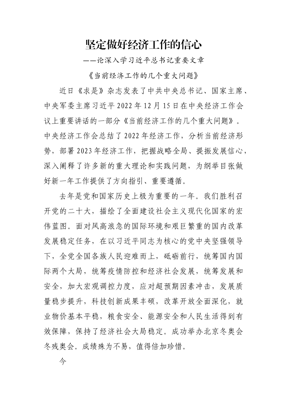 坚定做好经济工作的信心——论深入学习近平总书记重要文章《当前经济工作的几个重大问题》近日《求是》杂志发表了中共中央总书记、国家主席、中央军委主席习近平2022年12月15日在中央经济工作会议上重要讲话的一部分《当前经济工作的几个重大问题》。中央经济工作会总结了2022年经济工作,分析当前经济形势,部署2023年经济工作,把握战略全局、提振发展信心,深入阐释了许多新的重大理论和实践问题,为纲举目张做好新一年工作提供了方向指引、重要遵循。去年是党和国家历史上极为重要的一年。我们胜利召开党的二十大,描绘了全面建设社会主义现代化国家的宏伟蓝图。面对风高浪急的国际环境和艰巨繁重的国内改革发展稳定任务,在以习近平同志为核心的党中央坚强领导下,全党全国各族人民迎难而上,砥砺前行,统筹国内国际两个大局,统筹疫情防控和经济社会发展,统筹发展和安全,加大宏观调控力度,应对超预期因素冲击,发展质量稳步提升,科技创新成果丰硕,改革开放全面深化,就业物价基本平稳,粮食安全、能源安全和人民生活得到有效保障,保持了经济社会大局稳定。成功举办北京冬奥会冬残奥会。成绩殊为不易,值得倍加珍惜。今年是落实党的二十大战略部署的第一年,也是实施“十四五”规划的关键一年。做好今年经济工作,我们要紧密团结在以习近平同志为核心的党中央周围,深入贯彻习近平新时代中国特色社会主义思想,坚定做好经济工作的信心,坚持稳中求进、激发干事活力,将中央经济工作会议精神与公安交管工作相结合。坚持围绕中心、服务大局,充分发挥公安机关职能作用,从严从实从细做好防风险、保安全、护稳定、促发展各项工作,切实把党中央的决策部署转化为推动高质量发展的实际成效,积极配合有关部门,有效防范化解重大经济金融风险,坚决守住不发生系统性风险的底线。推动公安行政管理服务改革,营商环境全面优化,为经济工作开好头,营造安全稳定的社会环境、公平正义的法治环境、优质高效的服务环境。研究出更多惠民生、暖民心举措,着力解决好群众的急难愁盼问题,更好地满足发展所需、回应民心所盼,为全市经济社会高质量发展贡献公安交管力量。
