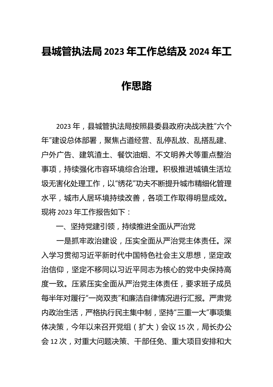 县城管执法局2023年工作总结及2024年工作思路2023年,县城管执法局按照县委县政府决战决胜“六个年”建设总体部署,聚焦占道经营、乱停乱放、乱搭乱建、户外广告、建筑渣土、餐饮油烟、不文明养犬等重点整治事项,持续强化市容环境综合治理。积极推进城镇生活垃圾无害化处理工作,以“绣花”功夫不断提升城市精细化管理水平,城市人居环境持续改善,各项工作取得明显成效。现将2023年工作报告如下:一、坚持党建引领,持续推进全面从严治党一是抓牢政治建设,压实全面从严治党主体责任。深入学习贯彻习近平新时代中国特色社会主义思想,坚定政治信仰,坚定不移同以习近平同志为核心的党中央保持高度一致。压紧压实全面从严治党主体责任,要求班子成员每半年对履行“一岗双责”和廉洁自律情况进行汇报。严肃党内政治生活,严格执行民主集中制,坚持“三重一大”事项集体决策,今年以来召开党组(扩大)会议15次,局长办公会12次,对重大问题决策、干部任免、重大项目安排和大额资金使用等事项,坚持集体研究决定,确保决策科学化民主化。二是抓实组织建设,充分发挥党建引领作用。严格落实“三会一课”制度,加强党员思想政治教育,大力加强基层党组织标准化规范化建设,严格落实民主生活会、组织生活会、党员民主评议等制度。结合工作实际,深入推进“城管卫士”党建品牌创建活动,大力推行“一线”工作法,坚持问题在一线发现、困难在一线破解、措施在一线落实,着力推进党建和业务融合,持续开展市容环境卫生整治,充分发挥党员先锋模范带头作用,用党员干部的“辛苦指数”换来城市管理水平的“上升指数”和群众的“幸福指数”。三是抓紧作风建设,深入推进作风大转变。紧紧围绕县委聚焦“六破六立”开展“大反思大讨论大落实”行动要求,进一步加强干部队伍作风建设,深化城管系统“强基础、转作风、树形象”专项行动,组织开展“岗位标兵”、“城管之星”每月评选活动,建立健全各项规章制度,做到制度之内严格要求,制度之外循规蹈矩。进一步加强队伍执法能力建设,严格落实行政执法“三项制度”,做到严格规范公正文明执法。进一步强化服务意识,将群众的“需求清单”转化为城市管理的“责任清单”,持续推动城管便民服务工作,在城区设置茶叶笋干、瓜果蔬菜等16处自产自销临时销售点,建成灵山公园扬之夜市,多年来群众反映强烈的问题得到有效根治。四是坚持举一反三,全力推进省委巡视反馈问题整改扎实推进省委巡视反馈问题——徽山首府小区违建整改工作,确保按时全面完成整治任务。坚持举一反三,进一步明确各职能部门工作职责,会同相关部门加强小区物业监督管理,充分发挥小区物业第一哨岗作用,从源头上控制小区违法建设问题发生。二、聚焦主责主业,持续推进城市精细化管理一是积极推进城镇生活垃圾无害化处理工作(市对县目标管理绩效考核任务)1.推深做实“生态美超市”,巩固提升生活垃圾分类试点成果(县政府工作报告任务)。2023年,在组织开展吴家山扩区、十亩园小区、绩溪县政务中心、扬之小学生活垃圾分类试点基础上,新增建设洪川廉租房小区、金边小区财富广场垃圾分类试点。完成建设垃圾分类服务中心暨青少年垃圾分类实践教育基地1座、智能分类投放站和智能积分兑换机2套,配备电动分类收集车、称重计量设备、分类垃圾桶等。持续加强“生态美超市”日常运营监管,目前我县11个乡镇81个村(社区)已实现“生态美超市”全覆盖,村民们逐步形成了将日常生活中的生活垃圾进行分类、到“生态美超市”兑换生活日用品的新风尚,社会效益明显。2.实现生活垃圾“零填埋、全焚烧”。持续加强生活垃圾转运焚烧项目日常运营管理,自2022年6月开始,绩溪县域内所有原生生活垃圾转运至宣城瀚蓝固废处理有限公司进行无害化焚烧处理,实现了生活垃圾“零填埋”“全焚烧”目标,确保城镇生活垃圾无害化处理率保持100%。3.积极推进生活垃圾转运配套设施——生活垃圾中转站及南郊生活垃圾场封场项目建设。生活垃圾转运配套设施项目分两期进行,首期建设一座日处理200吨大型垃圾中转压缩站(垂直压缩式)、合建分拣中心等设施,并购置20吨以上的大吨位垃圾转运车辆。二期完成南...