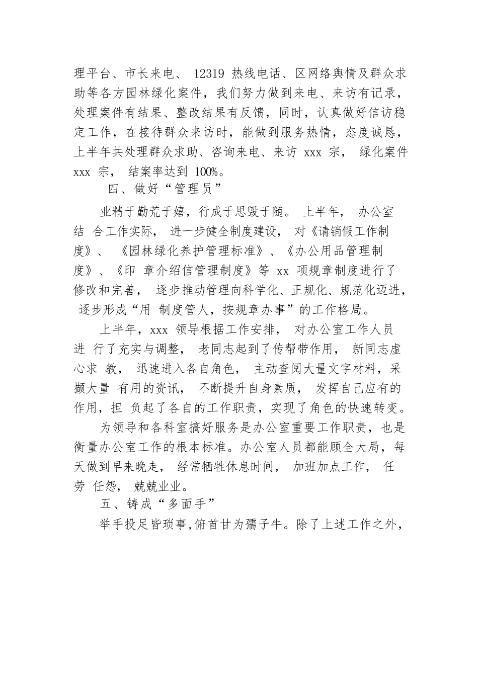 做好领导的得力助手热情周到为大家服务各位领导、各位同仁,大家好!回顾上半年工作,我们在xxxx和xxxx的正确领导下,在兄弟科室和同事们的大力支持与帮助下,办公室成员不断提高工作效率和服务质量,更好地发挥了办公室的职能作用,以严谨的态度对待工作,以热诚的态度对待同志,认真完成领导和同志们交办的每一项工作,取得了一定的成绩。做为办公室的主管领导,首先由我来介绍办公室团队成员:我是xxx,受办公室全体同事的委托,向在座的诸位领导和同仁们汇报xxx年上半年工作情况。上半年我们主要做了这些工作:一、当好“笔杆子”文章千古事,得知寸心知。我们这些天天面对着电脑“爬格子”的人被称为“笔杆子”,写东西不但是个技术活,也是个苦差事,每写一篇稿子需要经过这么几道程序,“聆听领导意图—查阅搜集资料—构思布局提纲—草拟修正初稿—呈送领导阅示—遵照批阅修改—再次呈送领导—定稿打印送发”。诸道程序中,犹以初稿期最煞人,为写稿我们殚精竭虑,劳心费神,连走路吃饭都在思考某句话是否得体,用哪个字更贴切,个中苦味人自知。我们在文字撰写中,都能做到酌文斟字、认真编辑、细心校对,确保文字不出差错,数据准确无误,严把文件材料质量关。同时,还要审核各科室以单位名义上报或下发的文件初稿,力求做到文字通顺,符合公文规范。上半年,办公室共拟定总结计划、纪要简报、请示汇报、整改回复及其它综合性文字材料xxx份,配合其他科室制作PPT电教片、汇报材料等xxx期;编发“xxx简报”xxx期,其中被各新闻媒体采稿xxx篇。按上级要求,按照时间准确上报工作动态报表近xxx余种,并做到不拖延、无漏报,同时,还积极完成领导和同志们交办的临时写作任务。二、成为“活档案”续写园林华章,编纂厚重珍藏。我们负责各类文件收发、登记、初审、分发、文印、传达、督办、存档、落实等工作。为进一步规范档案管理,上半年,我们积极响应无纸化办公的号召,充分利用电脑、打印机、相机、录像机等先进办公条件,建立健全电子文书档案,积极做好文字、影像等第一手资料的留存工作。对所有文件分门别类进行整理归档入册。我们办公室每位工作人员对资料存放的书面或电子文档均能熟记在心,个个成为“活档案”,做到查询快速,服务热情,为提高办事效率,提升工作质量加油助力,切实为领导和科室提供优质服务。三、承当“消防员”隐患险情总关情,化险为夷赢赞声。我们负责数字化案件工作。近年来,市、区园林绿化管理实行网格化管理制度,对园林绿化案件的问题发现、处理速度及信息反馈等各个环节都有严格要求。我们每天都要接到来自xx市社会公共管理平台、市长来电、12319热线电话、区网络舆情及群众求助等各方园林绿化案件,我们努力做到来电、来访有记录,处理案件有结果、整改结果有反馈,同时,认真做好信访稳定工作,在接待群众来访时,能做到服务热情,态度诚恳,上半年共处理群众求助、咨询来电、来访xxx宗,绿化案件xxx宗,结案率达到100%。四、做好“管理员”业精于勤荒于嬉,行成于思毁于随。上半年,办公室结合工作实际,进一步健全制度建设,对《请销假工作制度》、《园林绿化养护管理标准》、《办公用品管理制度》、《印章介绍信管理制度》等xx项规章制度进行了修改和完善,逐步推动管理向科学化、正规化、规范化迈进,逐步形成“用制度管人,按规章办事”的工作格局。上半年,xxx领导根据工作安排,对办公室工作人员进行了充实与调整,老同志起到了传帮带作用,新同志虚心求教,迅速进入各自角色,主动查阅大量文字材料,采撷大量有用的资讯,不断提升自身素质,发挥自己应有的作用,担负起了各自的工作职责,实现了角色的快速转变。为领导和各科室搞好服务是办公室重要工作职责,也是衡量办公室工作的根本标准。办公室人员都能顾全大局,每天做到早来晚走,经常牺牲休息时间,加班加点工作,任劳任怨,兢兢业业。五、铸成“多面手”举手投足皆琐事,俯首甘为孺子牛。除了上述工作之外,我们还要协助领导处理好日常行政事务。一是提供文印服务;二是做好拍照与录相;三是做好印鉴管理;四是负责办公用品的购买与发放;五是负责对外接待工作;六是负责...