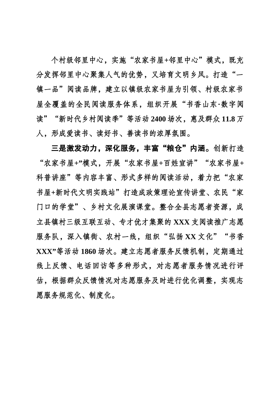 创新农家书屋“1+N”模式打造乡村振兴文化粮仓“”农家书屋工程是公共文化服务重点工程之一,对于助力乡村文化振兴战略、巩固农村思想文化阵地具有重要意义。近年来,XXX坚持靶向思维、统筹整合资源,定向施策、延伸触角,创新“1+N”管理模式,积极推动农家书屋转型升级,全面助力乡村文化振兴。一是抓稳基础,优化服务保障,筑牢粮仓地基。“”坚持全域统筹,整合县级图书馆、社区书屋、城市书屋等多种资源,实现资源互联互通。完善基础设施建设,城乡书屋建设面积达到XX平方米以上,配置图书XXX册、报刊近XXX种,设置少儿阅览桌椅、无障碍设施以及老花镜、急救箱等,充分考虑特殊群体的需求。优化服务保障,强化教育培训,提升服务意识和水平,做好书籍推荐、借还登记等。开展阅享““XX·爱心筑梦等图书捐赠活动,为”XX个农家书屋捐赠各“”类书籍XX万余册,极大地丰富了广大农民群众的阅读资源。截至目前,全县建成星级农家书屋示范点XXX个。二是增强活力,创新管理,拓宽粮仓载体。“”创新实施农家书屋“1+N”管理模式——“1”即农家书屋、镇级分馆建设;“N”即农家书屋与邻里中心、新时代文明实践站等N个平台融合,依托集超市、幸福食堂等多功能一体的XXX个村级邻里中心,实施农家书屋“+邻里中心模式,既充”分发挥邻里中心聚集人气的优势,又培育文明乡风。打造一“镇一品阅读品牌,建立以镇级农家书屋为引领、村级农家书”屋全覆盖的全民阅读服务体系,组织开展书香山东“·数字阅读新时代乡村阅读季等活动”“”2400场次,惠及群众11.8万人,形成爱读书、读好书、善读书的浓厚氛围。三是激发动力,深化服务,丰富粮仓内涵。“”创新打造农家书屋“+”模式,开展农家书屋“+百姓宣讲农家书屋”“+科普讲座等内容丰富、形式多样的阅读活动,着力把农家”“书屋+新时代文明实践站打造成政策理论宣传讲堂、农民家”“门口的学堂、乡村文化展演课堂。整合全县志愿者资源,成”立县镇村三级互联互动、专才优才集聚的XXX支阅读推广志愿服务队,深入镇街、农村一线,组织弘扬“XX文化书香”“XXX”等活动1860场次。建立志愿者服务反馈机制,定期通过线上反馈、电话回访等多种形式,对志愿者服务情况进行评估,根据群众反馈情况对志愿服务及时进行优化调整,实现志愿服务规范化、制度化。