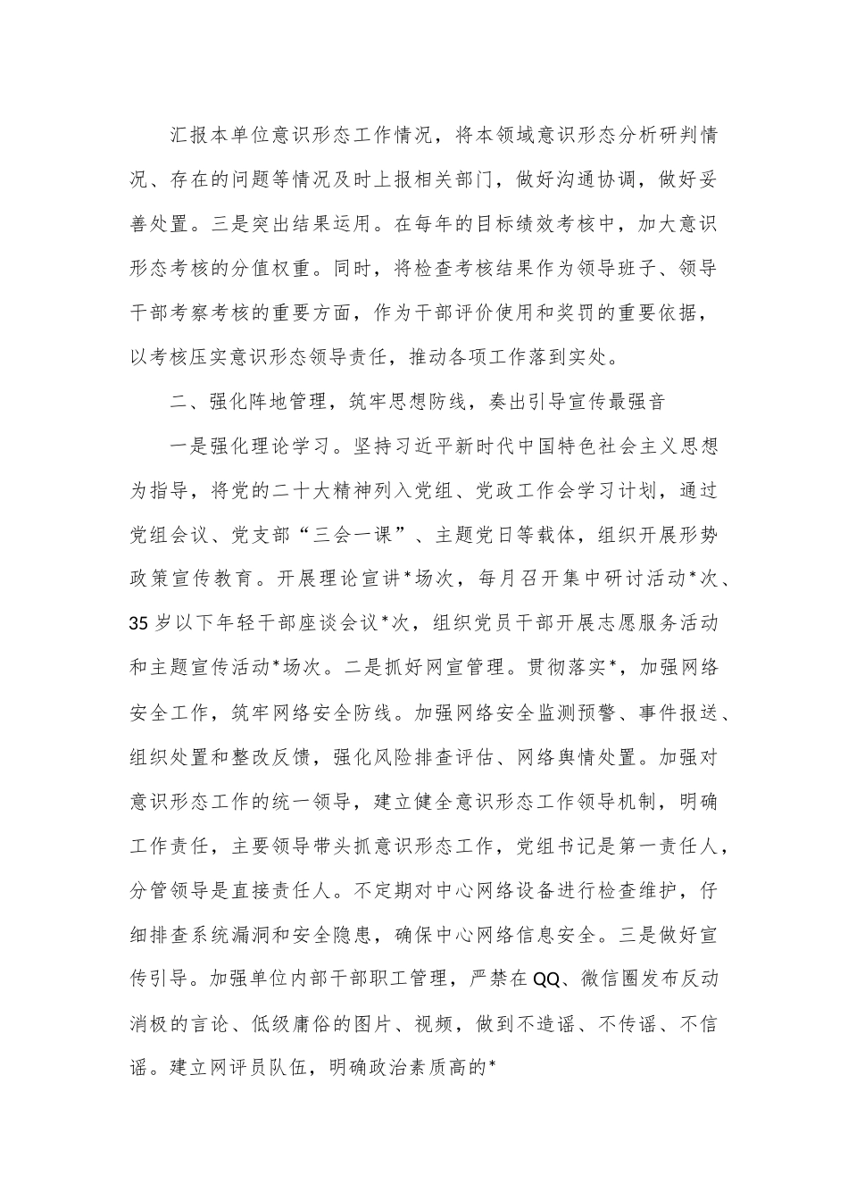 2022年意识形态工作责任制贯彻落实情况汇报习近平总书记指出,意识形态工作是党的一项极端重要的工作。本人认真落实意识形态工作主体责任,在加强思想引领、学习先进典型、完善制度建设等方面狠下功夫,切实将意识形态工作落细、落小、落实,牢牢把握正确政治方向,筑牢思想定力,为推动*高质量发展提供坚强思想政治保障,现就一年来落实意识形态责任制情况汇报如下。一、突出思想引领,健全责任体系,着力加强机关政治建设一是强化组织领导。成立以主要领导任组长,分管领导任副组长,科室负责人为成员的领导小组,实行主要领导负责则、分管领导具体抓,班子成员齐抓共管的工作机制,定期召开会议,专题研究解决意识形态工作中存在的实际问题。认真贯彻落实中*关于意识形态工作的决策部署和指示精神,把意识形态工作纳入年度工作要点及日常议事日程,与业务工作同部署、同落实、同考核。严格落实意识形态“一岗双责”责任制,加强重点舆情监测、处置,将意识形态工作列入议事日程,纳入党建工作责任制和年度目标考核,强化责任担当意识,全力打好意识形态工作主攻战。二是完善沟通机制。建立汇报沟通制度,强化一个统揽,落实领导干部领学、宣讲,抓好单项目标、述职评议、督查指导等考核制度,构建闭环责任链条,让意识形态工作有章可循、有据可依,定期向*汇报本单位意识形态工作情况,将本领域意识形态分析研判情况、存在的问题等情况及时上报相关部门,做好沟通协调,做好妥善处置。三是突出结果运用。在每年的目标绩效考核中,加大意识形态考核的分值权重。同时,将检查考核结果作为领导班子、领导干部考察考核的重要方面,作为干部评价使用和奖罚的重要依据,以考核压实意识形态领导责任,推动各项工作落到实处。二、强化阵地管理,筑牢思想防线,奏出引导宣传最强音一是强化理论学习。坚持习近平新时代中国特色社会主义思想为指导,将党的二十大精神列入党组、党政工作会学习计划,通过党组会议、党支部“三会一课”、主题党日等载体,组织开展形势政策宣传教育。开展理论宣讲*场次,每月召开集中研讨活动*次、35岁以下年轻干部座谈会议*次,组织党员干部开展志愿服务活动和主题宣传活动*场次。二是抓好网宣管理。贯彻落实*,加强网络安全工作,筑牢网络安全防线。加强网络安全监测预警、事件报送、组织处置和整改反馈,强化风险排查评估、网络舆情处置。加强对意识形态工作的统一领导,建立健全意识形态工作领导机制,明确工作责任,主要领导带头抓意识形态工作,党组书记是第一责任人,分管领导是直接责任人。不定期对中心网络设备进行检查维护,仔细排查系统漏洞和安全隐患,确保中心网络信息安全。三是做好宣传引导。加强单位内部干部职工管理,严禁在QQ、微信圈发布反动消极的言论、低级庸俗的图片、视频,做到不造谣、不传谣、不信谣。建立网评员队伍,明确政治素质高的*名党员干部为单位网评员,积极开展网上评论引导。同时做好重要节点和敏感时期的舆论监管,妥善处置群众关心的公共资源交易热点问题,对公共资源交易过程中可能出现的热点问题、重大突发事件,及时做好引导、积极回应社会关切。严格信息发布审核,对外发布信息需经“三审三校”后方可发布,从而提高信息简报及交易信息的准确率,避免因信息发布错误引发舆情。三、做好舆情管控,抓好突发处置,牢牢把握斗争主动权一是抓好风险研判。定期分析研判意识形态领域情况,辨析意识形态领域突出问题,重要社情民意中的苗头倾向性的问题,有针对性地进行引导。认真开展意识形态风险隐患排查,及时研判整改,对本单位意识形态领域风险点和隐患点进行认真排查、梳理,及时召开本地本部门意识形态领域分析研判会,组织对意识形态领域突出问题进行会商、研判,提出解决办法和具体措施。明确意识形态工作联络员、网络维护人员具体负责意识形态工作,明确工作责任,狠抓责任落实,确保意识形态宣传阵地安全。二是强化经费保障。加大在意识形态和宣传思想工作方面的投入,全力保障相关经费需求,不断加大宣传力度,扩大宣传面。本年度支出*元,用于法律法规、政策等方面的宣传,报刊杂志订阅,宣传手册印制等方面。...
