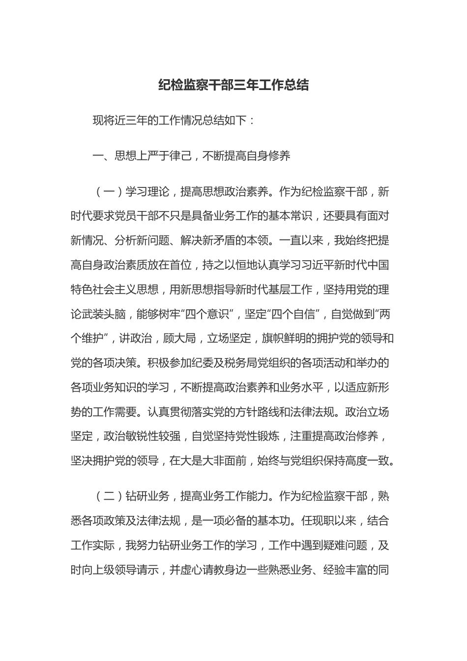 纪检监察干部三年工作总结现将近三年的工作情况总结如下:一、思想上严于律己,不断提高自身修养(一)学习理论,提高思想政治素养。作为纪检监察干部,新时代要求党员干部不只是具备业务工作的基本常识,还要具有面对新情况、分析新问题、解决新矛盾的本领。一直以来,我始终把提高自身政治素质放在首位,持之以恒地认真学习习近平新时代中国特色社会主义思想,用新思想指导新时代基层工作,坚持用党的理论武装头脑,能够树牢“四个意识”,坚定“四个自信”,自觉做到“两个维护”,讲政治,顾大局,立场坚定,旗帜鲜明的拥护党的领导和党的各项决策。积极参加纪委及税务局党组织的各项活动和举办的各项业务知识的学习,不断提高政治素养和业务水平,以适应新形势的工作需要。认真贯彻落实党的方针路线和法律法规。政治立场坚定,政治敏锐性较强,自觉坚持党性锻炼,注重提高政治修养,坚决拥护党的领导,在大是大非面前,始终与党组织保持高度一致。(二)钻研业务,提高业务工作能力。作为纪检监察干部,熟悉各项政策及法律法规,是一项必备的基本功。任现职以来,结合工作实际,我努力钻研业务工作的学习,工作中遇到疑难问题,及时向上级领导请示,并虚心请教身边一些熟悉业务、经验丰富的同志。同时,我自觉紧跟新时代要求,带头学习,不断拓宽视野,丰富知识积累,科学地调整工作思路。特别是在基层纪检监察工作的各项任务中,做到边学习边工作、边分析边解决新时期基层纪检监察工作面临的新情况新问题、提高工作能力,做到让领导放心。(三)廉洁自律,树立自身良好形象。作为纪检监察干部,时刻将自己置于他人监督之下,坚持“打铁必须自身硬”,始终保持对党绝对忠诚的高度自觉和责任担当首先要自己绷紧廉政神经、紧跟发展形势,精通法规、以身作则,才能将纪检工作落到实处。时刻让自己充分认识到腐败现象的极端危害性和危险性,不断完善自我,使自己在工作中正确行使自己的权力和义务,时刻保持清醒头脑,秉公办事,不徇私情;作为税务干部,以组织收入为中心,优化纳税服务,提升税收质量;同时抓好制度落实,加强党风廉政教育和精神文明建设,用心创新工作模式,构建和谐征纳环境,自觉学习《党章》、《廉政准则》。在工作和生活上按照党员标准严格要求自己,约束自己,摆正关系,明确职责,做到说话不“犯规”,行动不“越位”,办事不“出格”,端正自己的思想作风、工作作风和生活作风,无不良嗜好,无违法违纪行为及问题。二、工作上履职尽责,主动抓好落实在纪委监委工作期间,我的主要工作职责是维护党的章程和其他党内法规,检查党的路线、方针、政策和决议的执行情况,协助党的委员会加强党风建设和组织协调反腐败工作。负责中心乡镇纪检监察工作,参与审查调查处理案件10余起,查处违纪党员3人,并做好所参与查办案件的归档、立卷工作。2020年3月参加新冠病毒疫情防控工作,每日2次轮流到各社区及乡镇、村屯疫情防疫卡口进行督导检查,做到对疫情防控情况随时掌握,能从容应对疫情突发情况;三、作风上廉洁自律,自觉遵守规章制度作为纪检干部,我深知加强自身廉正建设的重要性和必要性。通过“不忘初心、牢记使命”主题教育,加强自我学习,树立“清正廉洁做表率”意识,谨言慎行,遵规守纪。认真学习《中国共产党纪律处分条例》、《党政领导干部廉洁从政若干准则》等各项法律法规,做到廉洁自律,保持为民务实清廉的政治本色。同时,在工作中严格要求自己,做到公正执法,严格执法。在实际工作中,我始终做到“慎独”“慎微”“慎行”,要坚持原则,作风正派、严格落实上级下达的各项工作要求,以自己的实际行动树立廉洁奉公党员干部形象。真正做到为人坦诚、正派,能够团结同志,帮忙同事解决困难和问题,与同事关系融洽。在总结成绩的同时,我也清醒地看到在工作中有很多不足之处,如在工作中接受批评能力不够高,对涉法案件办理的业务能力不够强,因业务挤占学习时间,深入基层不够等等。在今后的工作中我会继续努力,不断加强党性修养和业务知识的学习,进一步提高为人民服务能力和素质,克服不足,做好本职工作。新时代更要有新作为,为党的事业贡...