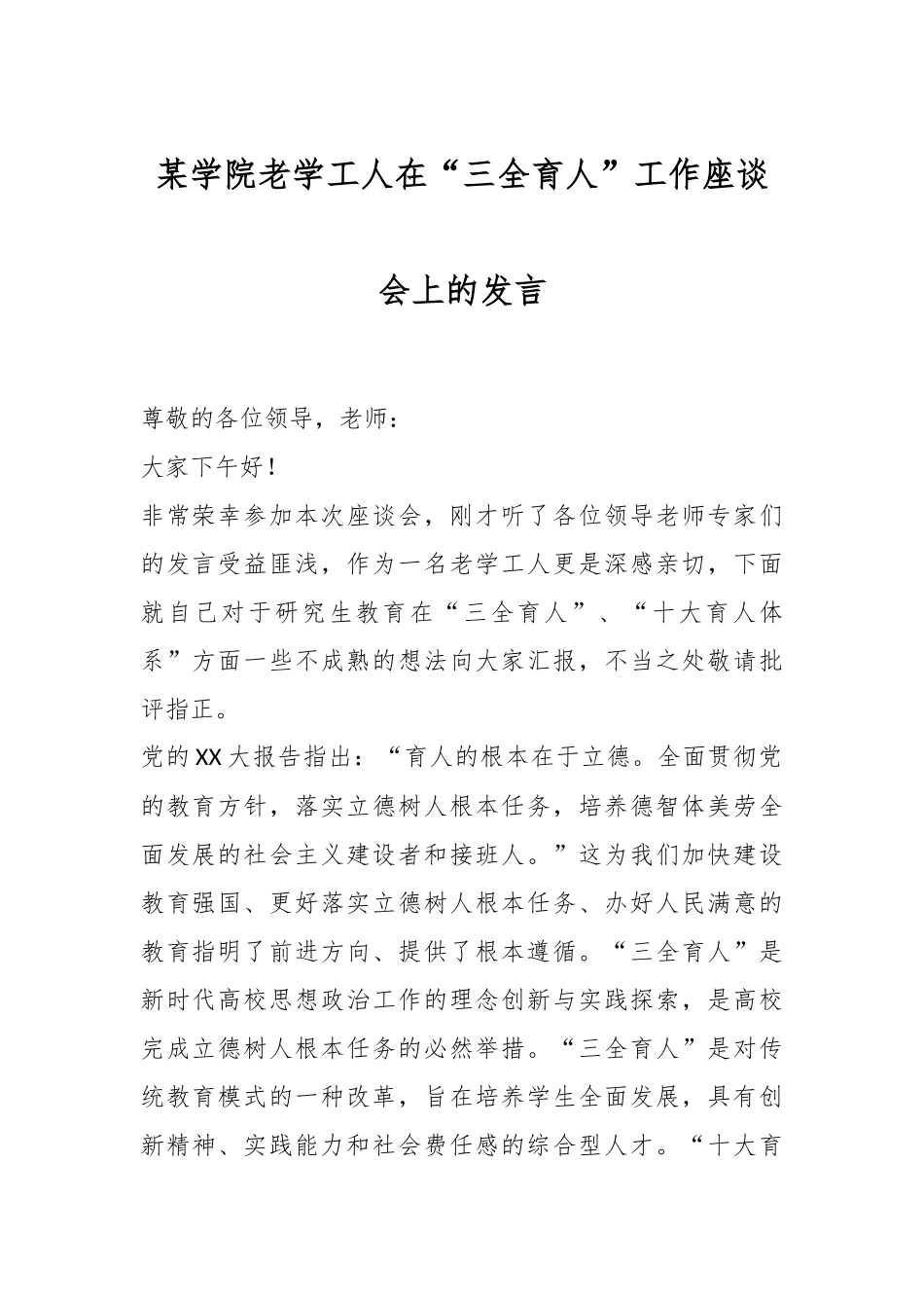 某学院老学工人在“三全育人”工作座谈会上的发言尊敬的各位领导,老师:大家下午好!非常荣幸参加本次座谈会,刚才听了各位领导老师专家们的发言受益匪浅,作为一名老学工人更是深感亲切,下面就自己对于研究生教育在“三全育人”、“十大育人体系”方面一些不成熟的想法向大家汇报,不当之处敬请批评指正。党的XX大报告指出:“育人的根本在于立德。全面贯彻党的教育方针,落实立德树人根本任务,培养德智体美劳全面发展的社会主义建设者和接班人。”这为我们加快建设教育强国、更好落实立德树人根本任务、办好人民满意的教育指明了前进方向、提供了根本遵循。“三全育人”是新时代高校思想政治工作的理念创新与实践探索,是高校完成立德树人根本任务的必然举措。“三全育人”是对传统教育模式的一种改革,旨在培养学生全面发展,具有创新精神、实践能力和社会费任感的综合型人才。“十大育人体系”是三全育人理念的具体实践体系,这一系列的目标、理念、路径都是需要我们不断坚持和发扬的。我国著名的教育学家陶行知说过,教师的职责是“千教万教,教人求真”,学生的职责是“千学万学,学做真人”实施“三全育人”不是要“另起炉灶”,而是要与学校各项制度进行有机融合和合理优化,“十大育人体系”紧紧围绕立德树人思想政治教育这一主线,着力在坚定理想信念、厚植爱国主义情怀、加强品德修养、增长知识见识、培养奋斗精神、增强综合素质上下功夫,教育引导学生争做“爱国、励志、求真、力行”的“真人”“新人”。研究生教育,尤其是研究生思政教育作为高校思政教育的重要组成部分既有高校思政教育的普遍性问题,同时又具有其特殊性,例如研究生“导学思政”即是教育工作的重点也是难点。近年来,研究生院,将“三全育人”各项要求融入学校制度体系,融入学科、教学、教材、管理体系使之成为学校研究生教育工作的价值准绳和基本遵循。转变思想政治工作的内容供给、传授形式,积极开展浸入式渗透式、启发式的“隐性教育”,着力打造培育既“叫好”又“叫座”的育人工作品牌,xxx年思政领域教育领域的成绩下一步研究生院将进一步提高政治站位,切实增强做好新时代“三全育人”工作的责任感和使命感,求真务实、真抓实干,着力打造“三全育人”综合改革示范高地。创新育人模式,构建“大思政”格局。把握好“实”“全”“育”三个字,以“十大育人”体系为基础,一体化构建内容完善、标准先进、运行科学、保障有力、成效显著的“三全育人”工作新格局。发言到此结束,谢谢大家。在xx学院“三全育人”工作座谈会上的发言尊敬的各位领导,老师:大家下午好!非常荣幸参加本次座谈会,刚才听了各位领导老师专家们的发言受益匪浅,作为一名老学工人更是深感亲切,下面就自己对于研究生教育在“三全育人”、“十大育人体系”方面一些不成熟的想法向大家汇报,不当之处敬请批评指正。党的XX大报告指出:“育人的根本在于立德。全面贯彻党的教育方针,落实立德树人根本任务,培养德智体美劳全面发展的社会主义建设者和接班人。”这为我们加快建设教育强国、更好落实立德树人根本任务、办好人民满意的教育指明了前进方向、提供了根本遵循。“三全育人”是新时代高校思想政治工作的理念创新与实践探索,是高校完成立德树人根本任务的必然举措。“三全育人”是对传统教育模式的一种改革,旨在培养学生全面发展,具有创新精神、实践能力和社会费任感的综合型人才。“十大育人体系”是三全育人理念的具体实践体系,这一系列的目标、理念、路径都是需要我们不断坚持和发扬的。我国著名的教育学家陶行知说过,教师的职责是“千教万教,教人求真”,学生的职责是“千学万学,学做真人”实施“三全育人”不是要“另起炉灶”,而是要与学校各项制度进行有机融合和合理优化,“十大育人体系”紧紧围绕立德树人思想政治教育这一主线,着力在坚定理想信念、厚植爱国主义情怀、加强品德修养、增长知识见识、培养奋斗精神、增强综合素质上下功夫,教育引导学生争做“爱国、励志、求真、力行”的“真人”“新人”。研究生教育,尤其是研究生思政教育作为高校思政教育的重要组成部分既有高校思政教育的...