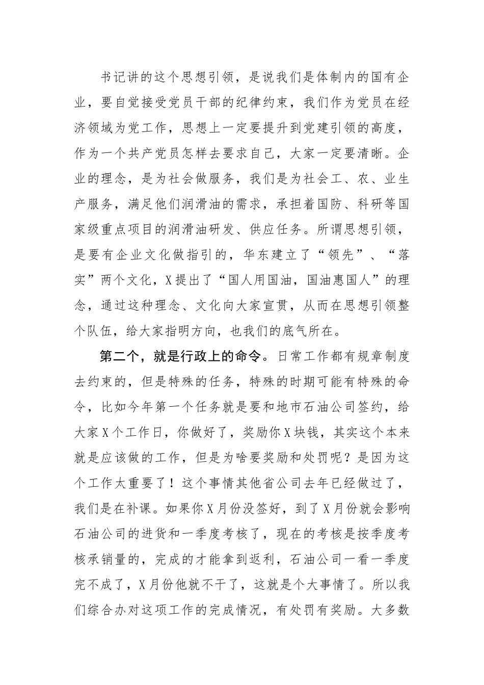 集团公司总经理在销售分公司2023年工作会议上的讲话同志们:总部领导对今年的经济形势是非常乐观,称之为“洼地反弹”,还有一个说法是“深蹲后的起跳”,疫情三年,经济正在有序的复苏,年初各级政府都迅速推出各项利好政策,X省政府在年初六就发布了2023年《关于推动经济运行率先整体好转的若干政策措施》的“一号文件”,目的就是为了提振全社会的发展信心。结合到我们X公司,首先是X吨以下经营部要抓紧提升业绩,低于X吨的经营部一定要想办法提升到X吨以上,这个要求对我们来说是个难题,我们面临着限期完成的要求,因为X去年就从X家经营部合并为了X家,X从去年拖到了今年,压力是很大的,你们的压力肯定也是一样的。所以今年上半年必须要完成两项改革,否则下半年还是不达标的经营部会被撤掉,今年的这项改革的压力还是很重的。我们现在带队伍的压力越来越大,这次在年会上X书记给我们分享了他带队伍的三个方法,我今天也想和大家一起分享一下。第一个,就是思想上的引领。X书记讲的这个思想引领,是说我们是体制内的国有企业,要自觉接受党员干部的纪律约束,我们作为党员在经济领域为党工作,思想上一定要提升到党建引领的高度,作为一个共产党员怎样去要求自己,大家一定要清晰。企业的理念,是为社会做服务,我们是为社会工、农、业生产服务,满足他们润滑油的需求,承担着国防、科研等国家级重点项目的润滑油研发、供应任务。所谓思想引领,是要有企业文化做指引的,华东建立了“领先”、“落实”两个文化,X提出了“国人用国油,国油惠国人”的理念,通过这种理念、文化向大家宣贯,从而在思想引领整个队伍,给大家指明方向,也我们的底气所在。第二个,就是行政上的命令。日常工作都有规章制度去约束的,但是特殊的任务,特殊的时期可能有特殊的命令,比如今年第一个任务就是要和地市石油公司签约,给大家X个工作日,你做好了,奖励你X块钱,其实这个本来就是应该做的工作,但是为啥要奖励和处罚呢?是因为这个工作太重要了!这个事情其他省公司去年已经做过了,我们是在补课。如果你X月份没签好,到了X月份就会影响石油公司的进货和一季度考核了,现在的考核是按季度考核承销量的,完成的才能拿到返利,石油公司一看一季度完不成了,X月份他就不干了,这就是个大事情了。所以我们综合办对这项工作的完成情况,有处罚有奖励。大多数同志克服了重重困难,为啥说是重重困难呢?因为对内打交道往往和对外打交道是一样难的,石油公司大多时候是甲方的角色,尽管事情是围绕他们在做。什么是命令?命令是在战争年代,叫你坚守到什么时候你就得坚守到什么时候,坚守到几点几分,就得到几点几分,这才是一个能打仗的队伍所必须有的执行力。第三个,就是考核上的激励。考核当然分为正激励和负激励,所以我们今年在考核这一块进行了调整,也是想激发员工的合力,增加我们地市一把手指挥力。我上次在南通对孙思为说:副经理的分配权完全交给你,你是这个地区的首长,公司只认你一个人,如果副经理或者高级客户经理,他的能力足够强,他的销量就会更多,贡献就会更大,他获得报酬自然就会更多,所以我们按照销量、按照贡献去进行的分配,也是基于公司领导的讲话精神的要求。今天,借这个机会我想谈对面对困难的三点感悟:第一点,是面对困难要有阳光心态。我看有些工作难度确实很大,包括我们有时候下的一些任务,你蹦起来都是够不到的,但是蹦起来都够不到这也不是你完不成的理由,大家要有阳光心态。现在组织给你任务,不是让你来讨价还价的,无论是过去还是现在,战争年代还是和平年代,基本上这个任务,组织都是反复权衡后决定的。你跳起来够不着的时候,你不会搬把梯子吗?再说,现在还有无人机,总会有办法的,如果你是阳光心态,办法一定会比困难多。确实有些任务很艰巨,但是我们“知困不惧困,知难不怕难”,这种心态就像徐俊峰,组织今年给他加X吨的任务,他没有任何抱怨,就接受下来,因为他这个人就是一种阳光心态。道德经上有一句话,“道生一,一生二,二生三,三生万物,万物负阴而抱阳”。这啥意思呢?说的是这世上所有的万事万物,只有阳光才能让它生长,不接受阳...