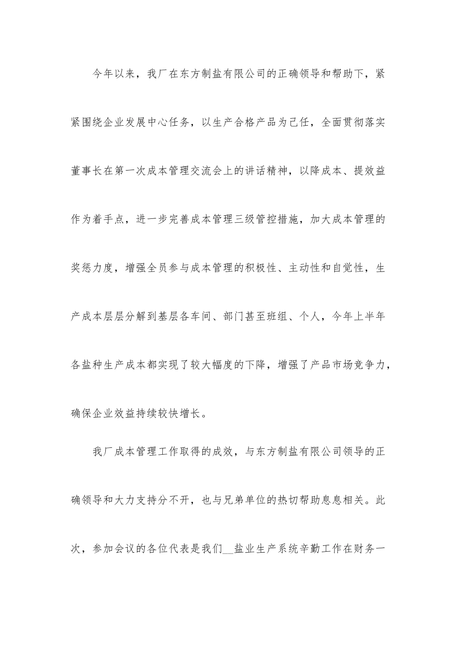 行业交流会座谈研讨会欢迎辞(兄弟单位来访欢迎词,领导讲话)行业交流会座谈会欢迎辞尊敬的董事长、尊敬的邹总经理、兄弟单位的各位领导、同仁们:首先,请允许我代表__精制盐厂全体干部职工对各位领导的到来表示最热烈的欢迎,祝各位领导、各位同仁在__期间心情舒畅。这次东方制盐有限公司成本管理情况交流会能够在我厂举办,并为参加会议的各位领导、同仁服务,是我厂的一件幸事,“有朋自远方来,不亦乐乎”,我们深感光荣,也是我们进一步提升成本管控水平的一个重要契机,对我们来说是促进,更是机遇。今年以来,我厂在东方制盐有限公司的正确领导和帮助下,紧紧围绕企业发展中心任务,以生产合格产品为己任,全面贯彻落实董事长在第一次成本管理交流会上的讲话精神,以降成本、提效益作为着手点,进一步完善成本管理三级管控措施,加大成本管理的奖惩力度,增强全员参与成本管理的积极性、主动性和自觉性,生产成本层层分解到基层各车间、部门甚至班组、个人,今年上半年各盐种生产成本都实现了较大幅度的下降,增强了产品市场竞争力,确保企业效益持续较快增长。我厂成本管理工作取得的成效,与东方制盐有限公司领导的正确领导和大力支持分不开,也与兄弟单位的热切帮助息息相关。此次,参加会议的各位代表是我们__盐业生产系统辛勤工作在财务一线的优秀工作者,拥有深厚知识底蕴和丰富的实践经验,能够借机会和各位同仁请教,接受各位的意见和建议,对我们来说是一次难得的机遇,我们会倍加珍惜,虚心学习,全力配合。也希望通过这次会议,__精制盐厂的点滴工作努力给各位留下印象,__人坦诚、热情的性格给各位留下美好的记忆,我们将以这次会议为新的起点,围绕集团公司“打造集团经营实体、投融资平台、经济支柱、行业旗帜”等一系列新要求,加强我们相互交流与沟通,借鉴学习其他兄弟单位成本管理的宝贵经验,向更高的目标迈进。最后,预祝成本管理情况交流会圆满成功,真诚祝愿各位在过得开心愉快。{兄弟单位来访欢迎词}.谢谢大家。