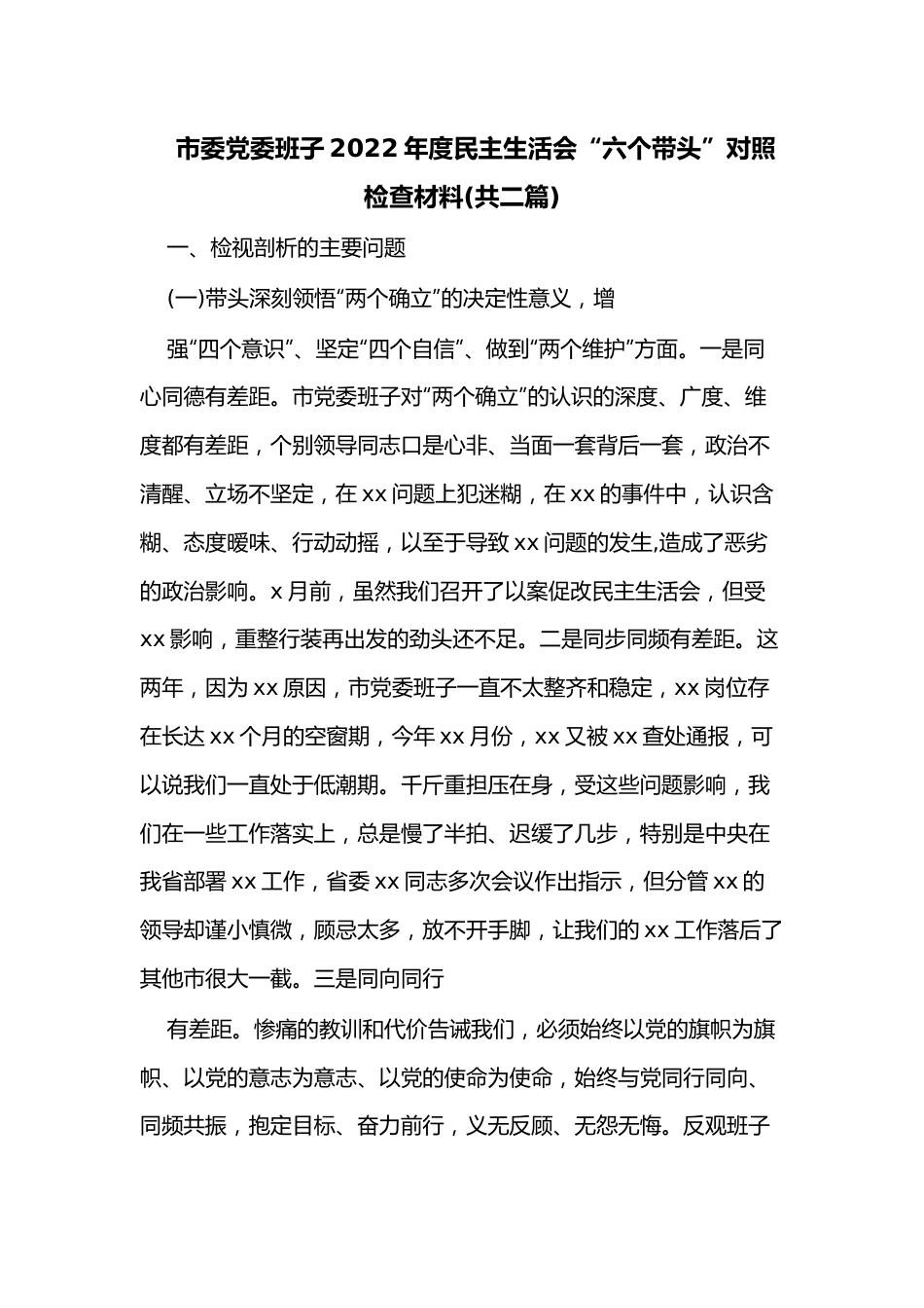 市委党委班子2022年度民主生活会“六个带头”对照检查材料(共二篇)一、检视剖析的主要问题(一)带头深刻领悟“两个确立”的决定性意义,增强“四个意识”、坚定“四个自信”、做到“两个维护”方面。一是同心同德有差距。市党委班子对“两个确立”的认识的深度、广度、维度都有差距,个别领导同志口是心非、当面一套背后一套,政治不清醒、立场不坚定,在xx问题上犯迷糊,在xx的事件中,认识含糊、态度暧味、行动动摇,以至于导致xx问题的发生,造成了恶劣的政治影响。x月前,虽然我们召开了以案促改民主生活会,但受xx影响,重整行装再出发的劲头还不足。二是同步同频有差距。这两年,因为xx原因,市党委班子一直不太整齐和稳定,xx岗位存在长达xx个月的空窗期,今年xx月份,xx又被xx查处通报,可以说我们一直处于低潮期。千斤重担压在身,受这些问题影响,我们在一些工作落实上,总是慢了半拍、迟缓了几步,特别是中央在我省部署xx工作,省委xx同志多次会议作出指示,但分管xx的领导却谨小慎微,顾忌太多,放不开手脚,让我们的xx工作落后了其他市很大一截。三是同向同行有差距。惨痛的教训和代价告诫我们,必须始终以党的旗帜为旗帜、以党的意志为意志、以党的使命为使命,始终与党同行同向、同频共振,抱定目标、奋力前行,义无反顾、无怨无悔。反观班子和我们的工作落实,虽然在xx问题上,有了长足进步、发生了翻天覆地的变化,但在xx问题,还存在不存在问题,需要打个问号,比如,省委在xx工作上,明确要求分xx个步骤、从xx开始抓起,但我们在工作推进上,有的提出不同声音、不同想法,xxxx。(二)带头用习近平新时代中国特色社会主义思想精神铸魂方面。思想认识深度不够。客观上强调工作忙,压力大和事务性工作较多,缺乏持之以恒自觉学习政治理论的精神,不能正确处理工作与学习之间的关系,主动学习的自觉性不高,需要进一步在加强对党的基本理论、基本路线、基本方略的理解;(三)在带头坚持和加强党的全面领导方面。没有树牢“抓好党建就是最大政绩、抓不好党建是最大失职”理念,没有意识到思想建设是党的基础性建设;(四)在带头学习坚持以人民为中心的发展思想方面。民主的作风还有待加强。做党外人士工作时,有时态度不够诚恳、包容的胸襟不够宽,真心实意地把他们当朋友,以心交心,倾听意见建议不够,关心他们的工作、学习和生活少一些。(五)在带头深入发扬斗争精神,防范化解风险挑战方面。对干部监督管理不够到位、不够有力。具体表现为机关效能考核制度落实不好,虽然制定了工作机制和日常管理制度,但在实施上还有所不严。比如,部机关干部下乡、请假都要执行请示报告制度,鉴于平时下乡调研、扶贫等任务繁多,有的干部请假就批准了,没有严格核实具体公务事项和外出时间。(六)在带头落实全面从严治党政治责任方面。在严格落实中央八项规定精神、坚决反对“四风”方面有不足之处,还有讲排场、爱面子思想,还存有执行过程中打“擦边球”现象,还存有以会议传达会议等形式主义现象;四是工作生活中,不能时时处处对照党员标准严格要求自己,还缺乏应有的勤俭节约精神等。二、今后努力的方向和整改措施通过认真查摆了自身存在的突出问题,深挖思想根源,使我进一步明确了今后努力的方向。在以后的学习、工作中,我要切实做到提高“三个意识”1、增强党员意识,以高标准严于律己。要以共产党员的先进性为标准,时刻牢记自己是一名共产党员,始终保持共产党人与时俱进、奋发有为的精神状态,自觉加强党性锻炼和修养,按照《党章》的规定,经常对照、反复校正自己的言行,经常向身边优秀党员学习,强化自己的党员意识,不忘宗旨,不忘入党誓词,在思想和行动上始终与党保持一致。2、增强学习意识,切实提高自身素质。要勤奋学习,通过强化政治、业务学习,不断汲取新知识,争做学习型的党员、学习型的教师,立足本职,扎实工作,爱岗敬业,争创一流工作业绩。3、增强创新意识,提高工作效能。创新是发展的不竭动力,是保持共产党旺盛活力,不断前进的力量源泉。在今后工作中,我要树立精益求精的责任感,树立埋头苦干的务实精神,不管在什么时候,都要以干好工作为己任,多...