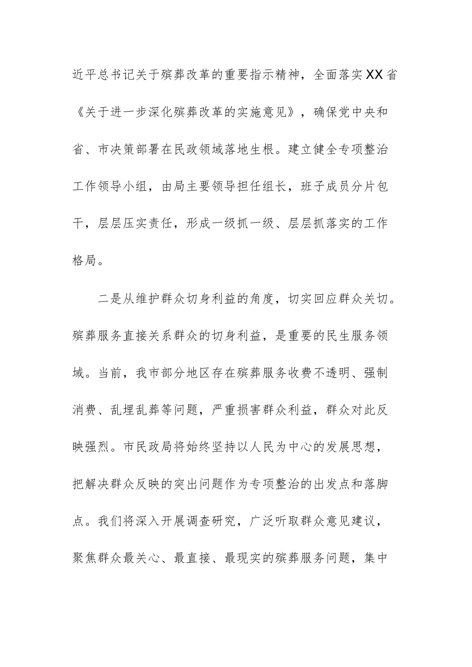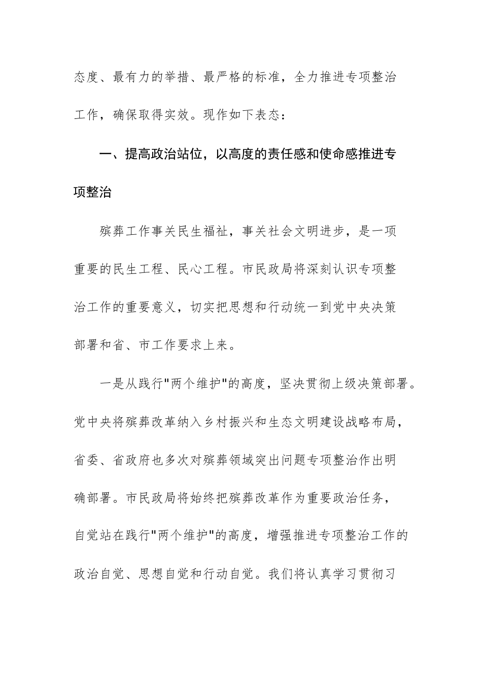 市民政局在全市殡葬领域突出问题专项整治推进会上的表态发言扛牢责任攻坚破难全力推进殡葬领域突出问题专项整治尊敬的各位领导、同志们:殡葬领域突出问题专项整治是践行以人民为中心发展思想、推进社会治理现代化的重要抓手。近年来,XX省持续深化殡葬改革,XX、XX等地通过集中整治,拆除违规墓地XX处、复垦土地XX亩,为全省树立了标杆。对照先进经验,我市殡葬领域仍存在违规建墓屡禁不止、殡葬服务市场乱象丛生、移风易俗推进缓慢等问题。市民政局作为专项整治工作的牵头部门,深感责任重大、使命在肩。我们将以此次会议为契机,坚决扛起政治责任,以最坚决的态度、最有力的举措、最严格的标准,全力推进专项整治工作,确保取得实效。现作如下表态:一、提高政治站位,以高度的责任感和使命感推进专项整治殡葬工作事关民生福祉,事关社会文明进步,是一项重要的民生工程、民心工程。市民政局将深刻认识专项整治工作的重要意义,切实把思想和行动统一到党中央决策部署和省、市工作要求上来。一是从践行"两个维护"的高度,坚决贯彻上级决策部署。党中央将殡葬改革纳入乡村振兴和生态文明建设战略布局,省委、省政府也多次对殡葬领域突出问题专项整治作出明确部署。市民政局将始终把殡葬改革作为重要政治任务,自觉站在践行"两个维护"的高度,增强推进专项整治工作的政治自觉、思想自觉和行动自觉。我们将认真学习贯彻习近平总书记关于殡葬改革的重要指示精神,全面落实XX省《关于进一步深化殡葬改革的实施意见》,确保党中央和省、市决策部署在民政领域落地生根。建立健全专项整治工作领导小组,由局主要领导担任组长,班子成员分片包干,层层压实责任,形成一级抓一级、层层抓落实的工作格局。二是从维护群众切身利益的角度,切实回应群众关切。殡葬服务直接关系群众的切身利益,是重要的民生服务领域。当前,我市部分地区存在殡葬服务收费不透明、强制消费、乱埋乱葬等问题,严重损害群众利益,群众对此反映强烈。市民政局将始终坚持以人民为中心的发展思想,把解决群众反映的突出问题作为专项整治的出发点和落脚点。我们将深入开展调查研究,广泛听取群众意见建议,聚焦群众最关心、最直接、最现实的殡葬服务问题,集中力量进行整治。通过专项整治,切实规范殡葬服务市场秩序,降低群众丧葬负担,让群众感受到实实在在的改革成效,不断增强群众的获得感、幸福感和安全感。三是从推进社会文明进步的维度,积极营造良好社会风尚。殡葬习俗是传统文化的重要组成部分,推进殡葬改革、移风易俗是弘扬时代新风、推进社会文明进步的重要内容。当前,我市部分地区仍存在大操大办丧事、铺张浪费、封建迷信等陈规陋习,与新时代社会文明进步的要求不相适应。市民政局将充分发挥民政部门在推进移风易俗中的职能作用,把专项整治与推进移风易俗结合起来,积极倡导文明节俭、生态环保、移风易俗的殡葬新风尚。通过宣传引导、示范带动、制度约束等多种方式,推动形成文明健康的丧葬新风,为我市推进社会文明进步作出积极贡献。二、坚持问题导向,以刀刃向内的勇气深入查摆整治突出问题我们清醒地认识到,当前我市殡葬领域存在的问题依然突出,必须坚持问题导向,深入查摆、精准施策,以刀刃向内的勇气推进专项整治工作。一是聚焦违规建墓问题,坚决遏制增量、消化存量。违规建墓是我市殡葬领域的突出问题之一,不仅占用大量土地资源,破坏生态环境,也严重影响社会风气。市民政局将联合自然资源、林业等部门,对全市范围内的违规墓地进行全面排查,建立问题台账,实行销号管理。重点查处党员干部参与违规建墓、占用耕地林地建墓、超标准建墓等行为。对新增违规建墓行为,发现一起、查处一起,坚决遏制增量;对已有的违规墓地,按照"分类处置、逐步消化"的原则,制定整改方案,明确整改时限,采取迁移、拆除、生态改造等方式,依法依规进行处置,确保存量问题得到有效解决。二是聚焦殡葬服务市场乱象,大力规范市场秩序。殡葬服务市场乱象丛生,群众反映强烈。市民政局将联合市场监管、价格等部门,开展殡葬服务市场专项整治行动。重点整治殡葬服务机构违规收费、强制消费、捆绑消费、虚假宣传...
