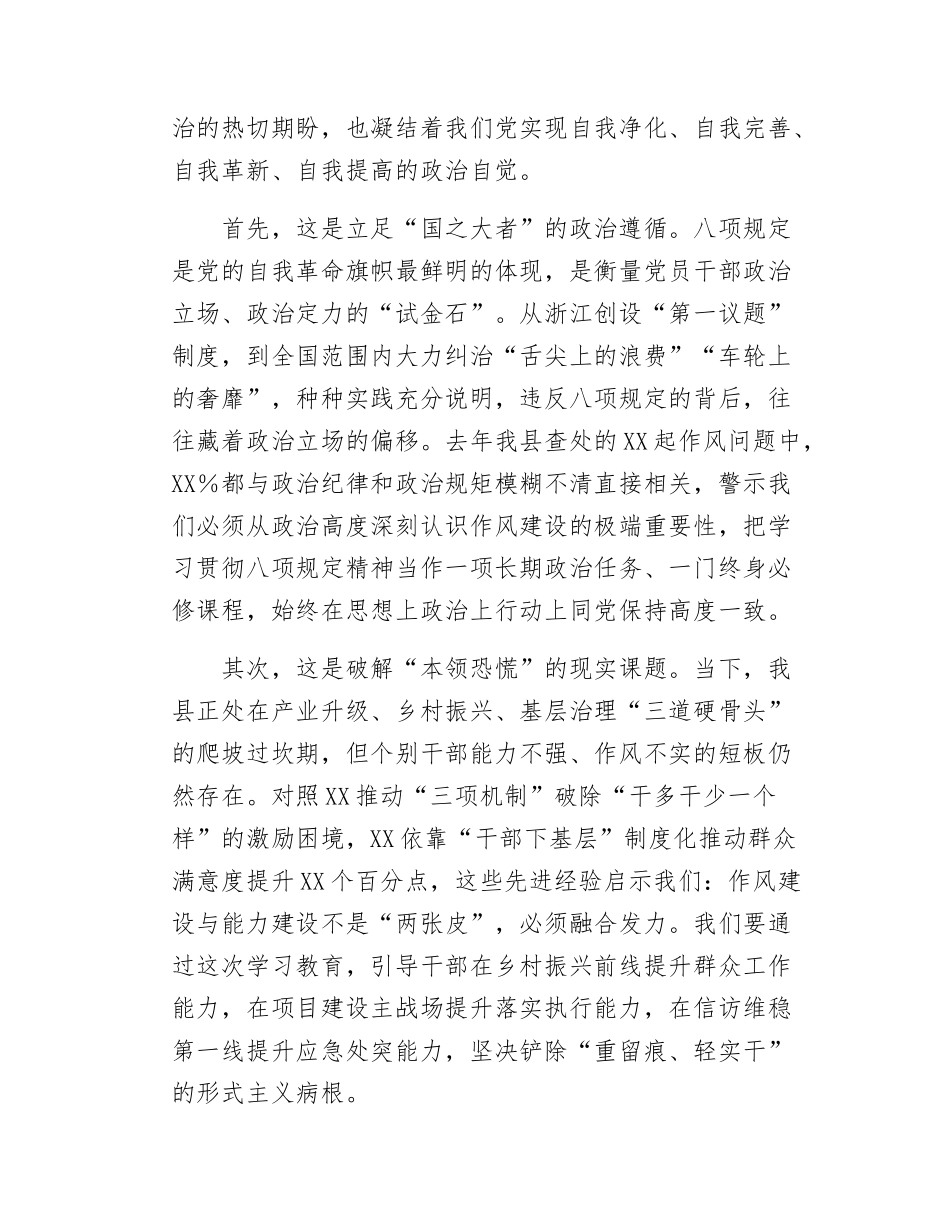 在2025年学习教育读书班开班式上的讲话同志们:今天,我们齐聚一堂,隆重举行全县科级干部读书班开班式。举办这次读书班的根本目的,是全面掀起学习贯彻八项规定精神的热潮,深刻把握党的部署开展学习教育的重大意义与内在逻辑,进一步夯实思想根基、锤炼党性修养,持续巩固和拓展作风建设成果,努力以清新政风带动社风民风整体向好。正如,“中国共产党人依靠学习走到今天,也必然要依靠学习走向未来。”当前,正值全面贯彻党的二十大精神的关键之年,“十四五”进入收官阶段,“十五五”正加快谋篇布局,县域发展正处于提质跃升的攻坚期。在这样的重要时刻举办读书班,既是一次思想理论的“加压充电”,更是一场党风作风的“再检再修”。下面,我围绕学习贯彻中央八项规定精神,讲三点体会和要求:一、“一念之间”照彻初心,“一脉相承”校准方向八项规定,绝非八条纪律要求的简单罗列,而是我们党在新时代锻造优良作风的“时代标识”,是推进全面从严治党的“纲领性抓手”。它既承载着亿万人民对清廉政治的热切期盼,也凝结着我们党实现自我净化、自我完善、自我革新、自我提高的政治自觉。首先,这是立足“国之大者”的政治遵循。八项规定是党的自我革命旗帜最鲜明的体现,是衡量党员干部政治立场、政治定力的“试金石”。从浙江创设“第一议题”制度,到全国范围内大力纠治“舌尖上的浪费”“车轮上的奢靡”,种种实践充分说明,违反八项规定的背后,往往藏着政治立场的偏移。去年我县查处的XX起作风问题中,XX%都与政治纪律和政治规矩模糊不清直接相关,警示我们必须从政治高度深刻认识作风建设的极端重要性,把学习贯彻八项规定精神当作一项长期政治任务、一门终身必修课程,始终在思想上政治上行动上同党保持高度一致。其次,这是破解“本领恐慌”的现实课题。当下,我县正处在产业升级、乡村振兴、基层治理“三道硬骨头”的爬坡过坎期,但个别干部能力不强、作风不实的短板仍然存在。对照XX推动“三项机制”破除“干多干少一个样”的激励困境,XX依靠“干部下基层”制度化推动群众满意度提升XX个百分点,这些先进经验启示我们:作风建设与能力建设不是“两张皮”,必须融合发力。我们要通过这次学习教育,引导干部在乡村振兴前线提升群众工作能力,在项目建设主战场提升落实执行能力,在信访维稳第一线提升应急处突能力,坚决铲除“重留痕、轻实干”的形式主义病根。最后,这是回应“群众关切”的必然选择。从去年信访反映的问题看,全县通报的典型案例中,XX%涉及干部作风问题,群众对党风政风的关注度与期待值持续攀升。只有我们敢于刀刃向内、自我革命,以实实在在的整改成效赢得民心,才能筑牢党的执政根基。因此,我们决定在本次学习教育期间同步开展“三查三改”专项行动,整治不作为、慢作为、乱作为等群众反映强烈的行为,专项行动方案会后即印发执行,确保每项举措都对准靶心、落到实处,让群众看到变化、感受到温度。二、“一纸篇章”读出担当,“一念入心”化为实践一要坚持“三个维度”强学习。坚持原原本本学,精读《...关于全面从严治党论述摘编》,推动“日学一小时、周写一心得、月评一成效”制度落地生根,真正用党的创新理论武装头脑、指导实践。坚持对标先进学,从国家、省市先进典型中汲取精神养分,从本县反面案例中检视差距短板,坚持“吾日三省吾身”的自觉反思,推动思想提升、能力进阶。坚持学以致用学,围绕优化营商环境、基层减负等重点任务,推广“企业吹哨、部门报到”机制,在XX等乡镇试点开展“无会周”“无扰企日”,组织农业干部下沉田间地头,推进“问题-对策-责任”三张清单闭环管理机制,让学习成果真正转化为改革创新的实践力和执行力。二要突出“三个导向”抓落实。坚持目标导向,推动作风建设纳入乡镇和单位年度考核硬性指标,试行“红黄蓝”三色预警机制和“末位约谈”制度,连续考核末位的单位列入专项巡察名单,形成倒逼整改闭环链条。坚持问题导向,聚焦“指尖上的形式主义”,建立微信工作群备案制度,纪检监察部门开展定期抽查和明察暗访,建立“政治体检”问题台账,重点整治“调研作秀”“落实空转”“言行背离”等...