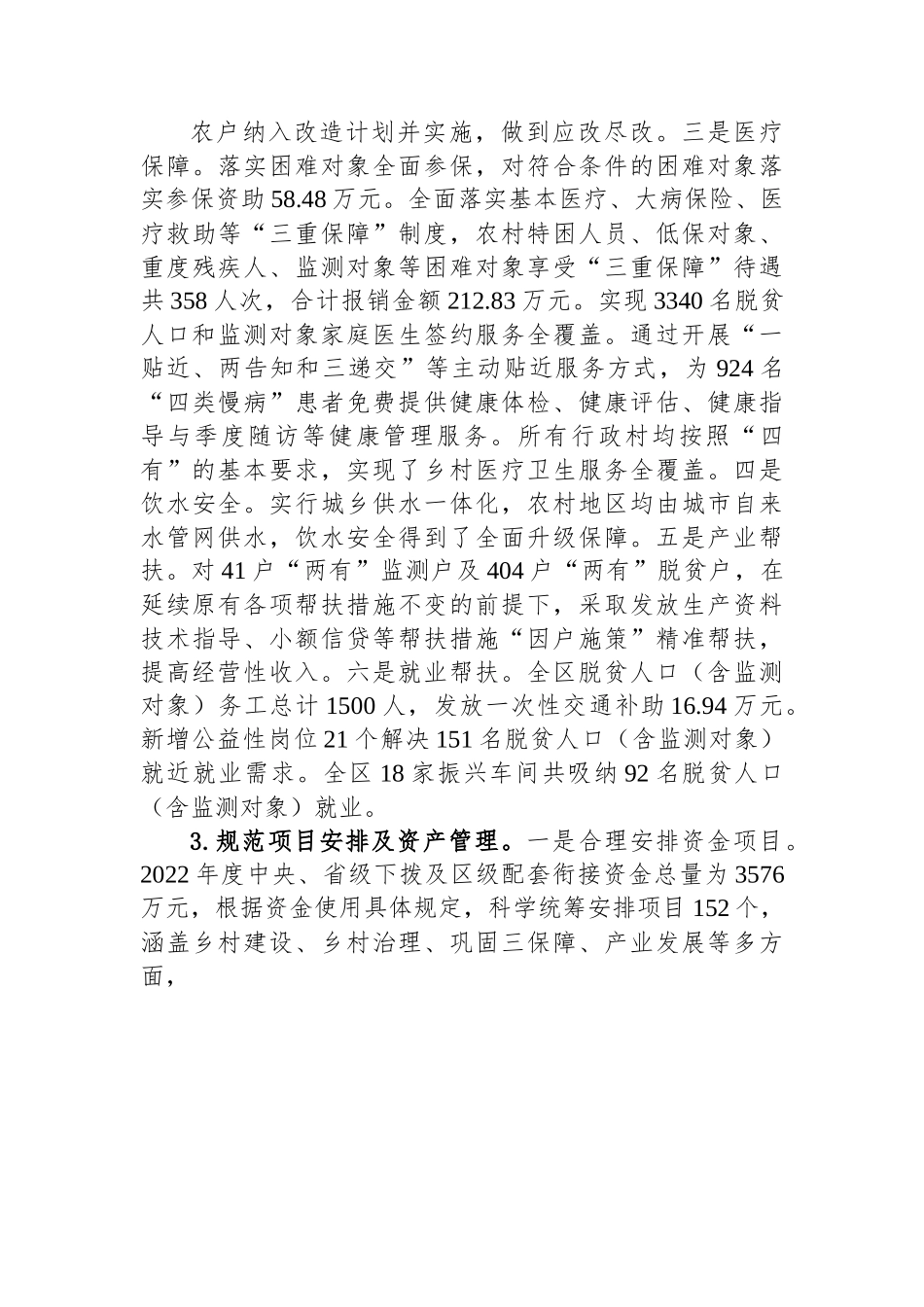 区乡村振兴局2022年工作总结及2023年工作计划2022年是巩固脱贫攻坚成果与乡村振兴有效衔接的第二年,XX区按照中央、省、市部署安排,认真落实中央一号文件重要指示精神,牢牢守住不发生规模性返贫的底线突出年度性任务、针对性举措、实效性导向,充分发挥农村基层党组织领导作用,扎实有序做好乡村发展、乡村建设、乡村治理重点工作,巩固脱贫攻坚成果与乡村振兴有效衔接取得新进展。现将有关情况汇报如下:一、基本情况XX区是常德市的中心城区,全区有3个乡镇36个村(社)承担有巩固脱贫攻坚成果任务。其中,2个省级重点帮扶村,8个脱贫村,2个示范片区,6个省级示范村。截止11月底,全区一般脱贫户、监测户共1200户3340人,其中一般脱贫户(不包含监测户的脱贫户)1054户3041人监测户146户299人,其中已消除风险监测对象32户65人未消除风险监测对象114户234人。XX区两乡一镇共派驻15支工作队,36名驻村干部,另派出4支驻村工作队对口帮扶石门县的4个全省乡村振兴重点帮扶村(壶瓶山镇长岭村、黄莲河村、南坪河社区、神景洞村)。二、2022年度工作完成情况1.筑牢返贫致贫防线。一是精准识别。通过开展“一户一画像”对全区农村人口进行全方位摸排,按照把每户基本情况“画清”、收支细节“画透”、主要困难“画准”的具体要求,逐户分析研判。同时通过省平台预警、行业部门数据共享和干部走访排查等途径,对重点对象开展摸排,确保应纳尽纳,防止体外循环。全区监测对象共146户299人,其中2022年识别监测对象44户119人。二是精准帮扶。通过因户施策“一户一故事”对所有监测帮扶对象实施精准帮扶,坚持缺什么补什么,确保应帮尽帮同时强化农村低收入人口帮扶,对农村特困对象259人、低保对象1143人做到了应保尽保、应救尽救。三是稳收增收。2022年监测对象、脱贫户人均纯收入均实现了稳定增长。2.夯实各项基础保障。一是教育保障。严格落实控辍保学工作,确保义务教育阶段适龄儿童少年无失学辍学情况,对3名符合送教条件的适龄儿童少年开展送教上门工作。全面落实各项资助政策,对脱贫户、监测对象区内、省外义务教育阶段学生进行财政兜底资助,对区外省内义务教育阶段学生的就读学校及时发函告知。2021年秋季共资助义务教育阶段“五类”对象学生970人50.6125万元,雨露计划学生79人11.85万元;2022年春季共资助义务教育阶段“五类”对象学生1015人52.9625万元,雨露计划学生78人11.7万元。二是住房保障。按照“危房不住人,人不住危房”的总体原则,结合居民自建房安全专项整治工作组织专业力量,对脱贫户、监测户、低保户等困难群体的住房进行了全面摸排鉴定并实行动态监测。及时将符合危房改造条件的16户农户纳入改造计划并实施,做到应改尽改。三是医疗保障。落实困难对象全面参保,对符合条件的困难对象落实参保资助58.48万元。全面落实基本医疗、大病保险、医疗救助等“三重保障”制度,农村特困人员、低保对象、重度残疾人、监测对象等困难对象享受“三重保障”待遇共358人次,合计报销金额212.83万元。实现3340名脱贫人口和监测对象家庭医生签约服务全覆盖。通过开展“一贴近、两告知和三递交”等主动贴近服务方式,为924名“四类慢病”患者免费提供健康体检、健康评估、健康指导与季度随访等健康管理服务。所有行政村均按照“四有”的基本要求,实现了乡村医疗卫生服务全覆盖。四是饮水安全。实行城乡供水一体化,农村地区均由城市自来水管网供水,饮水安全得到了全面升级保障。五是产业帮扶。对41户“两有”监测户及404户“两有”脱贫户,在延续原有各项帮扶措施不变的前提下,采取发放生产资料技术指导、小额信贷等帮扶措施“因户施策”精准帮扶,提高经营性收入。六是就业帮扶。全区脱贫人口(含监测对象)务工总计1500人,发放一次性交通补助16.94万元。新增公益性岗位21个解决151名脱贫人口(含监测对象)就近就业需求。全区18家振兴车间共吸纳92名脱贫人口(含监测对象)就业。3.规范项目安排及资产管理。一是合理安排资金项目。2022年度中央、省级下拨及区级配套衔接资金总量为3576万元,根据资金使用具体规定,科学统筹安排项目152个,涵盖乡村建设、乡村治理、...