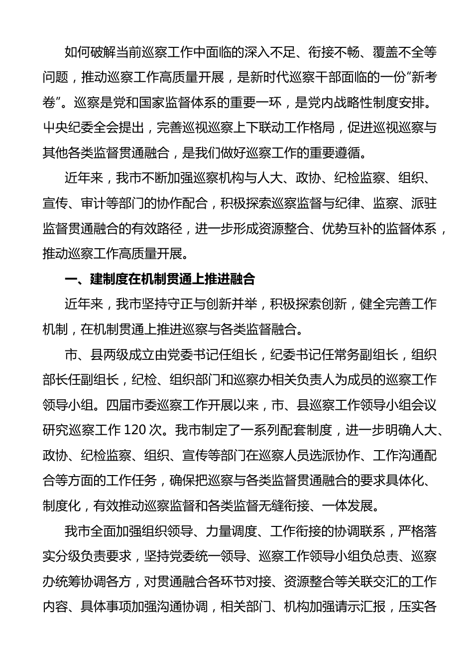 巡视工作、巡察工作素材汇编目录1・酒泉市持续加大力度促进巡视巡察与其他各类监督融合2.万银锋:党的十八大以来巡视制度创新发展与治理效能提升研究3.中国人民大学马克思主义学院吕瑶:党内巡视制度:概念溯源、功能优势及效能转化4.席新宇:对国有企业巡视工作的几点思考5.赵振宇:高质量实现巡视巡察全覆盖6.广西壮族自治区党委第六巡视组组长梁旭辉:坚持以人民为中心开展巡视工作7.马直辰:坚守政治定位深化上下联动发挥巡视综合监督作用8.2021年内蒙古自治区党委巡视工作综述9.刘诗林:论政治巡视:历史、内涵与运行11.10.七届湖南省委第九轮巡视整改进展情况综述焦作市委就《十二届焦作市委巡察工作规划》有关问题答记者问12.五届重庆市委巡视工作综述13.贵州推动巡视巡察工作高质量发展14.江西省委就《十五届江西省委巡视工作规划(试行)》答记者问15.2021年甘肃省巡视巡察工作综述16.邓明:深化政治巡视彰显利剑作用17.沈叶:实现巡视巡察高质量全覆盖目标任务18.财政部部长刘昆:统筹推进新时代巡视和干部监督工作服务保障财政事业高质量发展19.中国纪检监察学院科研部刘诗林:巡视场域中的全过程人民民主8820.国家电力投资集团巡视组组长王捍忠:以“三个必须”有效推进巡视工作21.徐德刚:屮共党内巡视制度建立的起因・屮央纪委国家监委巡视机构党委课题组:准确把握巡视机构党建工作特点规律推动党建工作高质量发展23.南方电网贵州电网有限责任公司陈举:贵州电网公司党委扎实做好巡视整改工作答好新时代巡察工作“考卷”我市持续加大力度促进巡视巡察与其他各类监督融合酒泉日报全媒体记者郭军(2022年3月23日)如何破解当前巡察工作中面临的深入不足、衔接不畅、覆盖不全等问题,推动巡察工作高质量开展,是新时代巡察干部面临的一份“新考卷”。巡察是党和国家监督体系的重要一环,是党内战略性制度安排。屮央纪委全会提出,完善巡视巡察上下联动工作格局,促进巡视巡察与其他各类监督贯通融合,是我们做好巡察工作的重要遵循。近年来,我市不断加强巡察机构与人大、政协、纪检监察、组织、宣传、审计等部门的协作配合,积极探索巡察监督与纪律、监察、派驻监督贯通融合的有效路径,进一步形成资源整合、优势互补的监督体系,推动巡察工作高质量开展。一、建制度在机制贯通上推进融合近年来,我市坚持守正与创新并举,积极探索创新,健全完善工作机制,在机制贯通上推进巡察与各类监督融合。市、县两级成立由党委书记任组长,纪委书记任常务副组长,组织部长任副组长,纪检、组织部门和巡察办相关负责人为成员的巡察工作领导小组。四届市委巡察工作开展以来,市、县巡察工作领导小组会议研究巡察工作120次。我市制定了一系列配套制度,进一步明确人大、政协、纪检监察、组织、宣传等部门在巡察人员选派协作、工作沟通配合等方面的工作任务,确保把巡察与各类监督贯通融合的要求具体化、制度化,有效推动巡察监督和各类监督无缝衔接、一体发展。我市全面加强组织领导、力量调度、工作衔接的协调联系,严格落实分级负责要求,坚持党委统一领导、巡察工作领导小组负总责、巡察办统筹协调各方,对贯通融合各环节对接、资源整合等关联交汇的工作内容、具体事项加强沟通协调,相关部门、机构加强请示汇报,压实各方责任,形成监督链条。二、促互通在监督协作上推进融合市、县两级巡察工作领导小组积极发挥协调员职能,统筹监督力量,推动巡察监督与纪律监督、监察监督、派驻监督同向发力。至目前,市、县共选派纪委监委机关干部、乡镇纪委专干356名分批次参与市、县巡察工作。组织部门积极抽调市直部门单位优秀年轻干部参与巡察,并组织选人用人专项检查组,支持配合市委巡察工作。宣传部门组成专项检查组,同步开展意识形态责任制落实情况专项检查。财政、审计等部门每轮巡察选派2名专业干部,根据巡察组工作需要,机动配合巡察工作。市、县两级巡察工作领导小组全面征求相关部门意见建议,向市委巡察组提供纪委监委机关日常监督中掌握和反映集中的问题及廉政风险点、信访受理等情况,针对性开展监督,为巡察组进驻当好“前哨”。坚持审计先行、巡察跟进的工作思路,将...