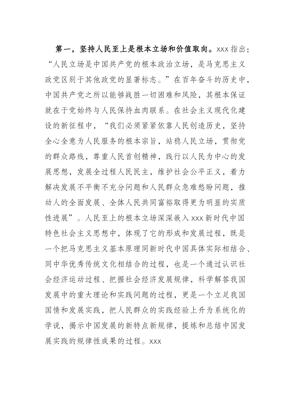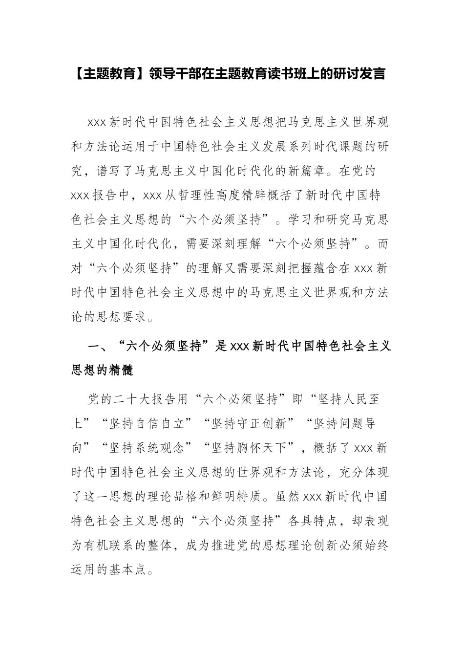【主题教育】领导干部在主题教育读书班上的研讨发言xxx新时代中国特色社会主义思想把马克思主义世界观和方法论运用于中国特色社会主义发展系列时代课题的研究,谱写了马克思主义中国化时代化的新篇章。在党的xxx报告中,xxx从哲理性高度精辟概括了新时代中国特色社会主义思想的“六个必须坚持”。学习和研究马克思主义中国化时代化,需要深刻理解“六个必须坚持”。而对“六个必须坚持”的理解又需要深刻把握蕴含在xxx新时代中国特色社会主义思想中的马克思主义世界观和方法论的思想要求。一、“六个必须坚持”是xxx新时代中国特色社会主义思想的精髓党的二十大报告用“六个必须坚持”即“坚持人民至上”“坚持自信自立”“坚持守正创新”“坚持问题导向”“坚持系统观念”“坚持胸怀天下”,概括了xxx新时代中国特色社会主义思想的世界观和方法论,充分体现了这一思想的理论品格和鲜明特质。虽然xxx新时代中国特色社会主义思想的“六个必须坚持”各具特点,却表现为有机联系的整体,成为推进党的思想理论创新必须始终运用的基本点。第一,坚持人民至上是根本立场和价值取向。xxx指出:“人民立场是中国共产党的根本政治立场,是马克思主义政党区别于其他政党的显著标志。”在百年奋斗的历史中,中国共产党之所以能够战胜一切困难和风险,其根本保证就在于党始终与人民保持血肉联系。在社会主义现代化建设的新征程中,“我们必须紧紧依靠人民创造历史,坚持全心全意为人民服务的根本宗旨,站稳人民立场,贯彻党的群众路线,尊重人民首创精神,践行以人民为中心的发展思想,发展全过程人民民主,维护社会公平正义,着力解决发展不平衡不充分问题和人民群众急难愁盼问题,推动人的全面发展、全体人民共同富裕取得更为明显的实质性进展”。人民至上的根本立场深深嵌入xxx新时代中国特色社会主义思想中,体现了它的形成和发展过程,既是一个把马克思主义基本原理同新时代中国具体实际相结合、同中华优秀传统文化相结合的过程,也是一个通过认识社会经济运动过程、把握社会经济发展规律,科学解答我国发展中的重大理论和实践问题的过程,更是一个立足我国国情和发展实践,把人民群众的实践经验上升为系统化的学说,揭示中国发展的新特点新规律,提炼和总结中国发展实践的规律性成果的过程。xxx新时代中国特色社会主义思想“站稳人民立场、把握人民愿望、尊重人民创造、集中人民智慧”,成为“人民所喜爱、所认同、所拥有的理论”,也“成为指导人民认识世界和改造世界的强大思想武器”。第二,坚持自信自立是内在气质和精神品格。xxx指出:“当今世界,要说哪个政党、哪个国家、哪个民族能够自信的话,那中国共产党、中华人民共和国、中华民族是最有理由自信的。”自信自立融入中华民族精神之中,是中华民族之魂。同样,自信自立融入中国特色社会主义之中,是坚持和发展中国特色社会主义的重要精神支柱。以坚持和发展中国特色社会主义等系列时代课题为研究主题的xxx新时代中国特色社会主义思想,坚持对马克思主义的坚定信仰,从中国的基本国情出发,从新时代中国特色社会主义的实践出发,既虚心学习借鉴国外的有益经验,又勇于进行理论探索和创新,在科学解答重大时代课题中,提出了一系列原创性的治国理政新理念新思想新战略,形成了对中国特色社会主义的坚定信念。自信自立构成了xxx新时代中国特色社会主义思想的内在气质和创造精神。xxx强调:“党历来坚持独立自主开拓前进道路,坚持把国家和民族发展放在自己力量的基点上,坚持中国的事情必须由中国人民自己作主张、自己来处理。……只要我们坚持独立自主、自力更生,既虚心学习借鉴国外的有益经验,又坚定民族自尊心和自信心,不信邪、不怕压,就一定能够把中国发展进步的命运始终牢牢掌握在自己手中。”把国家和民族发展放在自己力量的基点上、把中国发展进步的命运牢牢掌握在自己手中,是xxx新时代中国特色社会主义思想体现“自信自立”精神品格的重要基点。第三,坚持守正创新是思想方法和内在要求。守正创新是坚持和发展马克思主义、开创21世纪马克思主义新境界的本质要求。“守正”就是守“马克思主义立场观点方法”之正,守...