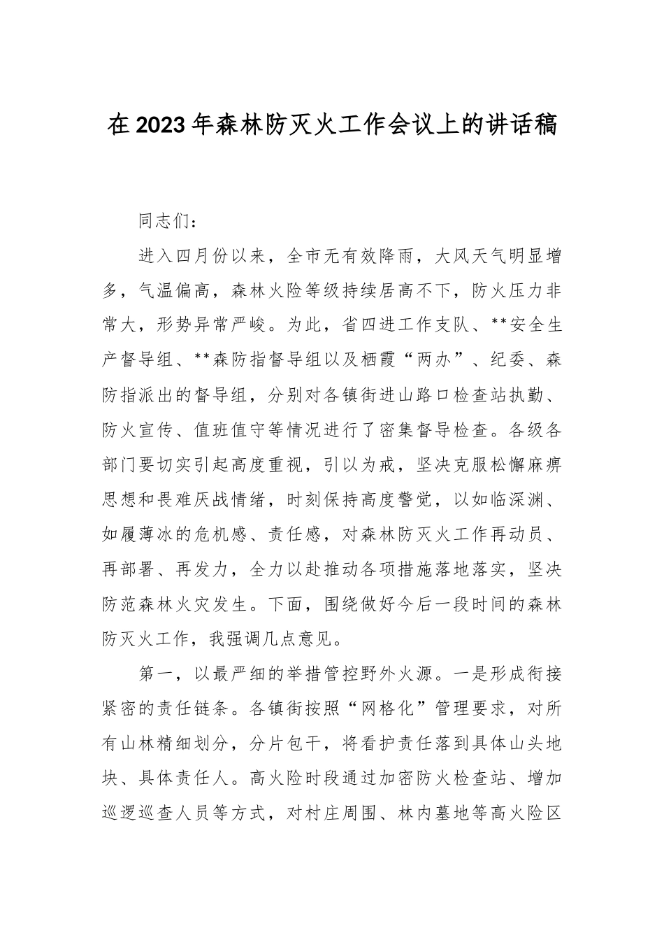 在2023年森林防灭火工作会议上的讲话稿同志们:进入四月份以来,全市无有效降雨,大风天气明显增多,气温偏高,森林火险等级持续居高不下,防火压力非常大,形势异常严峻。为此,省四进工作支队、**安全生产督导组、**森防指督导组以及栖霞“两办”、纪委、森防指派出的督导组,分别对各镇街进山路口检查站执勤、防火宣传、值班值守等情况进行了密集督导检查。各级各部门要切实引起高度重视,引以为戒,坚决克服松懈麻痹思想和畏难厌战情绪,时刻保持高度警觉,以如临深渊、如履薄冰的危机感、责任感,对森林防灭火工作再动员、再部署、再发力,全力以赴推动各项措施落地落实,坚决防范森林火灾发生。下面,围绕做好今后一段时间的森林防灭火工作,我强调几点意见。第一,以最严细的举措管控野外火源。一是形成衔接紧密的责任链条。各镇街按照“网格化”管理要求,对所有山林精细划分,分片包干,将看护责任落到具体山头地块、具体责任人。高火险时段通过加密防火检查站、增加巡逻巡查人员等方式,对村庄周围、林内墓地等高火险区域紧盯死守、严管严控,必要时对**、**、**等重点林区,依照有关规定实行封闭管理。特别是发布森林火险橙色、红色预警时,所有乡镇机关干部、农村党员要全员上岗,开展巡逻检查,坚决消除一切火灾隐患。包帮镇街的市直部门和单位周六、周日及节假日要安排足够人员参与防火,与镇村干部一样落实专岗专责。二是发挥好检查站火种收缴作用。一方面要进一步科学合理地规划设置检查站和卡口,所有林区必须做到全覆盖。另一方面挑选责任心强的人员值守,早晨六点前上岗,晚上七点撤岗,确保对进山人员登记到位、宣传到位、火种收缴到位。所有检查站必须拉起警戒线,配齐值班桌椅、进山人员登记簿、手电筒、金属探测仪和防火标识以及移动喇叭等设备,配备的探测、宣传设备要确保好用。所有参与防火人员坚决禁止值守时间野外吸烟切实起到模范表率作用。三是加强对特殊群体的管控。要及时更新森林防火18本基础台账,对“烧七连灾”“痴呆傻”、牲畜养殖户、吸烟人员等特殊群体的底数再进行摸排,真正做到人员明、底子清,届时安排专人跟踪提醒、落实监管措施。要特别加强林区施工企业工作人员的管理严防违规操作、野外吸烟引发森林火灾。要对情绪不稳定有报复倾向人员实行严盯严控,坚决防范人为纵火行为。四是持续开展森林火灾隐患排查整治。森防指要继续组织开展无死角、全覆盖的森林火灾隐患排查整治活动,尤其要抓好火灾易发林区、危险品仓库、林区重点目标的排查摸底工作,对排查出的问题隐患建立工作台账,落实具体整改措施、具体责任人,限期整改到位。要切实加强林区输配电设施的火灾隐患排查整治,供电公司要对产权范围内的供电线路进行再排查、再整治,坚决清除事故隐患。各镇街要积极配合供电公司做好隐患整改工作,确保顺利推进;要安排专人督促指导各风电企业认真开展隐患排查整治工作;要对供电公司产权范围外的林区及周边通讯铁塔、矿山、养殖场、饭店、住户等经营单位和个人使用的供电线路进行隐患排查整治,供电公司要安排专业人员予以配合,全面排查整改到位,彻底消除可能引发森林火灾的各类隐患。五是深入开展打击野外用火专项行动。各镇街、公安部门、自然资源部门要密切配合,对违法野外用火行为始终保持零容忍的高压态势,联合开展专项行动,从严打击野外违法违规用火行为,做到“见烟就查、见火就罚、成灾就抓”,在顶额处罚的同时,一律在电视台曝光。第二,以最密集的宣传营造浓厚的防火氛围。各级各部门要继续下大力气强化森林防火宣传,持续营造全民参与防火的强大氛围,真正做到家喻户晓、入脑入心。各镇街要发挥好村大喇叭、移动喇叭和宣传巡逻车的作用,每天早中晚开展密集的宣传;对所有已经破损褪色的标语、横幅、警示牌和大型固定宣传碑全部进行更换;清明节前继续广泛发动镇村干部进村入户面对面开展宣传,一户不落发放《森林防火明白纸》。教体局要做好在校师生的森林防火安全教育工作,继续在中小学校开展“五个一”森林防火宣传教育活动。市融媒体中心、广电网络等新闻媒体要大力宣传禁火令,加大典型案例的报道力度,警示...