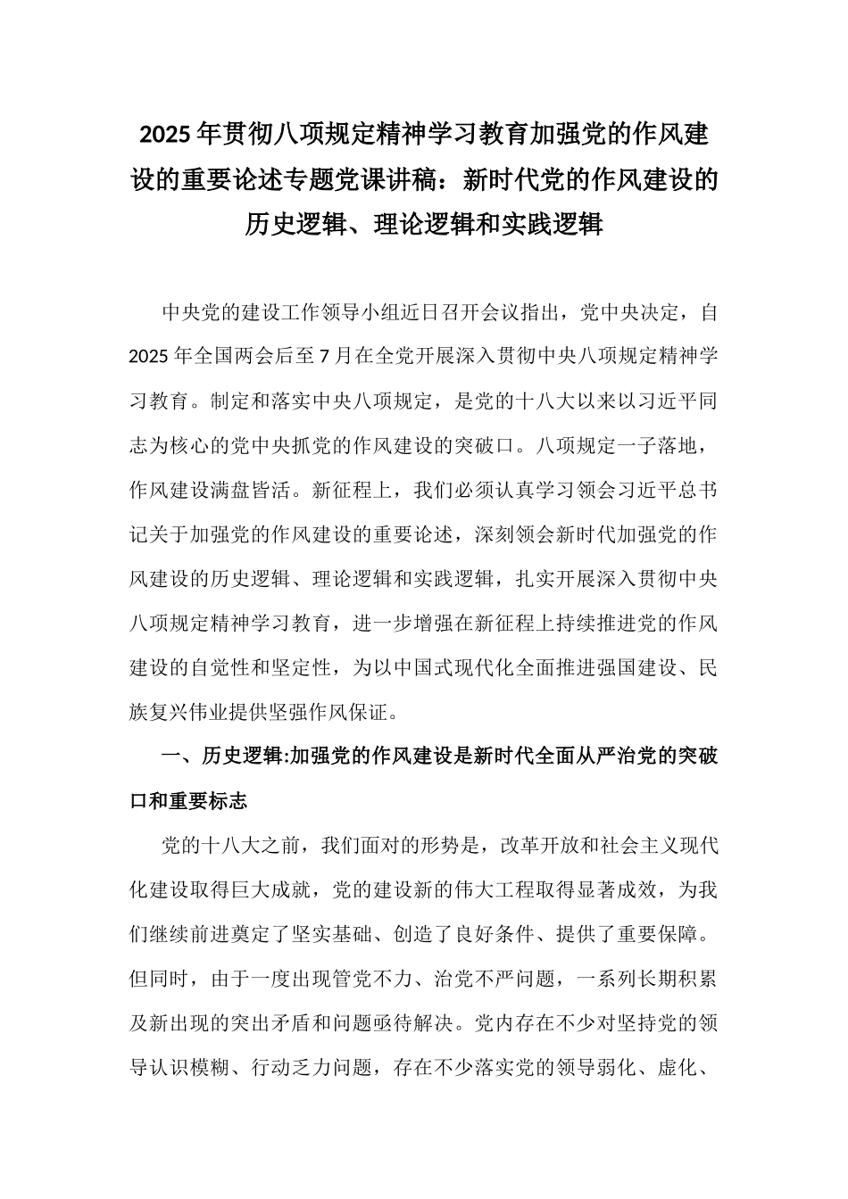 2025年贯彻xxxx精神学习教育加强党的作风建设的重要论述专题党课讲稿:新时代党的作风建设的历史逻辑、理论逻辑和实践逻辑中央党的建设工作领导小组近日召开会议指出,党中央决定,自2025年全国两会后至7月在全党开展深入贯彻中央xxxx精神学习教育。制定和落实中央xxxx,是党的十八大以来以习近平同志为核心的党中央抓党的作风建设的突破口。xxxx一子落地,作风建设满盘皆活。新征程上,我们必须认真学习领会习近平总书记关于加强党的作风建设的重要论述,深刻领会新时代加强党的作风建设的历史逻辑、理论逻辑和实践逻辑,扎实开展深入贯彻中央xxxx精神学习教育,进一步增强在新征程上持续推进党的作风建设的自觉性和坚定性,为以中国式现代化全面推进强国建设、民族复兴伟业提供坚强作风保证。一、历史逻辑:加强党的作风建设是新时代全面从严治党的突破口和重要标志党的十八大之前,我们面对的形势是,改革开放和社会主义现代化建设取得巨大成就,党的建设新的伟大工程取得显著成效,为我们继续前进奠定了坚实基础、创造了良好条件、提供了重要保障。但同时,由于一度出现管党不力、治党不严问题,一系列长期积累及新出现的突出矛盾和问题亟待解决。党内存在不少对坚持党的领导认识模糊、行动乏力问题,存在不少落实党的领导弱化、虚化、淡化问题,有些党员、干部政治信仰发生动摇,一些地方和部门形式主义、官僚主义、享乐主义和奢靡之风屡禁不止,特权思想和特权现象较为严重,一些贪腐问题触目惊心等。当时,党内和社会上不少人对党和国家前途忧心仲忡。面对这些问题,党的十八大以来,以习近平同志为核心的党中央坚持打铁必须自身硬,将全面从严治党纳入“四个全面”战略布局,作为新时代党的建设的鲜明主题,开启了百年大党推进党的自我革命的新征程。全面从严治党是一项系统性工程。面对党内存在的种种问题和弊端,该从哪儿抓起?如何解决“老虎吃天不知从哪儿下口”的问题?以习近平同志为核心的党中央经过深思熟虑,决定抓党的建设从抓党的作风建设切入起步,抓党的作风建设从制定落实中央xxxx这个小切口开局破题,解决了新形势下党的建设从哪儿抓起、抓什么、怎么抓的问题。2012年12月4日,中共中央政治局会议审议通过了《十八届中央政治局关于改进工作作风、密切联系群众的xxxx》,即中央xxxx。中央xxxx,短短600多字,却内涵丰富,从调查研究、会议活动、文件简报、出访活动、警卫工作、新闻报道、文稿发表、勤俭节约等8个方面对加强党的作风建设立下规矩,不搞四平八稳,不喊空洞口号,直面现实问题,提出具体要求。之后,以习近平同志为核心的党中央抓住党的作风建设这条主线,坚持以上率下、一以贯之、步步深入,坚持踏石留印、抓铁有痕,经常抓、深入抓、持久抓,持之以恒正风肃纪,以钉钉子精神纠治“四风”,坚决反对特权思想和特权现象,坚决整治群众身边的不正之风和腐败问题,推动全面从严治党不断向纵深发展。2017年10月27日,党的十九大闭幕第3天,习近平总书记主持召开十九届中央政治局第一次会议,审议《中共中央政治局贯彻落实中央xxxx的实施细则》,对贯彻执行中央xxxx、推进作风建设作出进一步规范、细化和完善。党的十九大之后,以习近平同志为核心的党中央针对新情况新问题,继续一以贯之贯彻落实中央xxxx及其实施细则精神,把力戒形式主义官僚主义、着力为基层减负作为作风建设的重要任务,推进党的作风建设不松劲、不停步、再出发。2022年10月25日,党的二十大闭幕第3天,习近平总书记主持召开二十届中央政治局第一次会议,重要议程之一仍然是审议《中共中央政治局贯彻落实中央xxxx实施细则》。党的二十大以来,以习近平同志为核心的党中央时刻保持解决大党独有难题的清醒和坚定,坚持不懈推进中央xxxx及其实施细则精神贯彻落实,驰而不息推进党的作风建设,推动百年大党在自我革命中不断焕发蓬勃生机。作风建设必须纠树结合,不仅要整饬歪风邪气,而且要树立新风正气,以好的作风振奋精神、激发斗志、树立形象、赢得民心。以习近平同志为核心的党中央坚持破立并举、激浊扬清,着眼于以...