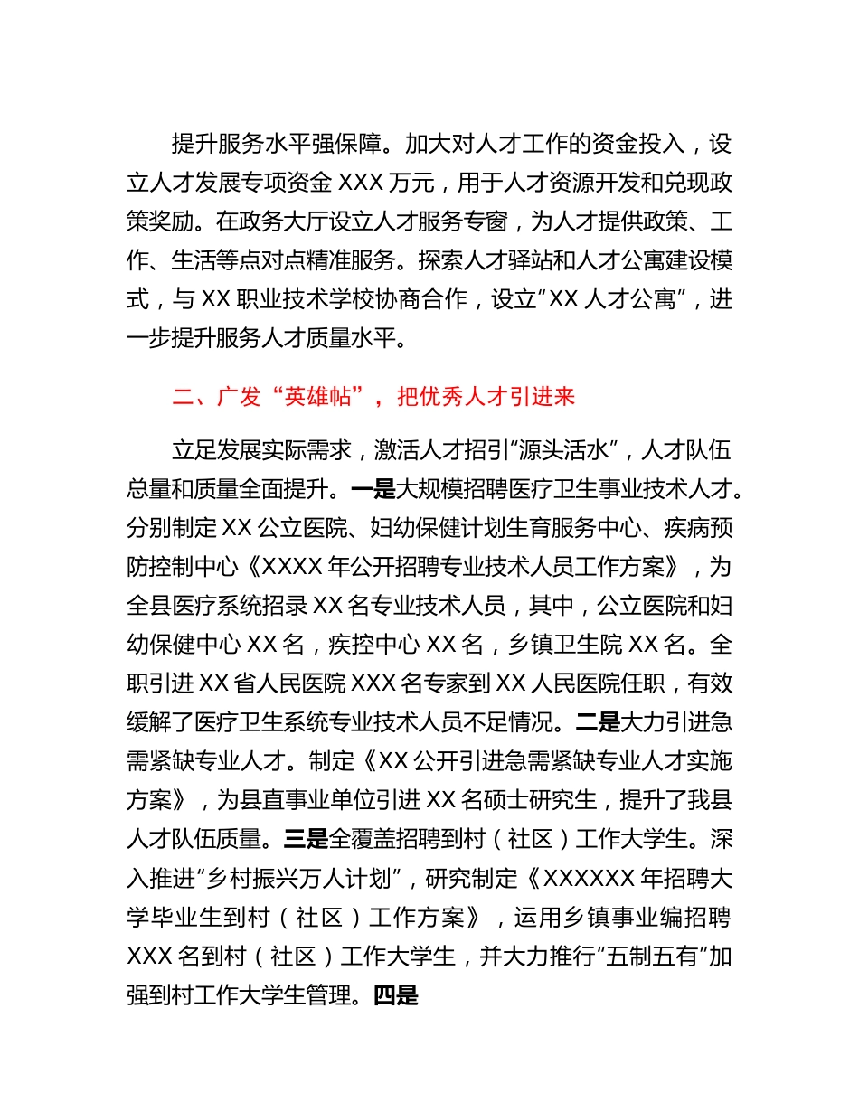 县委组织部经验交流发言:“四轮驱动”激发人才创新创造活力XX县委聚焦高质量发展,大力实施人才强县战略,强化“党管人才、多元引才、导向育才、省校合作”四轮驱动,构建人才发展“引育留用”全链条机制。一、种好“梧桐树”,把人才政策落下来健全完善党管人才工作格局,人才发展环境持续优化。一是坚持党管人才强引领。建立县委人才工作领导小组“定期议才”制度,专题研究人才工作。全面压实党委(党组)书记抓人才工作第一责任人责任,把人才工作纳入各级党组织书记年度考核范畴,形成了县委统一领导,组织部门牵头抓总,有关部门协同配合的人才工作格局。二是完善政策体系强支撑。围绕我县中心工作和人才需求,制定出台《XX关于加快建设人才强县创新高地人才新政十五条》等一系列人才政策,为引进各类急需紧缺人才开辟“绿色通道”,构建精准化、差异化的人才政策体系。三是提升服务水平强保障。加大对人才工作的资金投入,设立人才发展专项资金XXX万元,用于人才资源开发和兑现政策奖励。在政务大厅设立人才服务专窗,为人才提供政策、工作、生活等点对点精准服务。探索人才驿站和人才公寓建设模式,与XX职业技术学校协商合作,设立“XX人才公寓”,进一步提升服务人才质量水平。二、广发“英雄帖”,把优秀人才引进来立足发展实际需求,激活人才招引“源头活水”,人才队伍总量和质量全面提升。一是大规模招聘医疗卫生事业技术人才。分别制定XX公立医院、妇幼保健计划生育服务中心、疾病预防控制中心《XXXX年公开招聘专业技术人员工作方案》,为全县医疗系统招录XX名专业技术人员,其中,公立医院和妇幼保健中心XX名,疾控中心XX名,乡镇卫生院XX名。全职引进XX省人民医院XXX名专家到XX人民医院任职,有效缓解了医疗卫生系统专业技术人员不足情况。二是大力引进急需紧缺专业人才。制定《XX公开引进急需紧缺专业人才实施方案》,为县直事业单位引进XX名硕士研究生,提升了我县人才队伍质量。三是全覆盖招聘到村(社区)工作大学生。深入推进“乡村振兴万人计划”,研究制定《XXXXXX年招聘大学毕业生到村(社区)工作方案》,运用乡镇事业编招聘XXX名到村(社区)工作大学生,并大力推行“五制五有”加强到村工作大学生管理。四是广开渠道柔性引进人才。采取顾问指导、短期兼职、候鸟服务等形式,建立名师名医名家工作室、教授工作站等,实施“人才飞地”计划,多渠道柔性引进高层次人才。柔性引进XX到XX医疗集团挂职,柔性引进专家XX定期到XX中医院坐诊。举办“塔乡英才”座谈会、“应商应才支持家乡发展”等活动,积极引导和鼓励XX籍优秀人才回流,带着项目、资金、技术反哺家乡。三、搭好“大舞台”,让人才培育强起来搭建培育平台,建好“三支队伍”,让优秀人才在实践中磨炼成长。一是组建党校“兼职讲师”队伍。拓宽师资渠道,将各领域优秀人才纳入县乡党校兼职队伍,在党校专职讲师的基础上,通过“X名到村工作大学生+X名选调生+X名乡土讲师”方式联合组队,目前共聘用兼职讲师XX名,培训党员干部XXXX名。二是组建阵地“讲解员”队伍。为推动年轻干部实现联享联育,建立红色阵地、调研基地“讲解员”队伍,共XX名。组织讲解员于X月XX日赴XX参加为期一周的师资内训培训班,举办讲解员人才大赛,提素质、展风采。三是组建政策“宣传员”队伍。从各领域选拔优秀年轻干部,组建“党的XX大精神”宣讲团,通过入户走访、广场宣传、线上互动学等形式开展宣传,目前已开展XX期,培养广大年轻干部练就本领。四、深耕“合作田”,让项目效能提起来以建设“XX大基地”为抓手,持续拓展深化省校合作,实现产业链、人才链、创新链融合发展。一是聚焦干部培训。与清华大学继续教育学院共建“转型发展大讲堂”,邀请清华大学教授重点围绕XX文旅、陶瓷、农业等产业发展方面开展咨询服务、课题研讨以及专题讲座,通过线上线下已培训X期,不断提升全县干部能力和水平。二是深化合作项目。共签约省校合作项目XX个,建设大学生实习实训基地X个、高校科研平台延伸基地X个、高校科技成果转化基地X个、智库合作基地X个、技能服务人才基地X个、高校优质生源基地XX个。与清华大学建筑学院签...