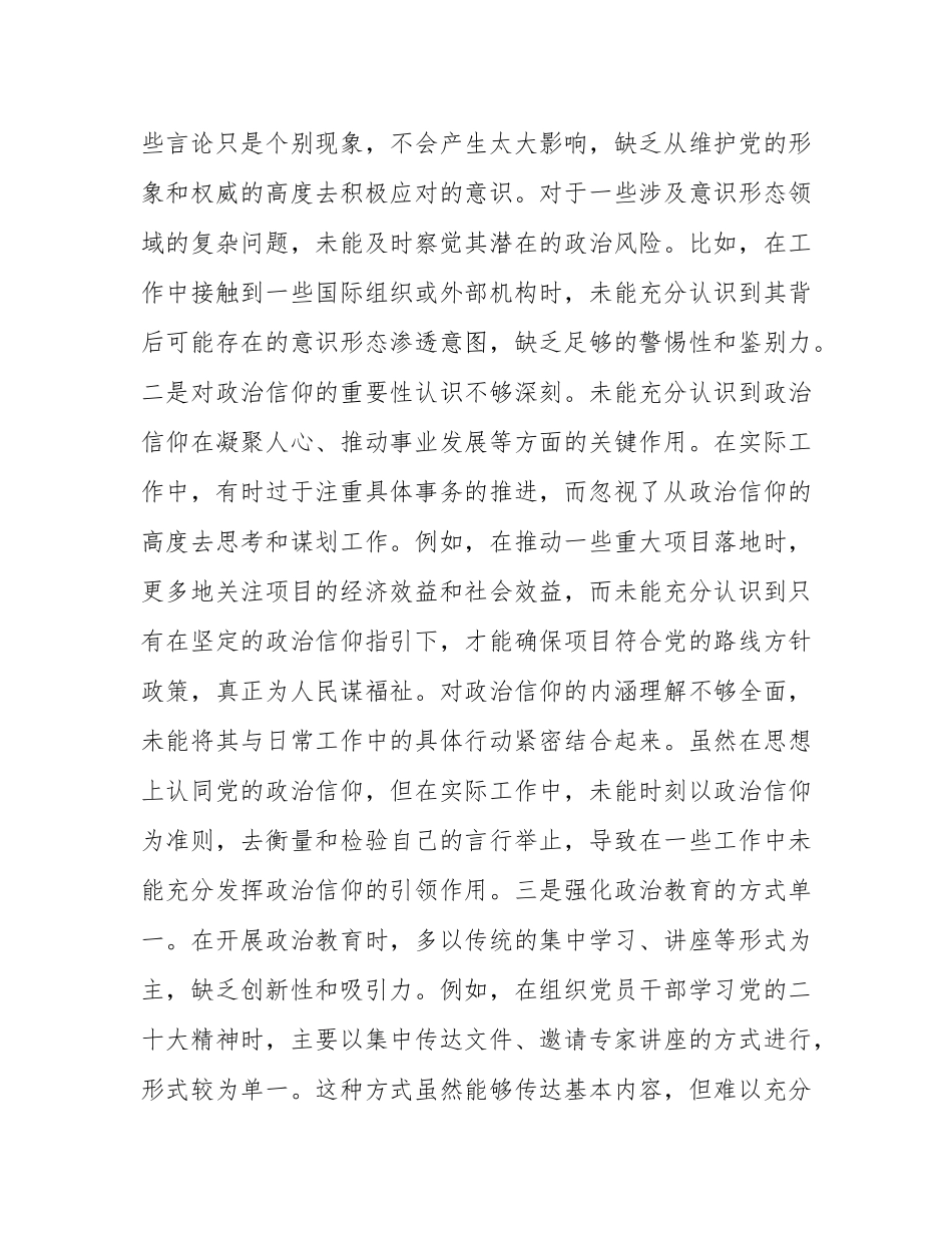 市直单位领导干部2024年民主生活会、组织生活会对照检查材料(四个带头)市直单位领导干部2024年民主生活会、组织生活会对照检查材料(四个带头)根据市直机关工委《关于召开2024年度民主生活会的通知》有关要求和局党组相关工作部署,我紧紧围绕本次民主生活会主题,结合自身实际情况,认真对照“四个带头”,全面深入查摆了自身存在的突出问题,认真分析了问题产生的原因,逐项明确了下一步整改措施。按照会议安排,现将个人对照检查情况汇报如下。一、存在的主要问题(一)在带头严守政治纪律和政治规矩,维护党的团结统一方面。一是政治敏锐性不够强。在日常工作中,虽然能够坚决拥护党的路线方针政策,但在面对一些复杂的网络舆情和社会思潮时,政治敏锐性还不够高。例如,对于一些网络上出现的对党的政策的片面解读或不实言论,虽然能够保持清醒的头脑不被误导,但在主动抵制和纠正方面做得不够。有时认为这些言论只是个别现象,不会产生太大影响,缺乏从维护党的形象和权威的高度去积极应对的意识。对于一些涉及意识形态领域的复杂问题,未能及时察觉其潜在的政治风险。比如,在工作中接触到一些国际组织或外部机构时,未能充分认识到其背后可能存在的意识形态渗透意图,缺乏足够的警惕性和鉴别力。二是对政治信仰的重要性认识不够深刻。未能充分认识到政治信仰在凝聚人心、推动事业发展等方面的关键作用。在实际工作中,有时过于注重具体事务的推进,而忽视了从政治信仰的高度去思考和谋划工作。例如,在推动一些重大项目落地时,更多地关注项目的经济效益和社会效益,而未能充分认识到只有在坚定的政治信仰指引下,才能确保项目符合党的路线方针政策,真正为人民谋福祉。对政治信仰的内涵理解不够全面,未能将其与日常工作中的具体行动紧密结合起来。虽然在思想上认同党的政治信仰,但在实际工作中,未能时刻以政治信仰为准则,去衡量和检验自己的言行举止,导致在一些工作中未能充分发挥政治信仰的引领作用。三是强化政治教育的方式单一。在开展政治教育时,多以传统的集中学习、讲座等形式为主,缺乏创新性和吸引力。例如,在组织党员干部学习党的二十大精神时,主要以集中传达文件、邀请专家讲座的方式进行,形式较为单一。这种方式虽然能够传达基本内容,但难以充分调动党员干部的学习积极性和主动性,导致一些党员干部对学习内容的理解不够深入,难以真正入脑入心。对于不同层次、不同岗位的党员干部,未能充分考虑其个性化需求,缺乏针对性和差异化。比如,对于基层一线的党员干部,未能结合他们的实际工作,设计更具实践性和操作性的政治教育内容和形式,导致政治教育与实际工作脱节,难以取得良好的教育效果。(二)带头增强党性、严守纪律、砥砺作风方面。一是对“生活中有政治”的认识不够深刻,把握不够精准。未能充分认识到日常生活中的言行举止都与政治息息相关。在一些看似平常的生活场景中,缺乏从政治角度去思考和判断的意识。例如,在与家人、朋友聚会时,对一些涉及政治敏感话题的讨论,未能及时引导和纠正,认为这只是私人场合的随意聊天,而忽视了这些言论可能产生的不良影响。对一些看似小事的行为背后可能存在的政治影响缺乏敏感性。例如,在参加一些社会活动时,对于一些可能涉及政治立场或政治倾向的问题,未能时刻保持警惕,有时会不自觉地随波逐流,而未能从政治高度去审视自己的行为,导致在日常生活中未能时刻以政治标准严格要求自己。二是学用结合不够好。在学习新思想等党的创新理论时,存在理论学习与实际工作结合不够紧密的问题。虽然能够认真参加各类学习培训,系统学习理论知识,但在将所学理论运用到解决实际问题时,往往存在一定的困难。例如,在面对一些复杂的基层治理问题时,虽然知道理论中有相关的指导思想,但难以将其具体化、操作化,导致理论学习的成果未能有效转化为推动工作的实际成效。缺乏将理论学习与工作实践相结合的主动性和自觉性。在实际工作中,有时会因为工作任务繁重,而将理论学习放在次要位置,认为只要完成工作任务就行,而忽视了理论学习对提升工作能力的重要作用。这种学用脱节的现象,导致在工作中遇到新情...