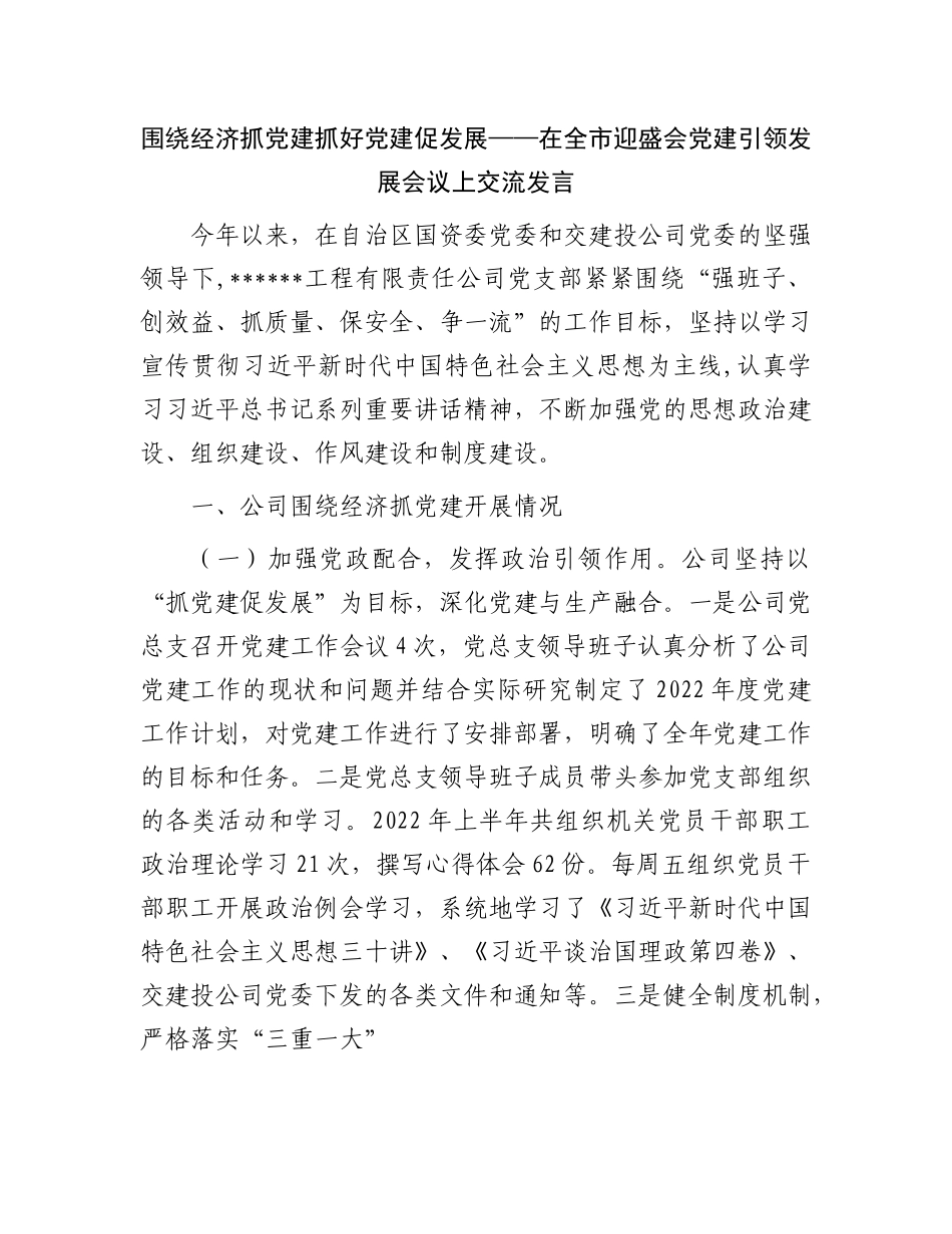 围绕经济抓党建抓好党建促发展——在全市迎盛会党建引领发展会议上交流发言今年以来,在自治区国资委党委和交建投公司党委的坚强领导下,******工程有限责任公司党支部紧紧围绕“强班子、创效益、抓质量、保安全、争一流”的工作目标,坚持以学习宣传贯彻习近平新时代中国特色社会主义思想为主线,认真学习习近平总书记系列重要讲话精神,不断加强党的思想政治建设、组织建设、作风建设和制度建设。一、公司围绕经济抓党建开展情况(一)加强党政配合,发挥政治引领作用。公司坚持以“抓党建促发展”为目标,深化党建与生产融合。一是公司党总支召开党建工作会议4次,党总支领导班子认真分析了公司党建工作的现状和问题并结合实际研究制定了2022年度党建工作计划,对党建工作进行了安排部署,明确了全年党建工作的目标和任务。二是党总支领导班子成员带头参加党支部组织的各类活动和学习。2022年上半年共组织机关党员干部职工政治理论学习21次,撰写心得体会62份。每周五组织党员干部职工开展政治例会学习,系统地学习了《习近平新时代中国特色社会主义思想三十讲》、《习近平谈治国理政第四卷》、交建投公司党委下发的各类文件和通知等。三是健全制度机制,严格落实“三重一大”集体决策制度,召开党支部委员会议4次,发挥党支部把方向、管大局、保落实作用。四是党政班子成员紧密团结,相互配合,互相沟通,利用各种会议开展谈心、座谈等活动,开展谈心谈话4次,谈话人数50人次。五是公司党总支按照“围绕发展抓党建、抓好党建促发展”的总体思路,坚持把党建工作融入企业发展的中心任务之中,定期按内容、范围进行党委公开。在工地项目部成立临时党支部,认真落实“三会一课”制度,定期召开支部会议,总结工作经验。(二)加强党员队伍建设,发挥先锋模范作用。一是通过党员大会和集中上党课,学习上级党委文件精神,进一步增强“四个意识”,坚定“四个自信”,做到“两个维护”,确保党中央各项决策部署在公司全面贯彻落实。二是在发展党员工作中,按照《党章》规定,严格履行入党手续,注重在改革和建设的实践中考察和识别干部,从生产一线选拔7人到中层领导领导岗位上来。三是严格履行党费收缴手续,把党费收缴作为增强党员党性观念的抓手,按月收取党费,做到使党员交纳党费有记录,有凭证。(三)加强政治思想建设,发挥组织引导作用。一是提升党员思想政治素养情况。深入党史学习教育常态化、制度化、深入贯彻落实党的十九届六中全会精神和习近平新时代中国特色社会主义思想,开展学习5次。二是开展“读总书记的书,读总书记读的书”活动4次,订购党建文汇8本,党课书籍10本。三是支部书记同落后党员结成对子,开展“一帮一”活动,促进后进党员思想转化,帮助后进党员查找落后原因,提出解决办法。四是组织开展了一系列“民族团结一家亲”活动。公司组织全体党员干部职工开展了以“传承·2022清明祭英烈”为主题的祭奠活动、在“五一”国际劳动节期间,公司组织机关领导干部对疆内的各施工项目部进行了慰问,同时开展“弘扬劳模精神,放飞青春梦想,做新时代奋进者”主题活动、公司开展了纪念”五四”运动暨“民族团结一家亲”活动,组织开展向“三股势力、两面人”发声亮剑活动,共计65人次。五是按照《自治区贯彻落实中央第六巡视组开展脱贫攻坚专项巡视反馈意见整改方案》的要求,公司深入学习了习近平总书记关于扶贫工作的重要论述,使公司全体党员干部职工进一步把思想统一到习近平总书记关于扶贫工作的重要论述精神上来。六是根据交建投公司下发的《关于开展自治区国资委系统2022年职业病防治宣传周活动的通知》文件精神,公司邀请专业人士开展了《职业病健康》知识讲座一次。(五)突出亮点抓宣传,发挥党建核心作用。公司“民族团结一家亲”结对子24户,通过微信公众号、结合实际开辟专栏专题,及时反映公司“民族团结一家亲”活动和民族团结进步创建示范工作动态、经验亮点,宣传公司涌现出的民族团结先进模范、先进事迹。通过媒体宣传、社会宣传、活动宣传等多种形式,加大力度,拓展载体,积极营造“民族团结一家亲”浓厚氛围。(六)以党建带团建,发挥党的组...
